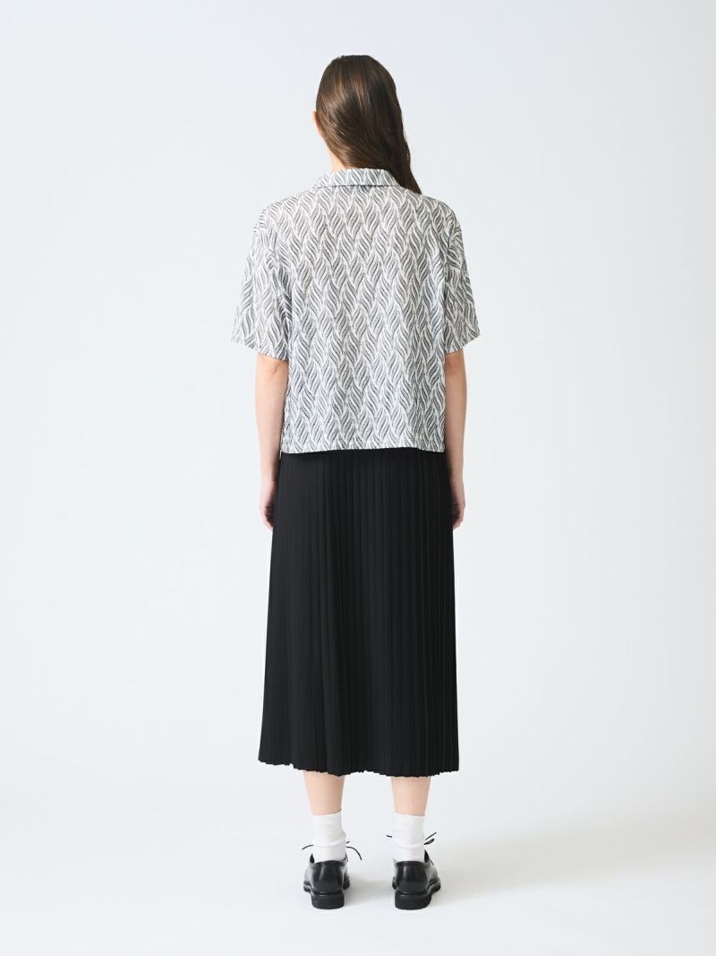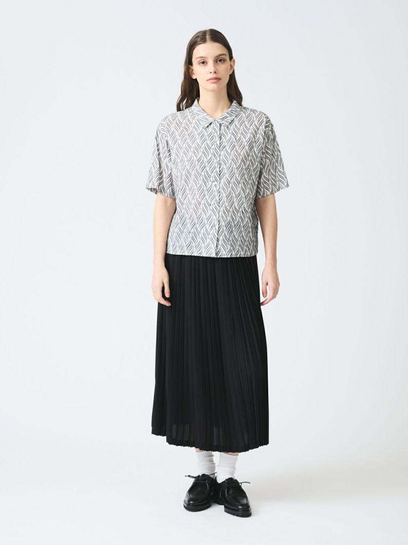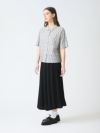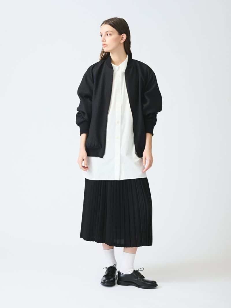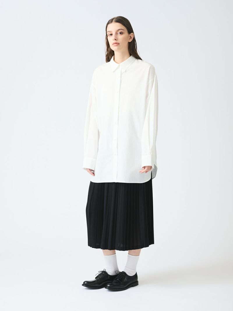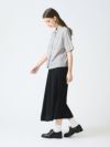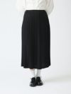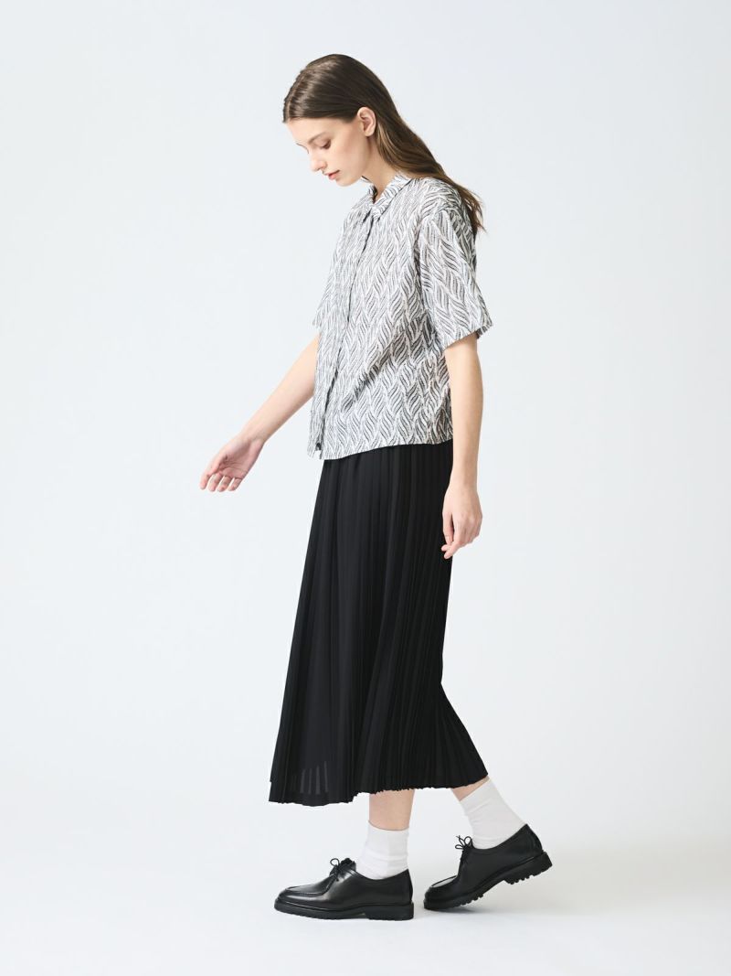 マットな表面感と上品な印象の薄手ジョーゼット素材を使用したプリーツスカートです。ダブルプリーツ加工で動くと生地の表情が綺麗です。見た目にはタイトなシルエットで広がりはなくスマートな印象。ウエストはリラックス感のあるゴム使用。膝下丈でソックスが見える丈感なので足元のオシャレを楽しんでいただけます。