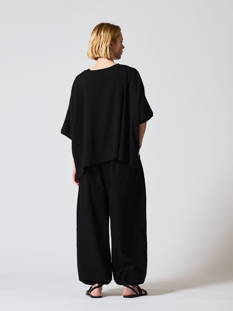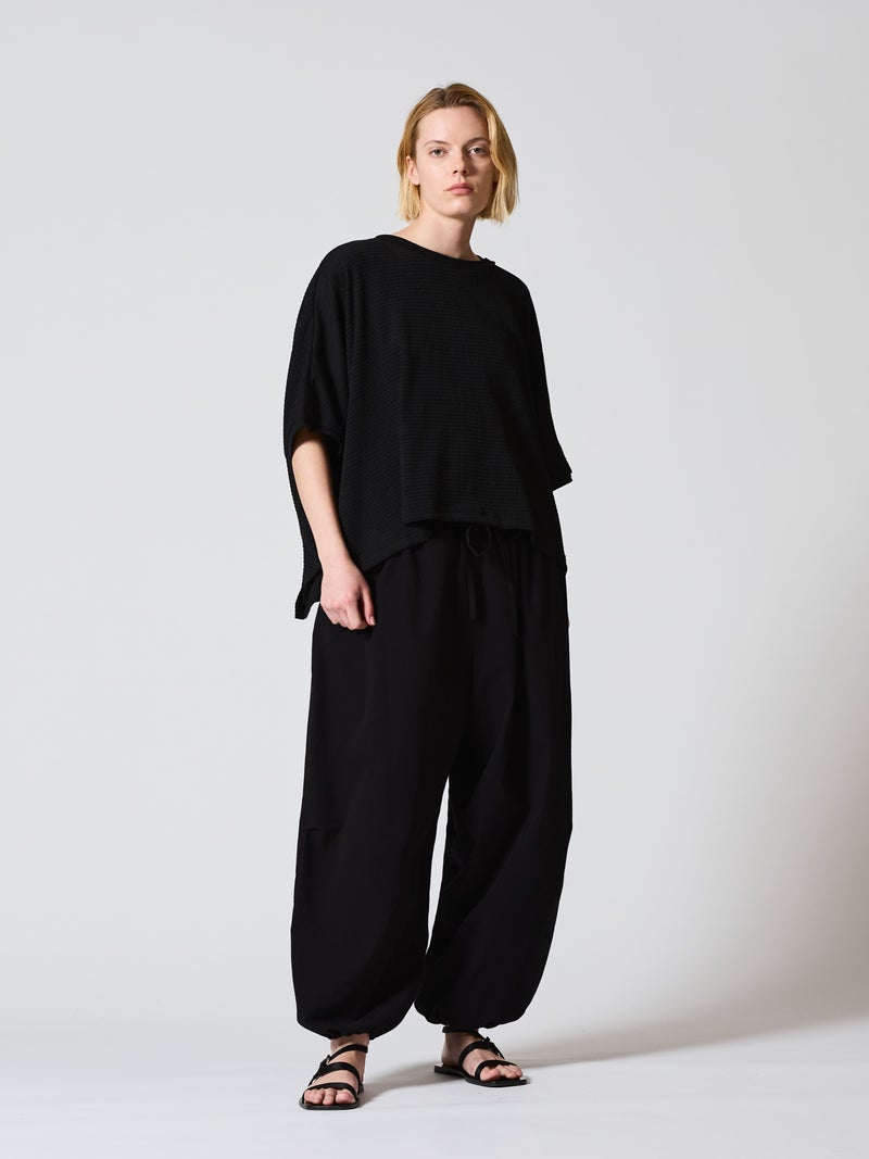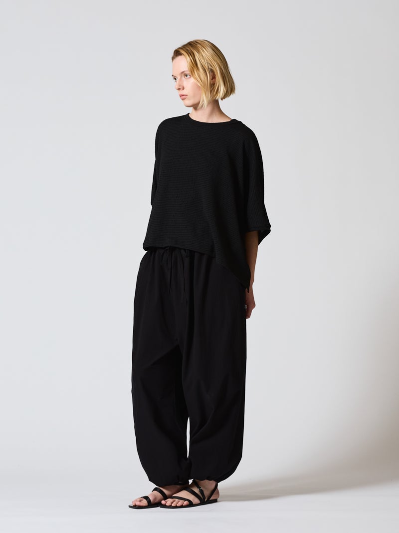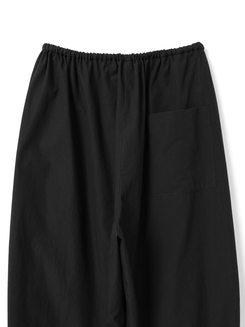 mizuiro ind人気のボトムアイテムがブラックのみの展開で再入荷しました。ボリューム感のあるデザインでカジュアルな着こなしを演出したドローストリングヘムボリュームパンツです。裾にはゴムが入っており丸みのある裾ラインを表現。ウエストはリラックス感のあるゴムに加え中紐付。サラッとした着心地のよいコットン生地を使用。1枚あると大変重宝できるボトムアイテムです。