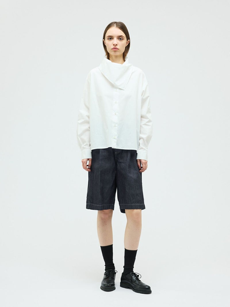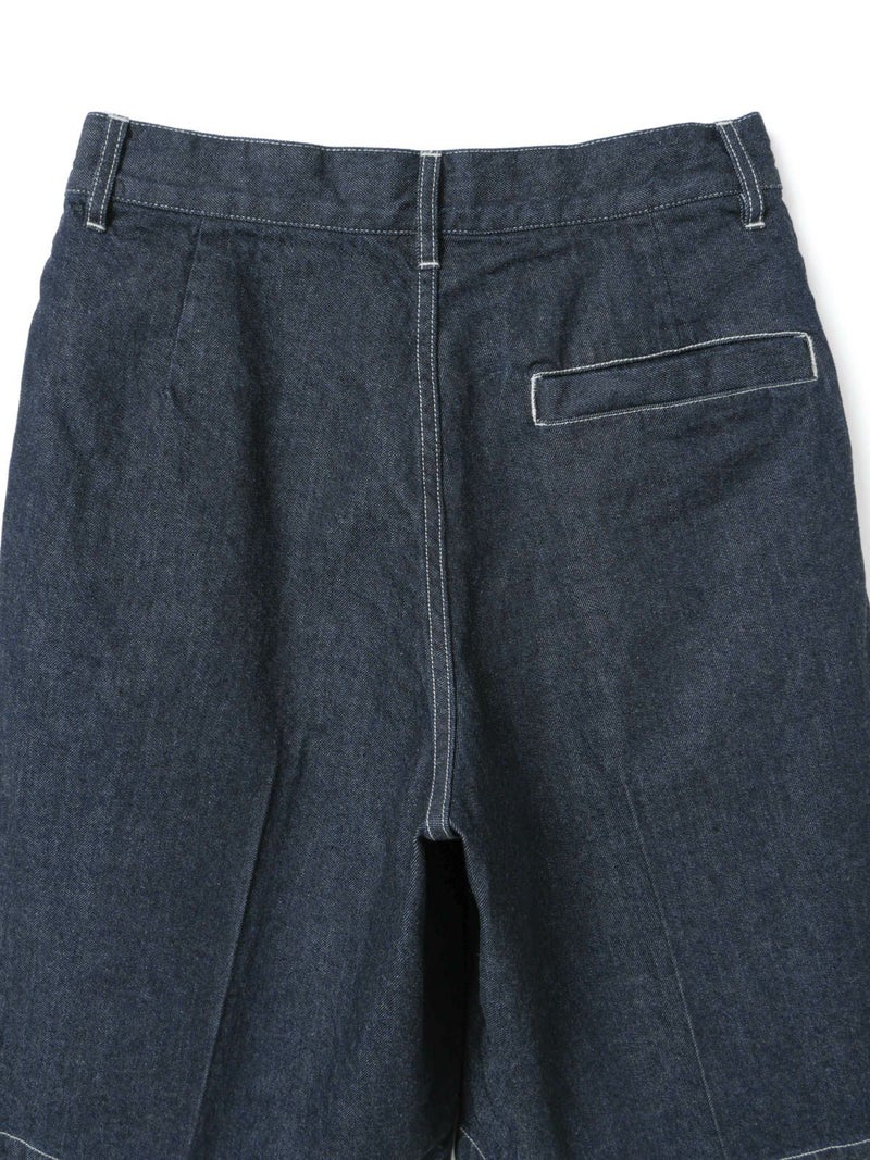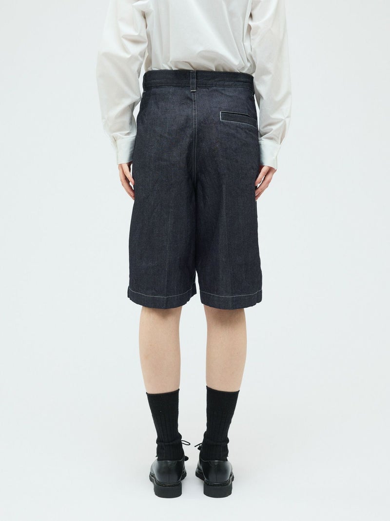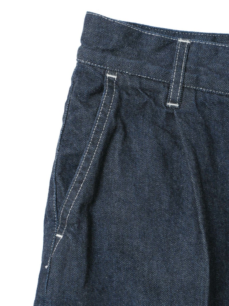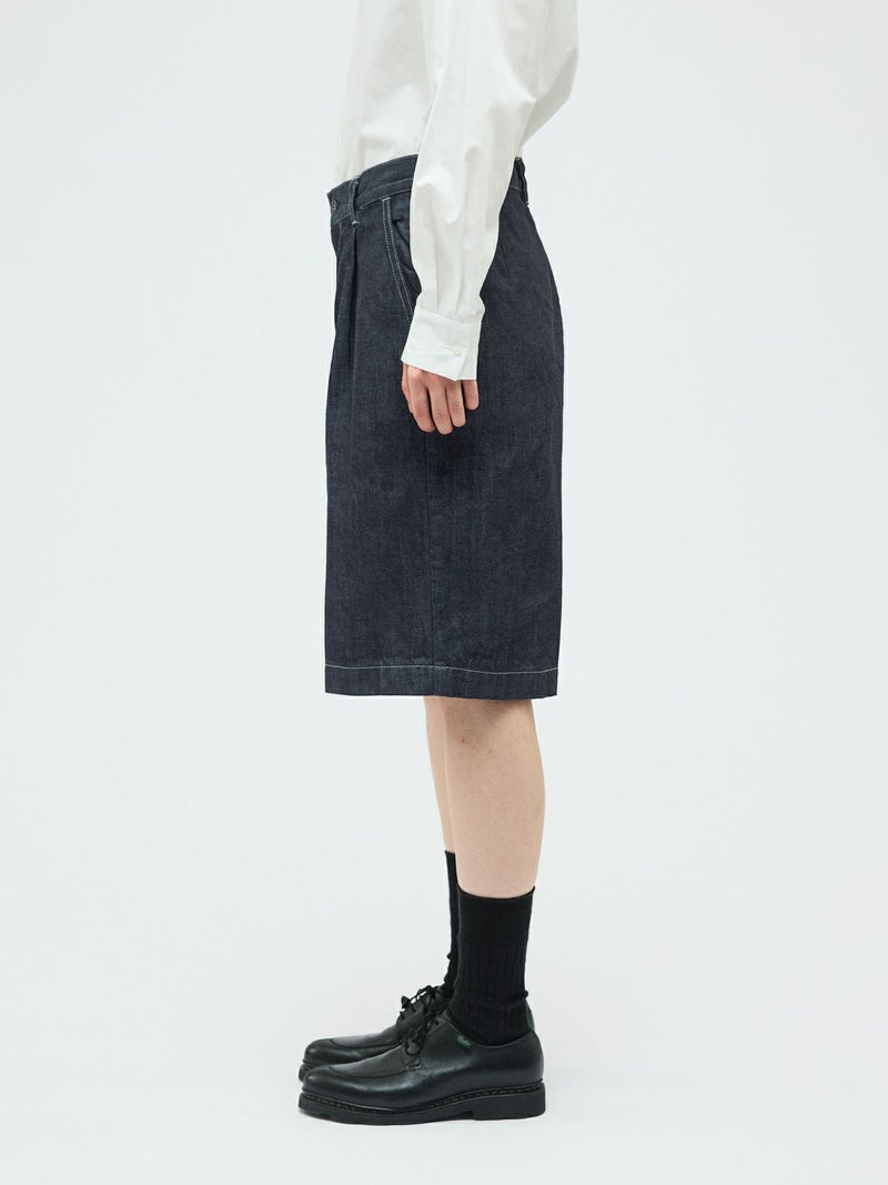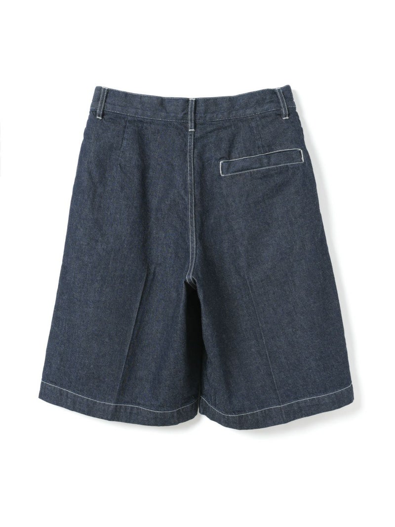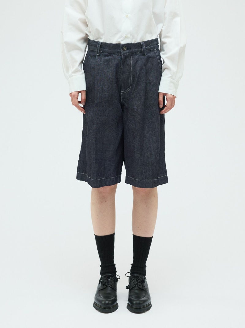 ウエストにワンタック入れたデニムハーフパンツ(ワンウォッシュ)です。膝丈のショート丈にセンタープレスを入れた大人な表情を印象付けたデニムパンツです。ワンウォッシュの濃いネイビーカラーが正統派のきちんと感を演出。ステッチも拘って目に入ってくるデザイン。ウエストはベルト使い可能。シャツインにもお勧めです。長袖から半袖、足元からアウターまで、季節感を幅広くコーディネートしていただけます。同品番1-260095BL(ブリーチ)も展開。