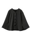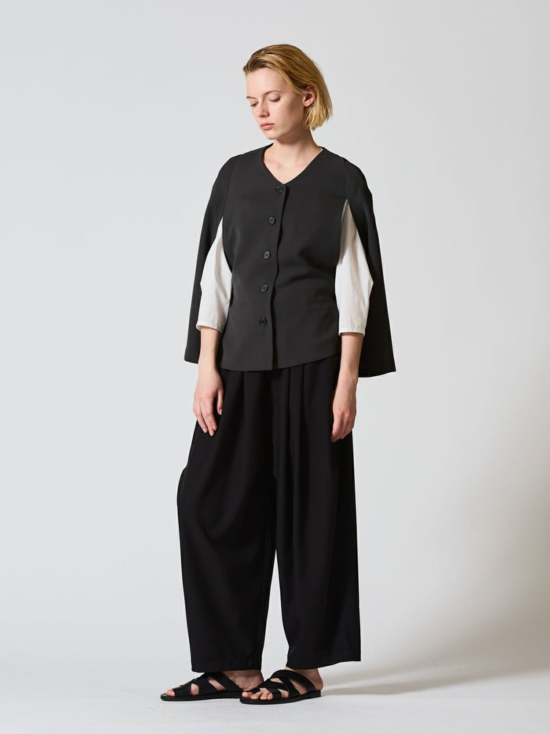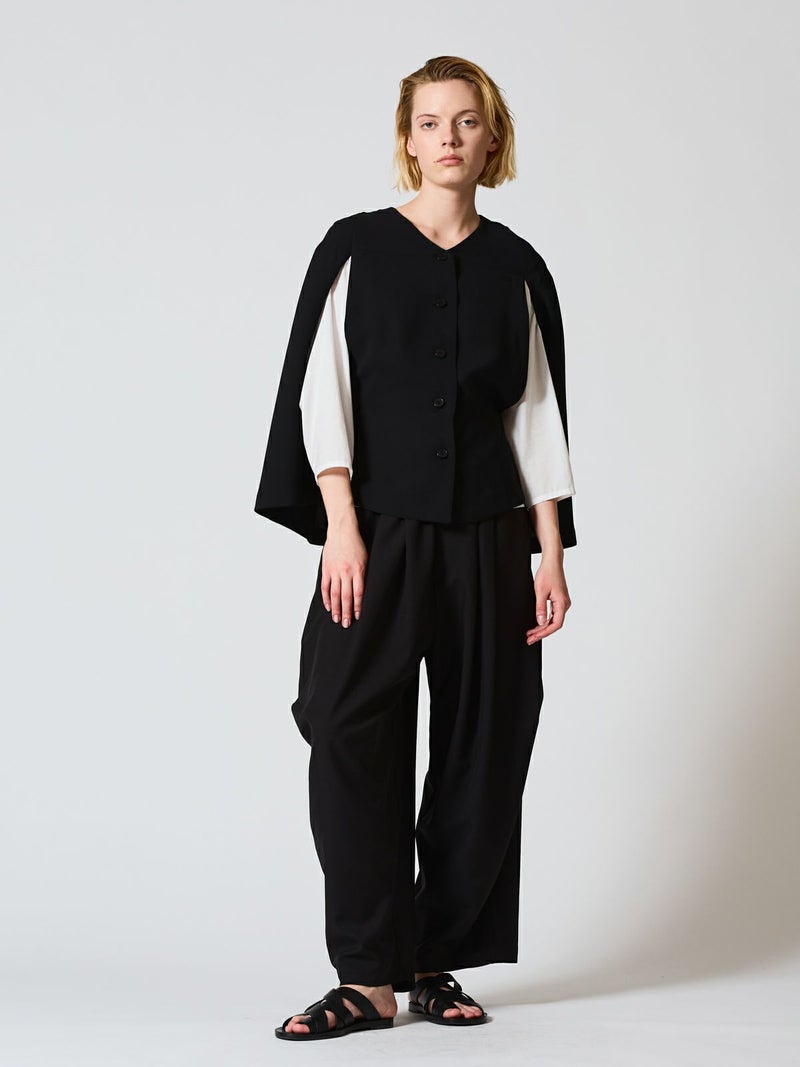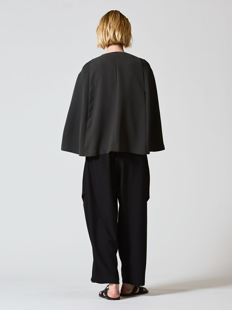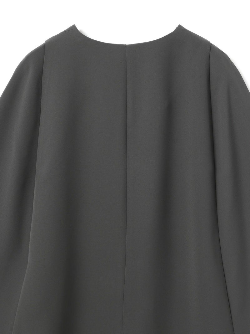 サラッとしたポリエステル素材を使用したポンチョです。ストレッチの効いた動きやすい生地が特徴。フロントボタン仕様。前付きに袖口があり丸みのあるシルエットを表現。身幅も余裕があり重ね着がしやすいサイズ感です。軽さがありしなやかで女性らしい雰囲気を印象付けます。ボトムはボリューム感のあるシルエットもバランスよく着こなせます。オケージョン対応にもお勧めのポンチョです。