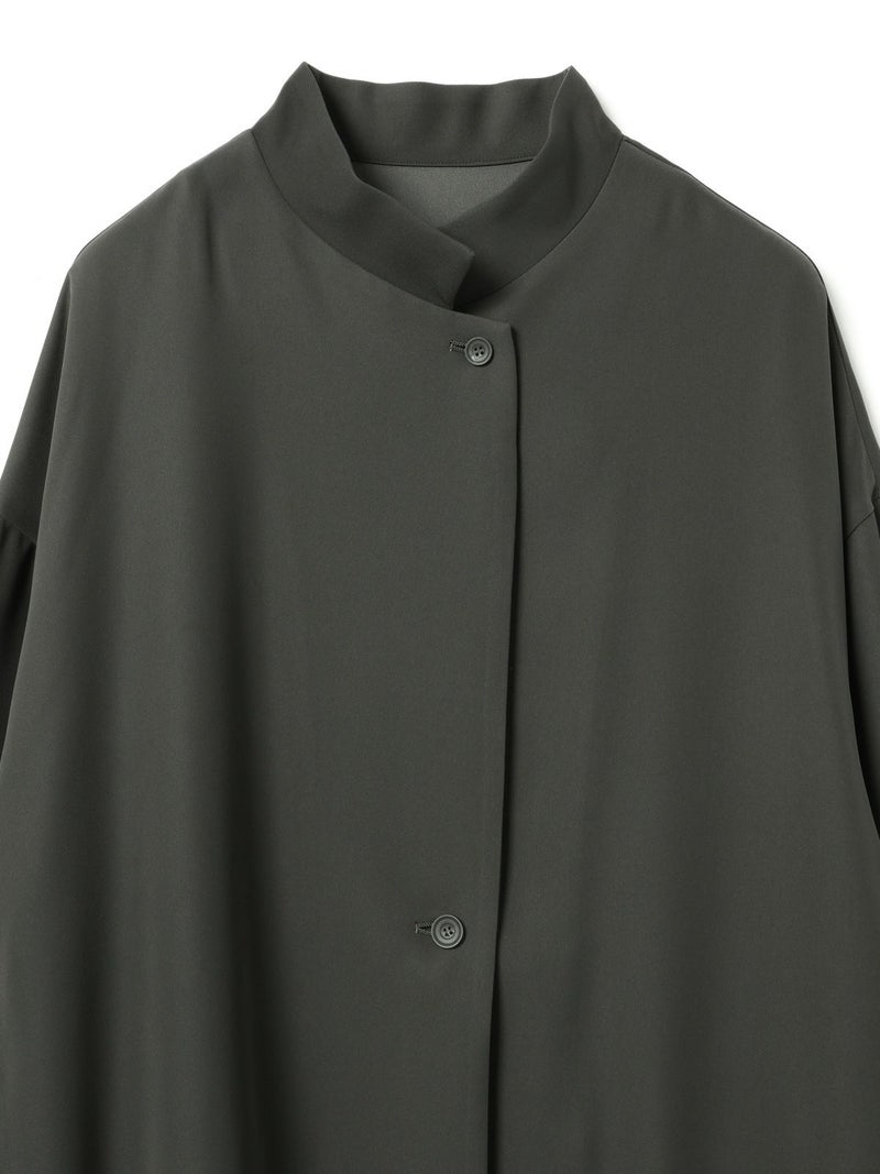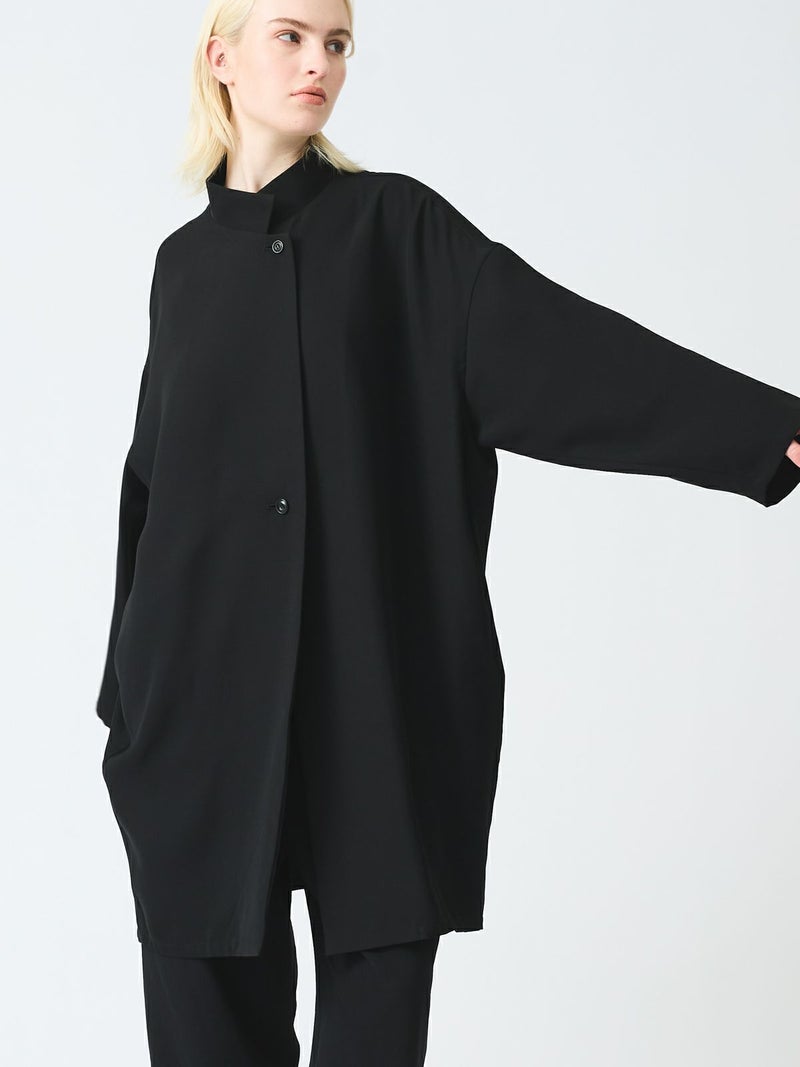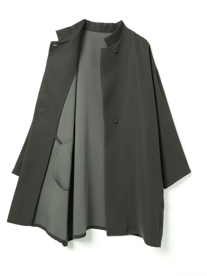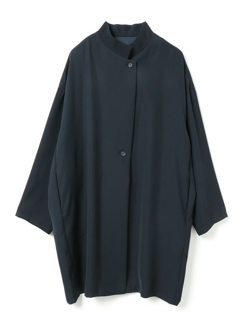 特殊な構造によるエアリーなふくらみ感と上品な光沢感が特徴のスタンドカラーワイドジャケットです。ダブルサテンを使用しており軽くナチュラルなストレッチ性のある大変着用しやすい春アウターとなっています。ワンピースのような雰囲気もあるmizuiro indらしい1枚です。シャープな印象のスタンドカラーとスッキリとしたボタン使いのデザインがシックな大人の着こなしを演出します。着回しのしやすい4色のカラー展開。