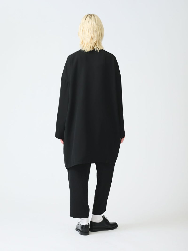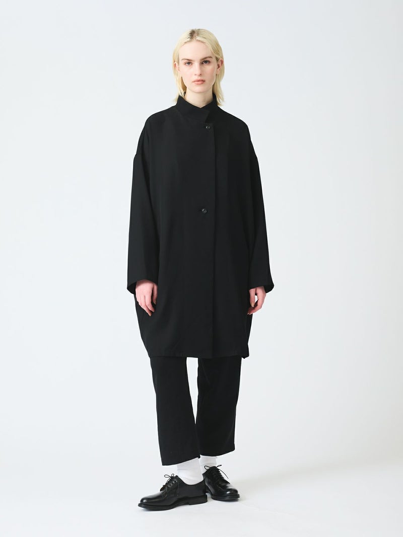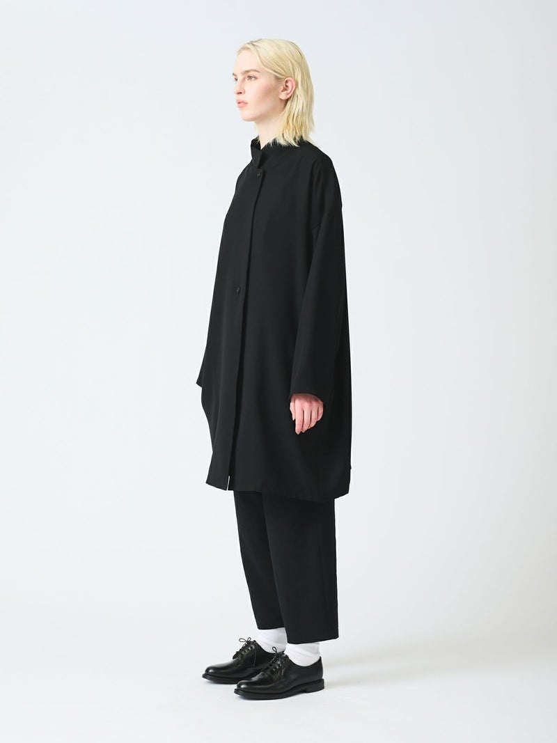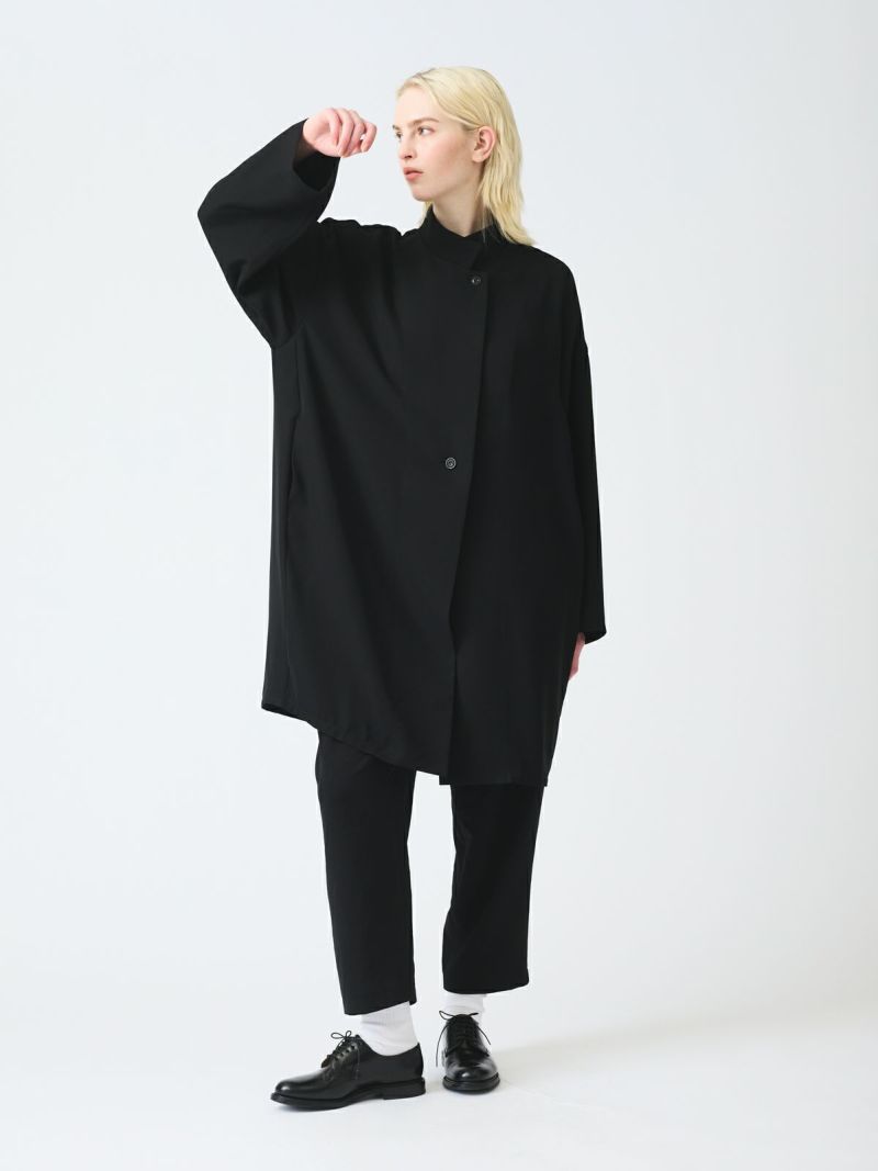 特殊な構造によるエアリーなふくらみ感と上品な光沢感が特徴のスタンドカラーワイドジャケットです。ダブルサテンを使用しており軽くナチュラルなストレッチ性のある大変着用しやすい春アウターとなっています。ワンピースのような雰囲気もあるmizuiro indらしい1枚です。シャープな印象のスタンドカラーとスッキリとしたボタン使いのデザインがシックな大人の着こなしを演出します。着回しのしやすい4色のカラー展開。