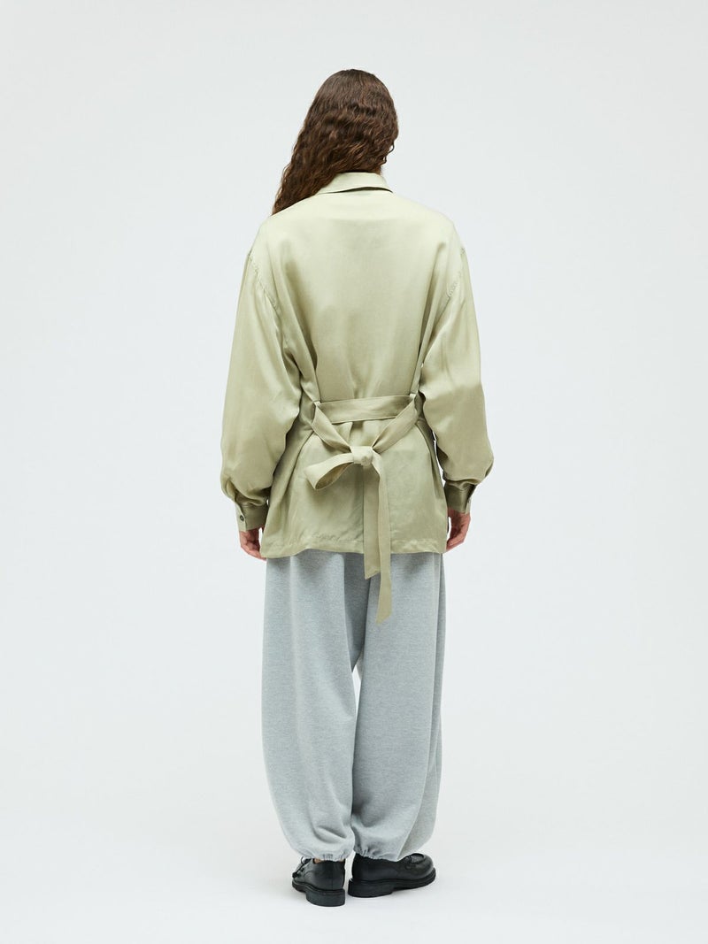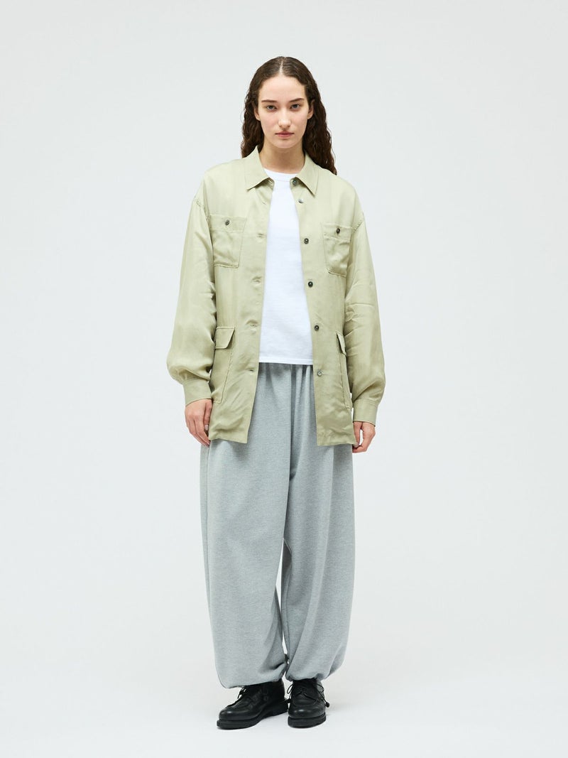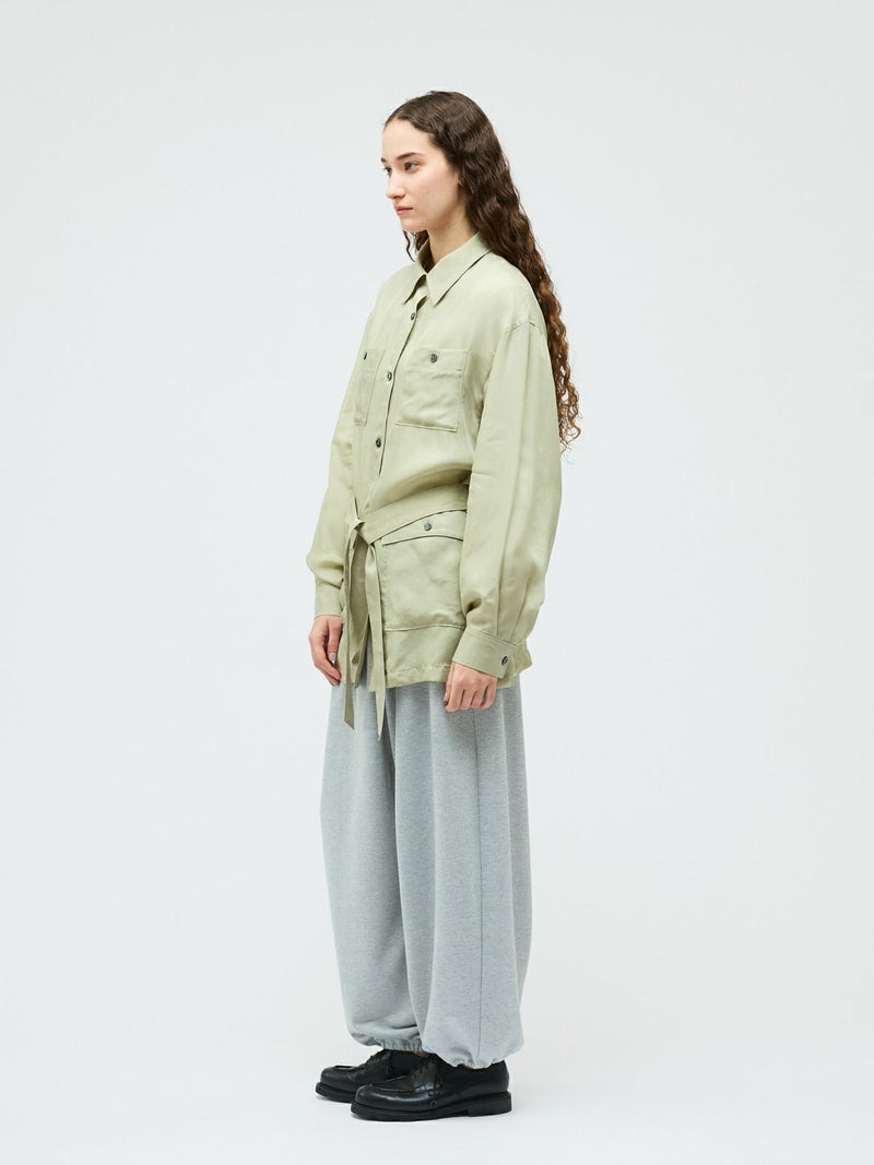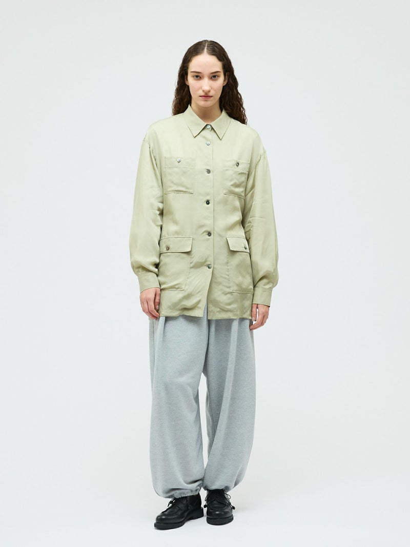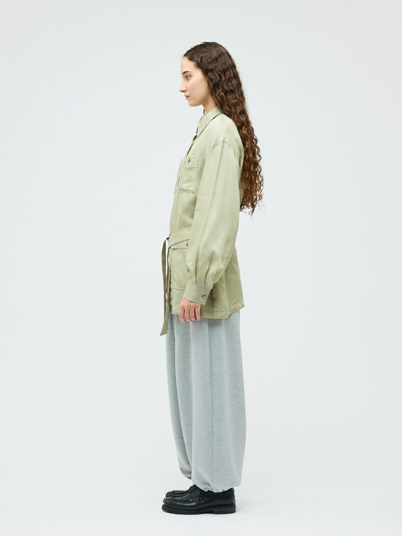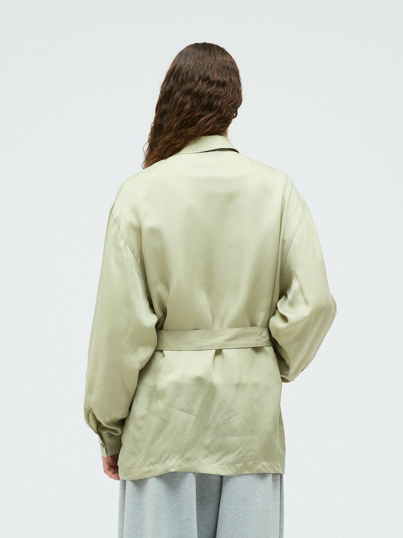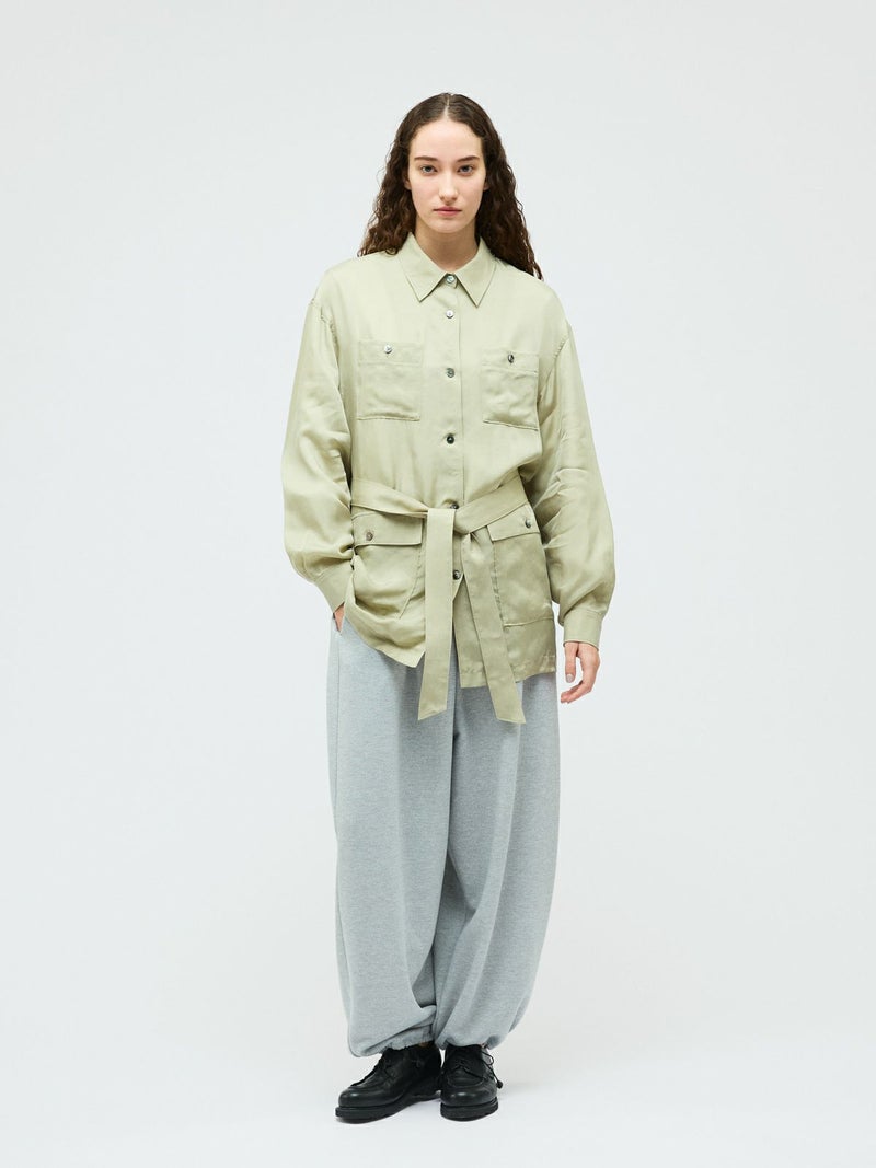 ミリタリー由来のディテールを取り入れたフィールドジャケットを、軽やかな素材感で上品に仕上げた一着。機能的なポケットや程よくラフな雰囲気が特徴。フィールドジャケットのデザイン要素を活かしつつ、都会的で洗練された印象に落とし込みました。共布ベルト付きで、ウエストマークすることでシルエットのアレンジが可能。さらっと羽織ればリラックス感のある着こなしに、ベルトで締めればメリハリのある女性らしいバランスが楽しめます。素材にはキュプラ100%を使用。自然な光沢と美しい落ち感があり、動くたびにしなやかに揺れる上品な表情が魅力です。ほどよいシアー感が今季らしく、見た目にも軽やか。シャツのような軽い着心地で、ジャケットとしても気軽に取り入れられます。肌当たりもなめらかで着心地が良くご自宅で洗濯できるイージーケア仕様なのも嬉しいポイント。季節の変わり目に活躍する、きれいめにもカジュアルにも着回せる万能アウターです。