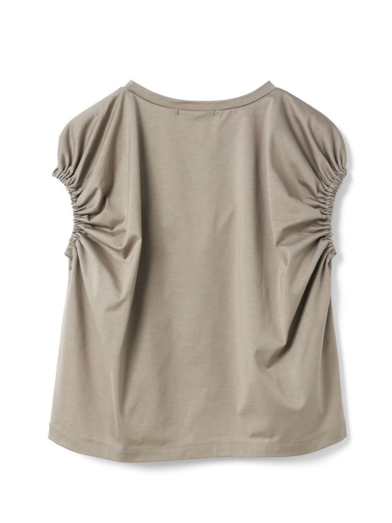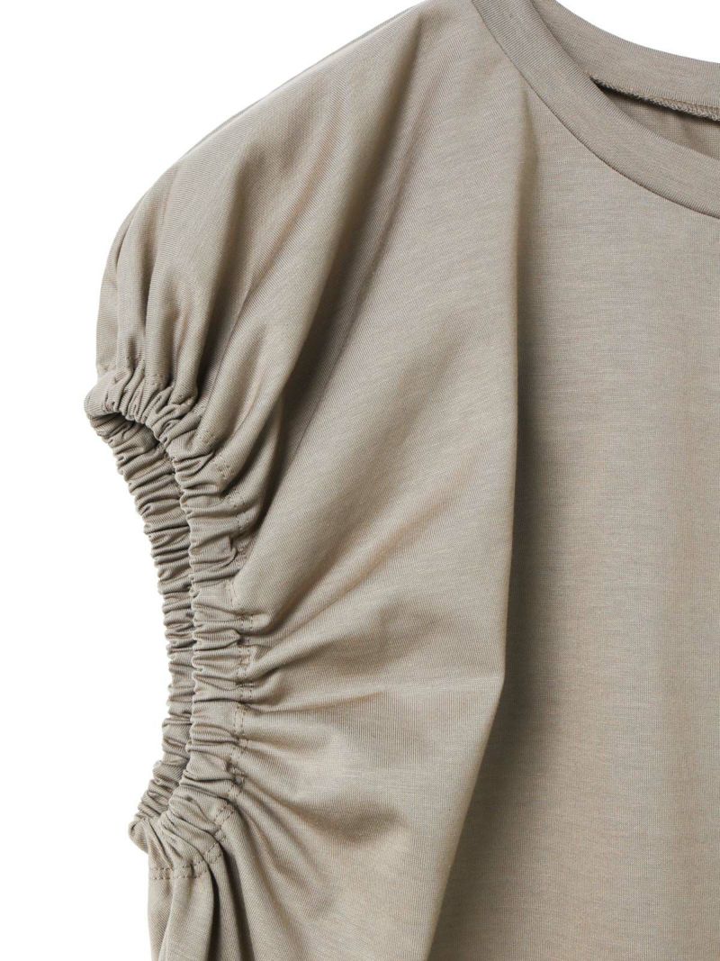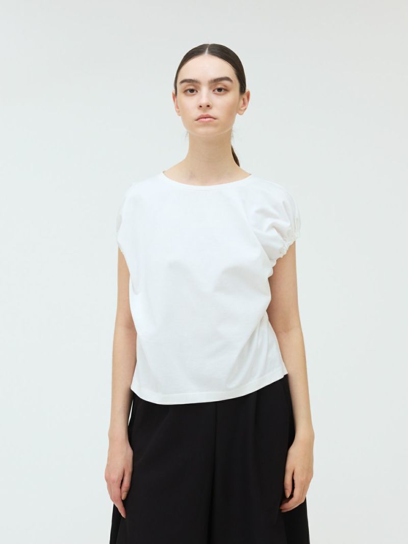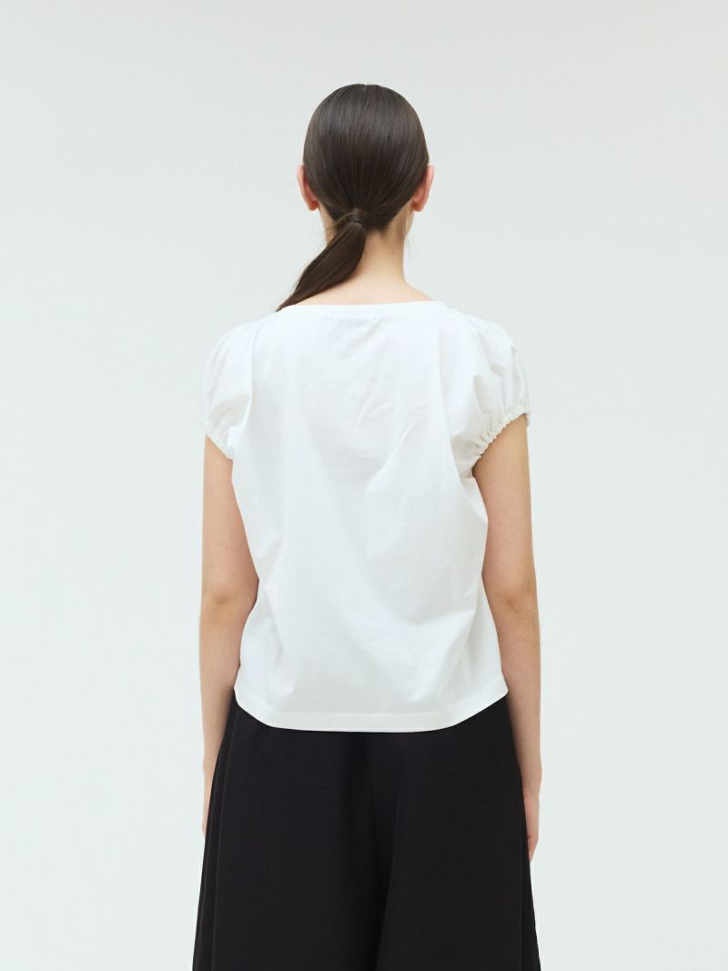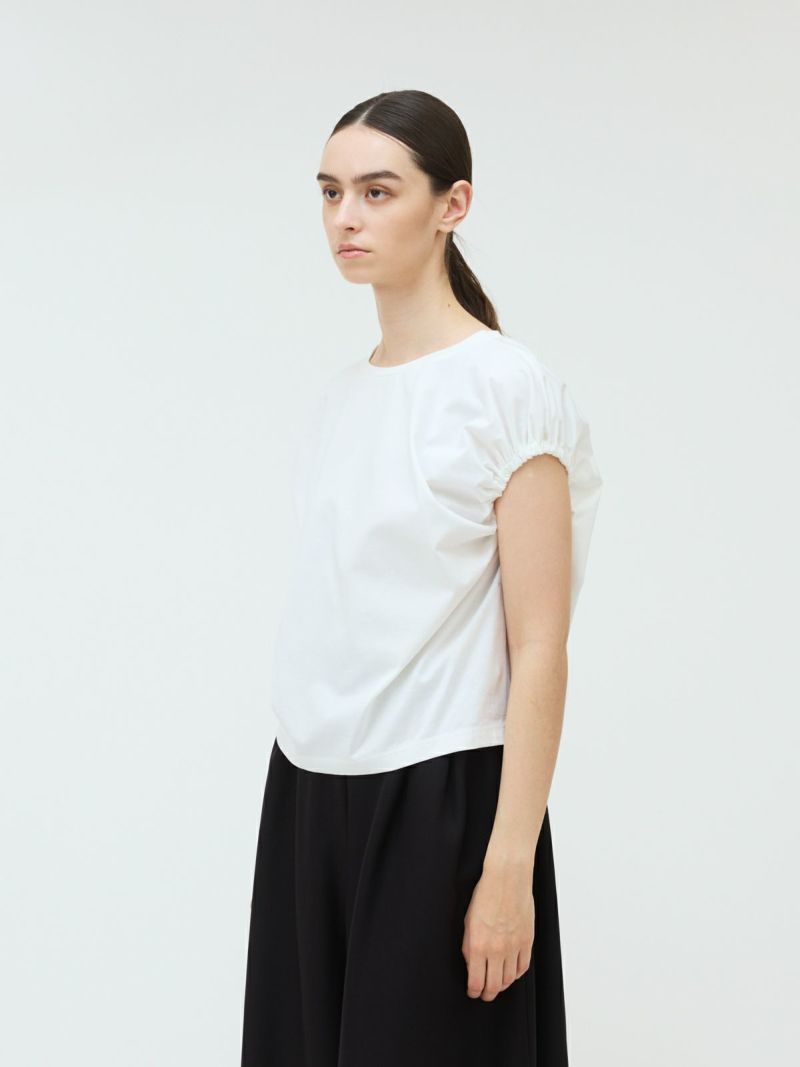 フレンチスリーブにゴムで表情を加えたギャザーパフスリーブプルオーバーのTシャツです。少し張りのある素材で甘すぎないテイストに仕上げた今季お勧めのアイテムです。袖のパフスリーブが女性らしさと丸みのある優しいシルエットを表現しています。上品で優しい色合いもポイント。清涼感があり着回しアイテムになるコーディネートしやすい1枚です。