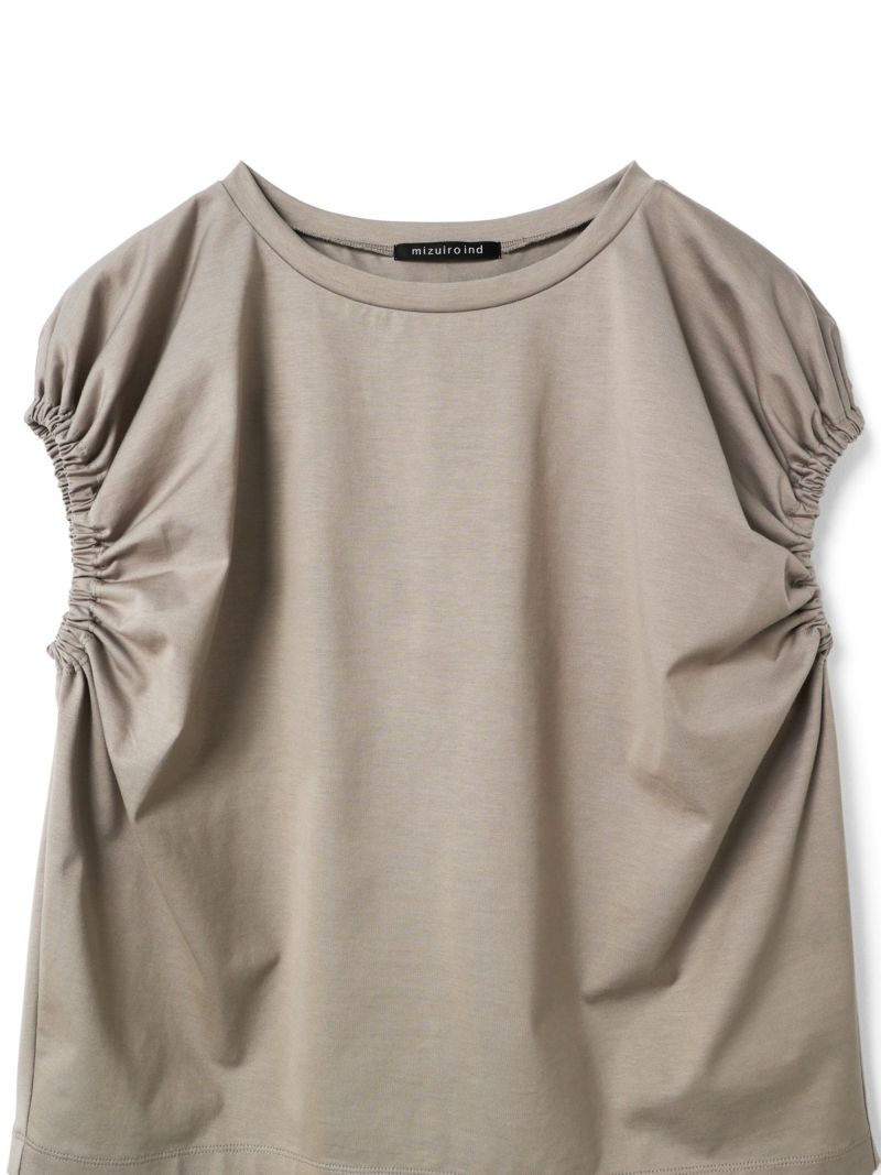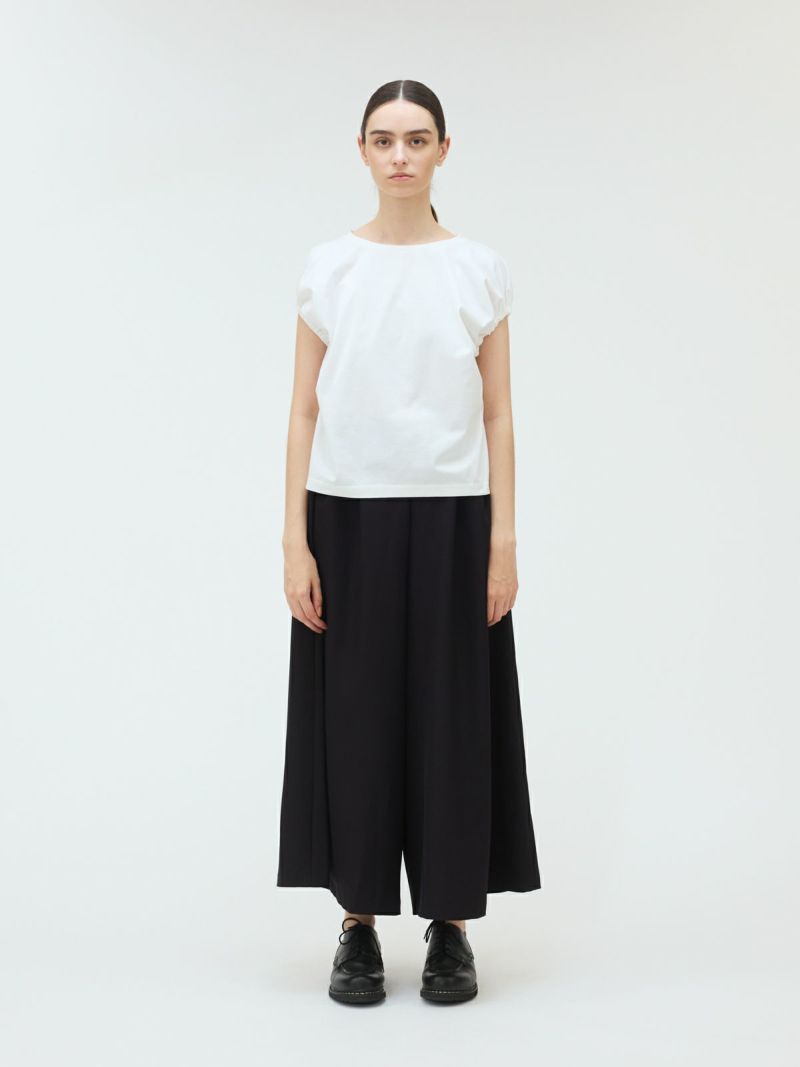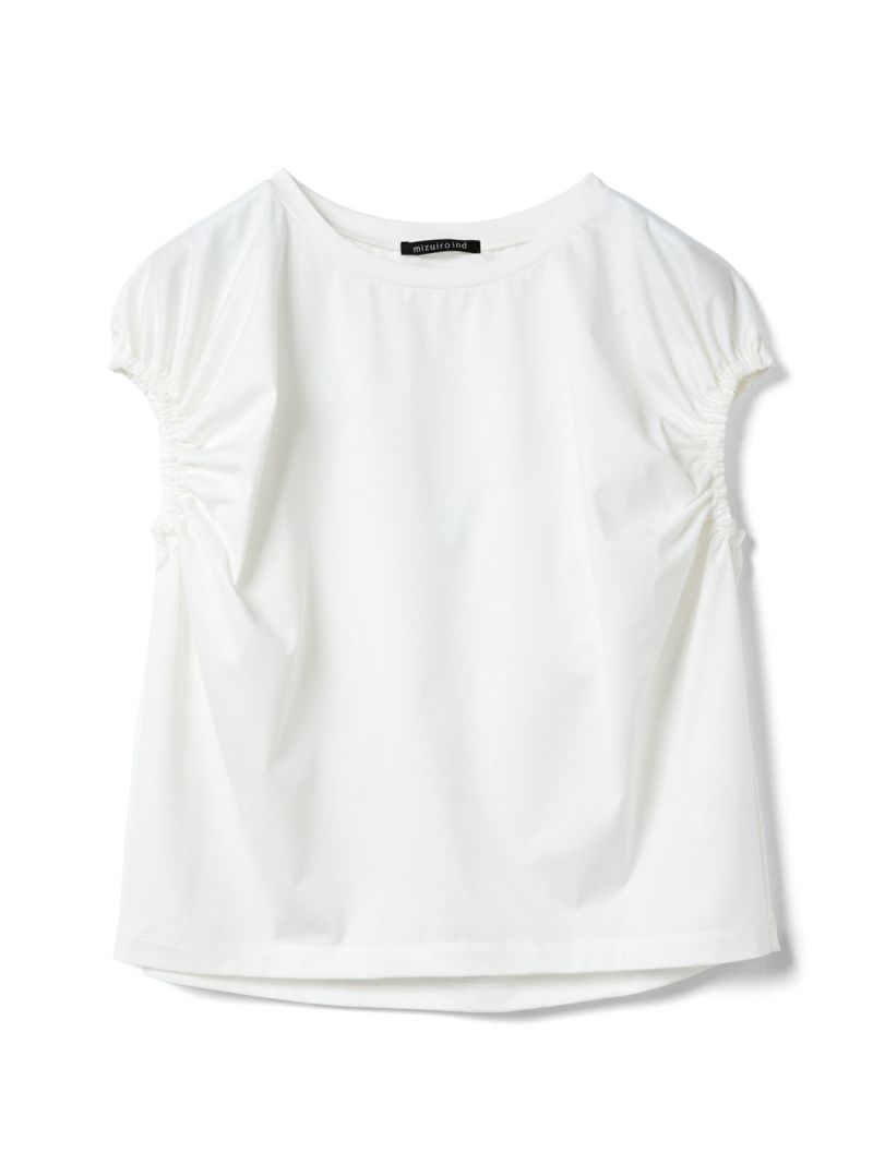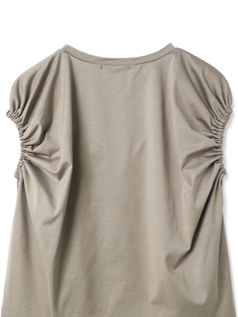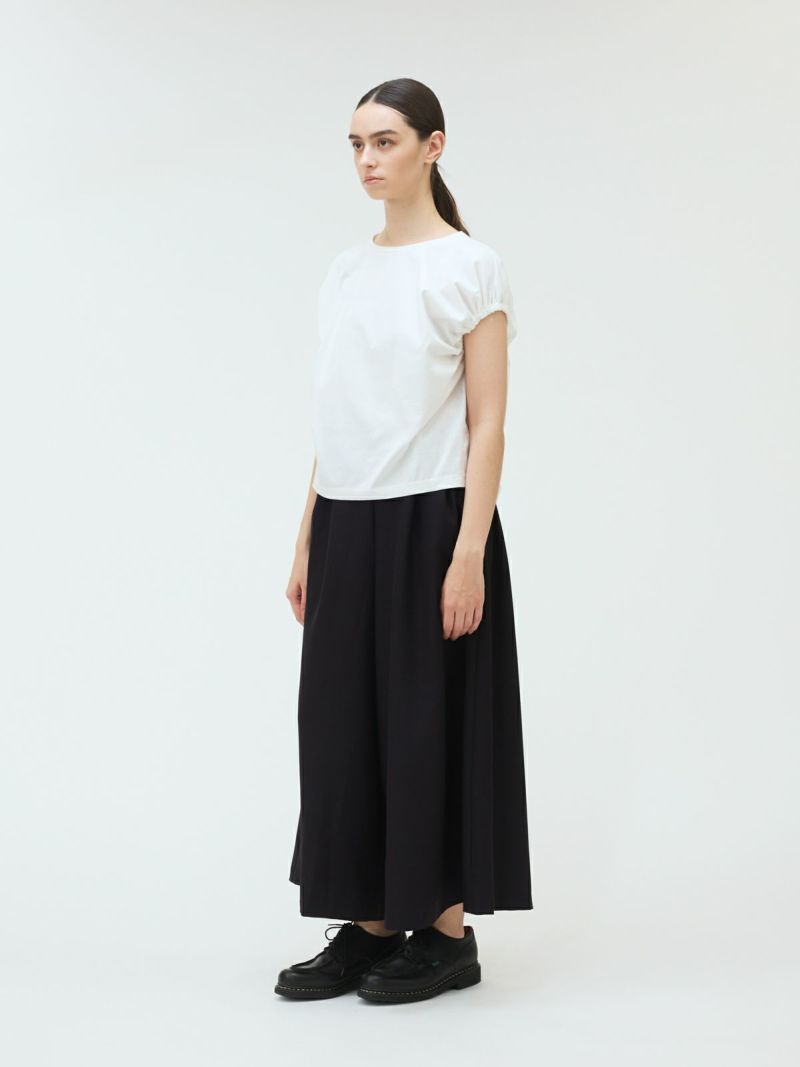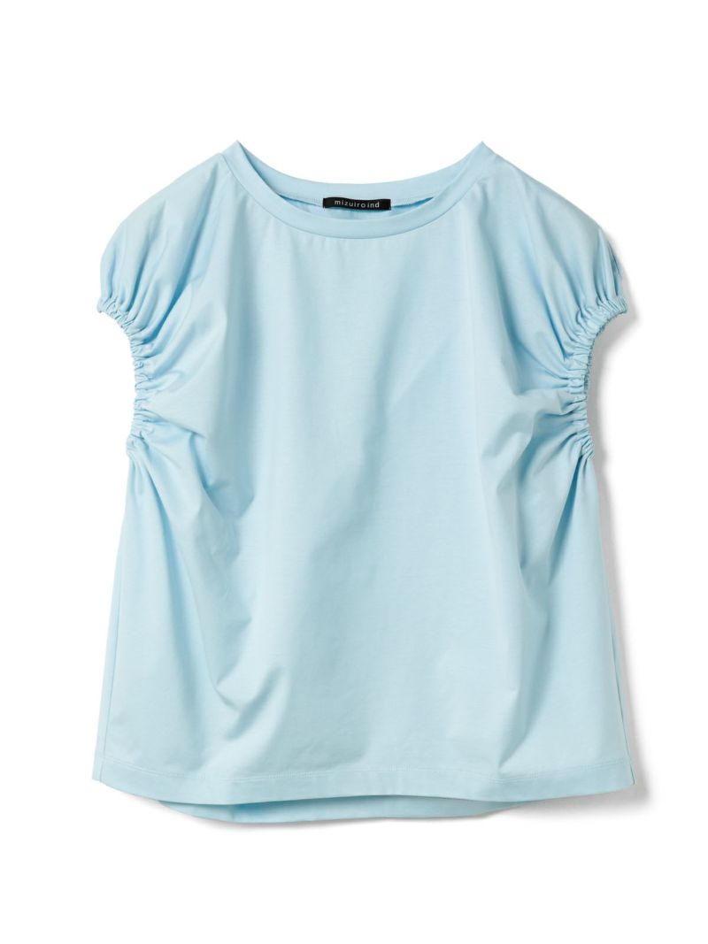 フレンチスリーブにゴムで表情を加えたギャザーパフスリーブプルオーバーのTシャツです。少し張りのある素材で甘すぎないテイストに仕上げた今季お勧めのアイテムです。袖のパフスリーブが女性らしさと丸みのある優しいシルエットを表現しています。上品で優しい色合いもポイント。清涼感があり着回しアイテムになるコーディネートしやすい1枚です。