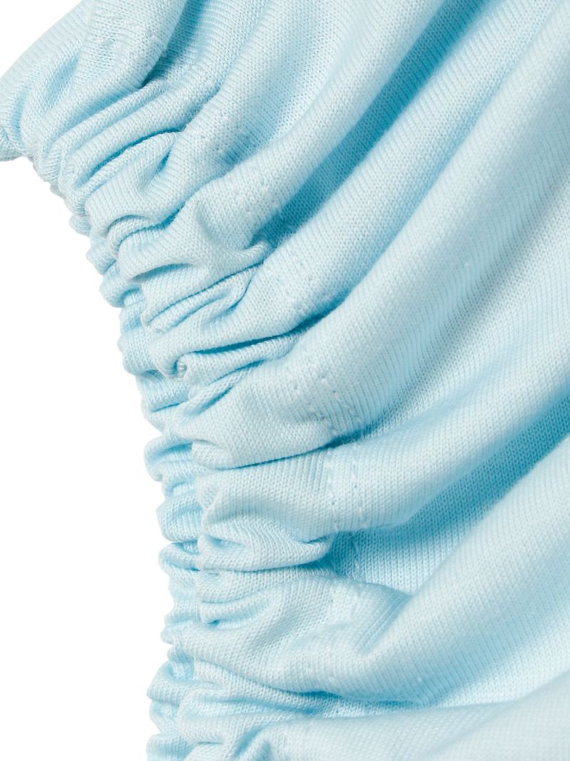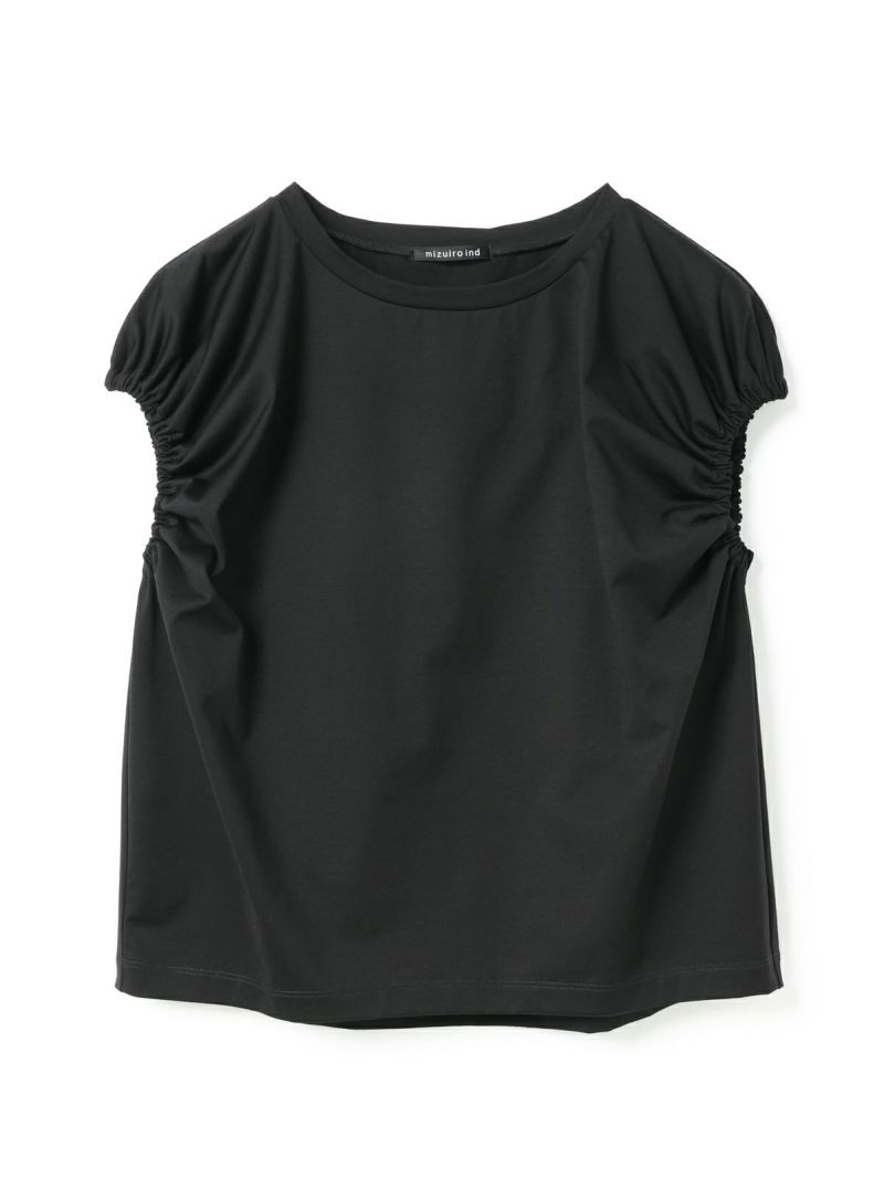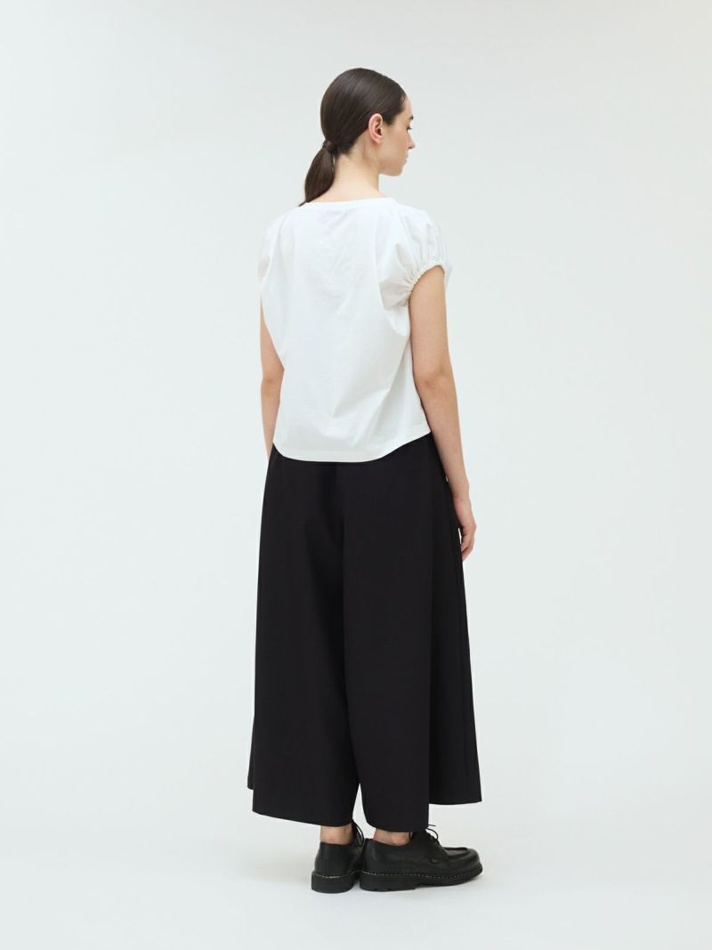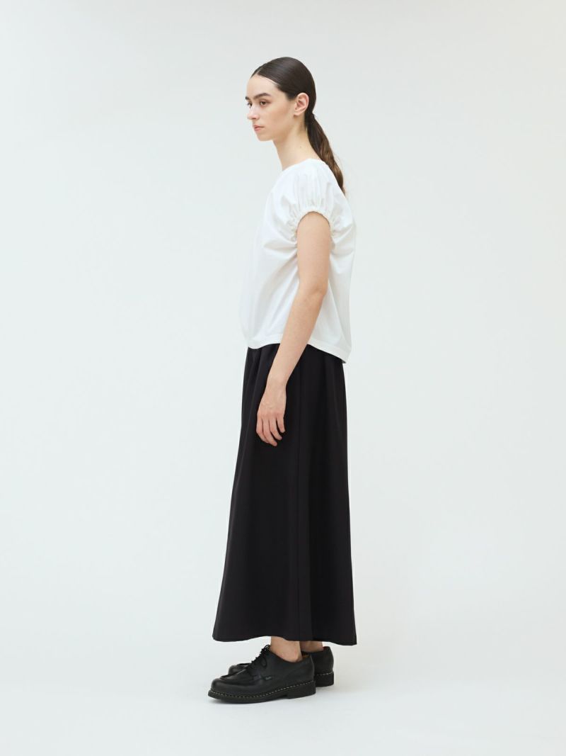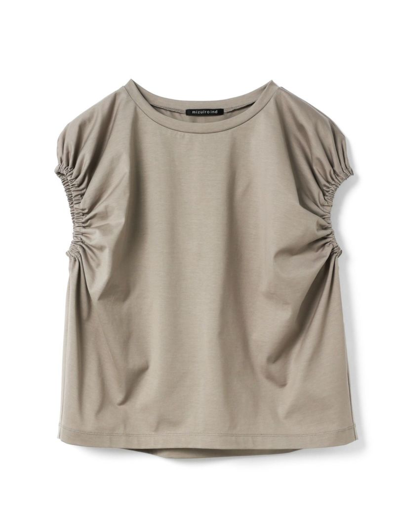 フレンチスリーブにゴムで表情を加えたギャザーパフスリーブプルオーバーのTシャツです。少し張りのある素材で甘すぎないテイストに仕上げた今季お勧めのアイテムです。袖のパフスリーブが女性らしさと丸みのある優しいシルエットを表現しています。上品で優しい色合いもポイント。清涼感があり着回しアイテムになるコーディネートしやすい1枚です。