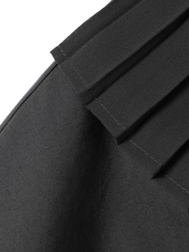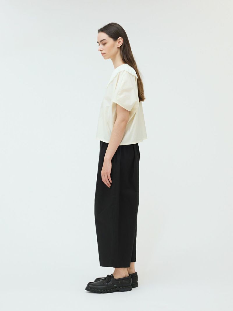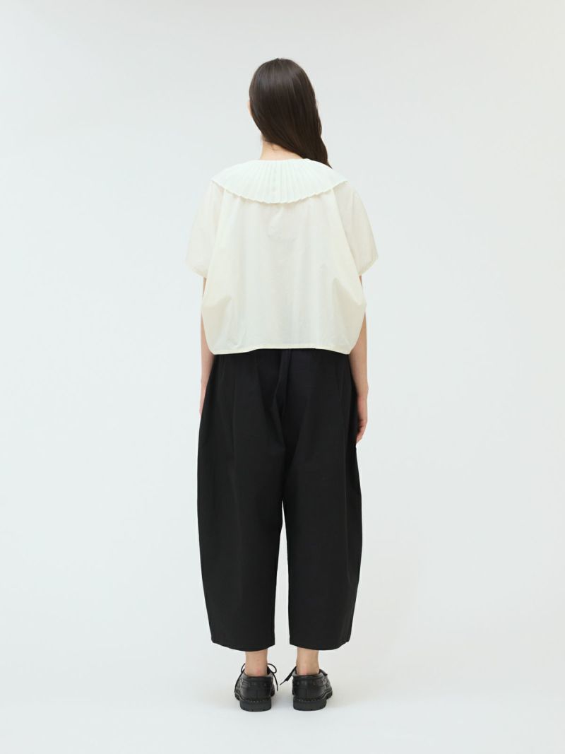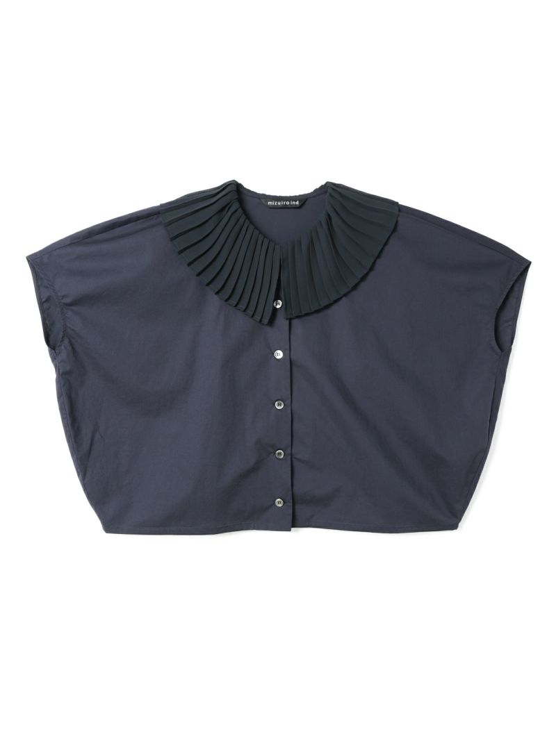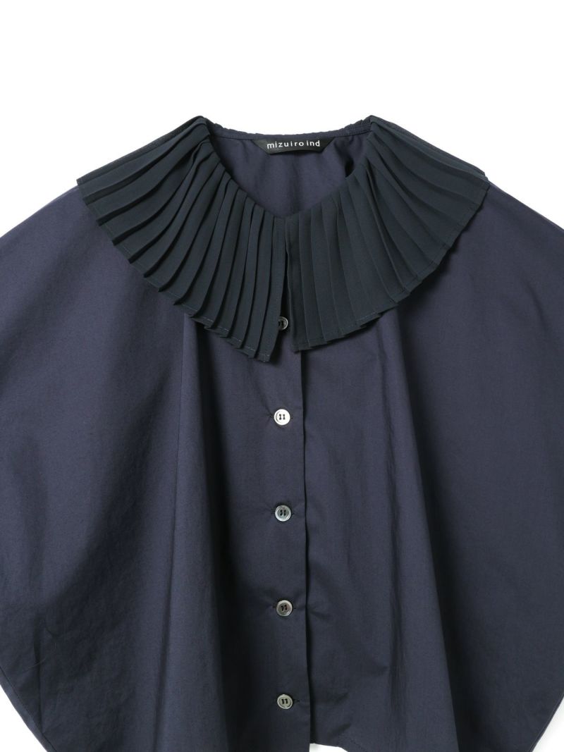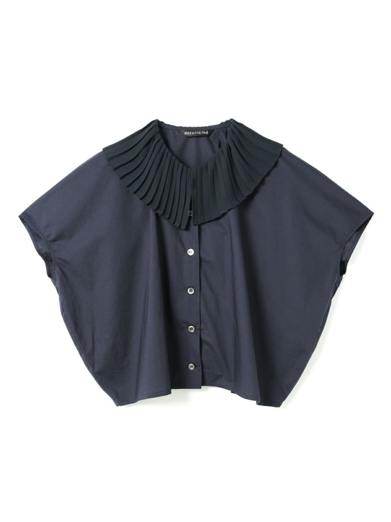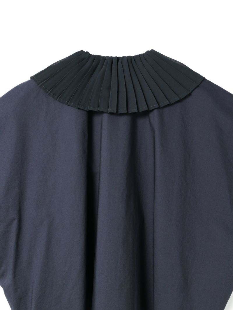 大きなプリーツ襟が特徴的なプリーツカラーシャツです。ボディに布帛コットン、襟にポリエステルジョーゼット素材を使用した魅力の1枚。コクーン型のシルエットを表現。袖幅にゆとりがあるので通気性もよく夏場も涼しく着用していただけます。定番のベーシックカラーで展開しておりどのカラーも合わせやすくシンプルにコーディネートができるシャツです。