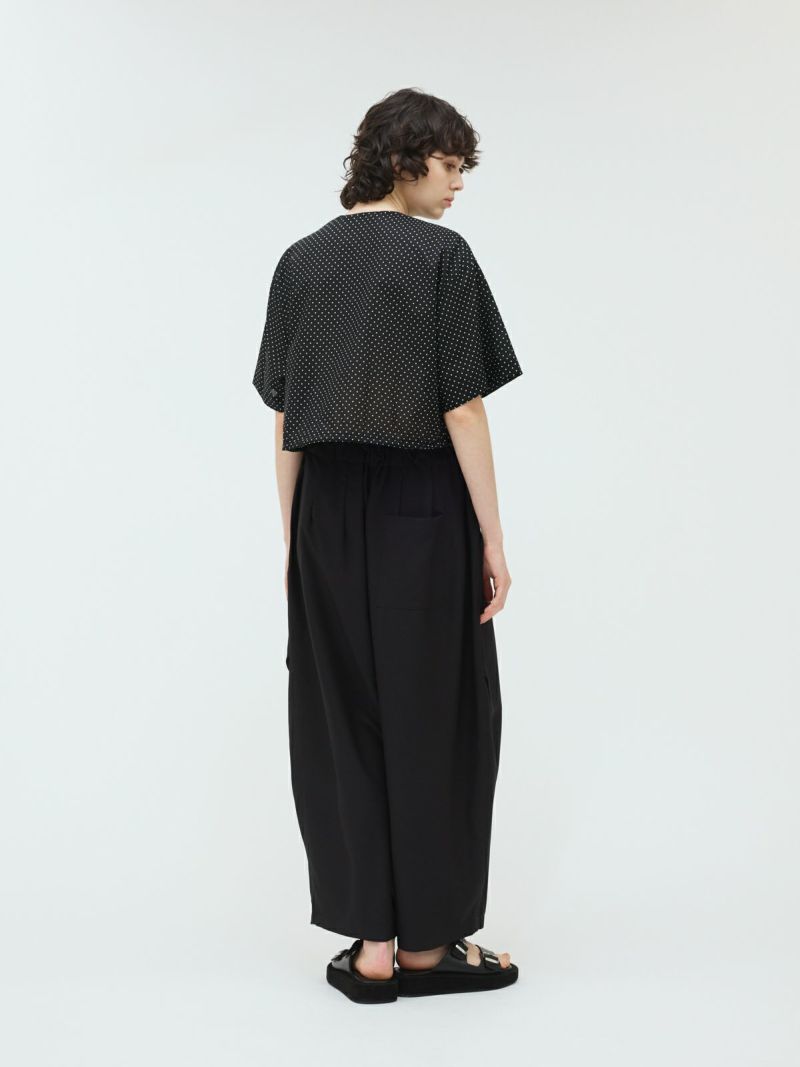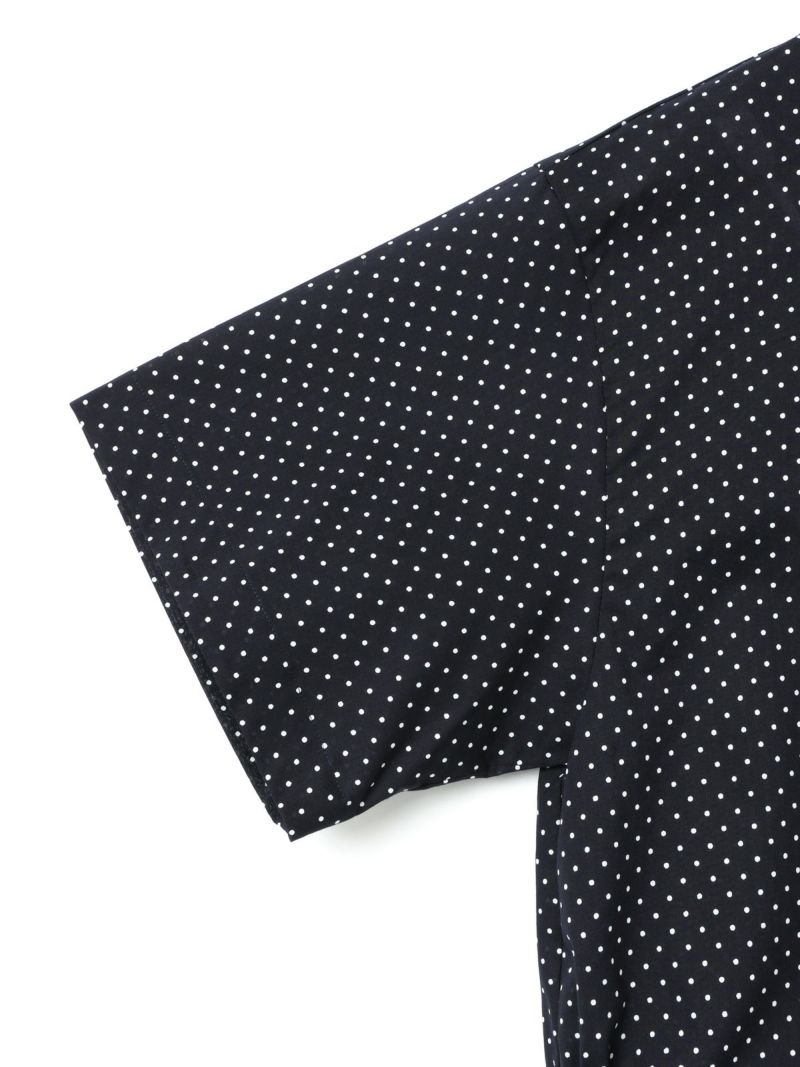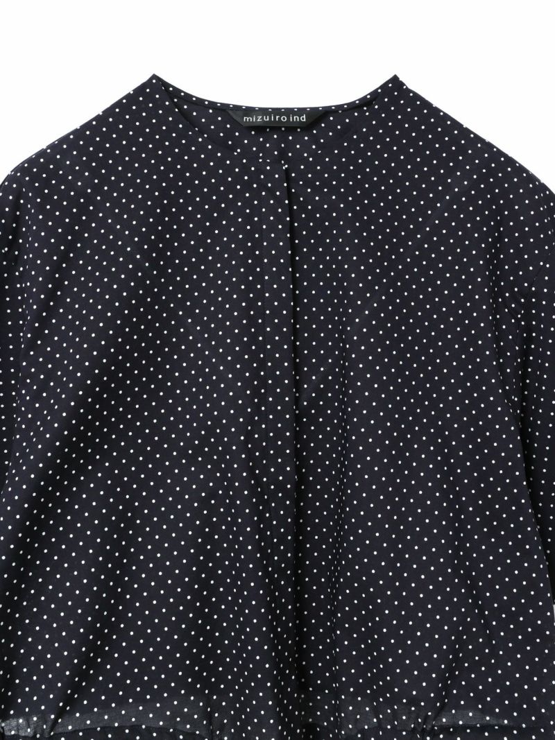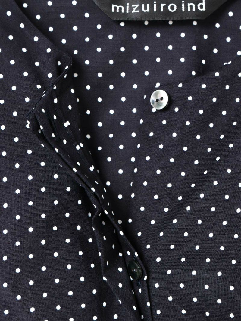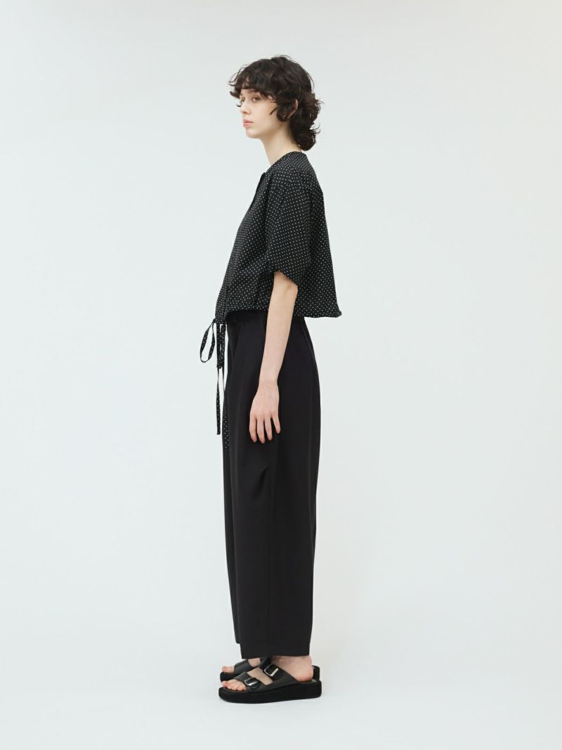 さらりとしてドライな素材感が特徴のドットドローストリングシャツです。2-230089の同型をドット柄生地を使用。シンプルなシャツのデザインに長めに垂らしたウエスト紐がアクセントになった1枚。紐の絞り方で変化をつけ着こなしにアレンジをしていただけるシャツです。ショート丈と比翼仕立てになったフロントのデザインがよりすっきりとした印象に仕上がっています。羽織っても素敵です。暑い季節にさらりとコーディネートしていただけるシャツです。
