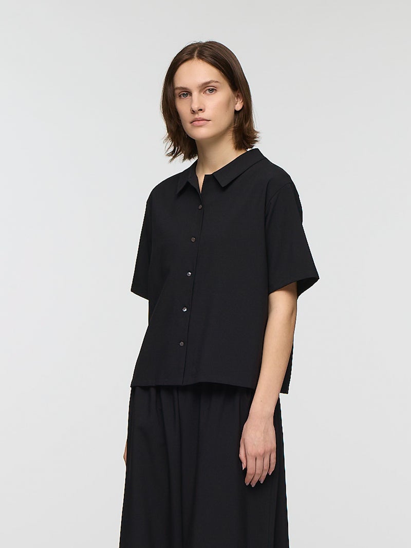 ポプリン素材を使用したポプリンハーフスリーブシャツです。吸水・速乾性に優れたストレッチのきいた生地で柔らかさがあり着心地の良さを感じていただけます。すっきりとした丈感が特徴で、ボトムとのバランスのとりやすいシルエットを表現しました。ドレープ感があり、涼しくサラッとした生地感なので夏場に大変お勧めです。レギュラーカラーのシンプルなデザイン性と着回しのきく6色の豊富な色展開も魅力の一つ。多様なコーディネートに役立つ1枚です。同シリーズ2-260112/ワイドイージーパンツも展開。セットアップでの着こなしもお勧めです。