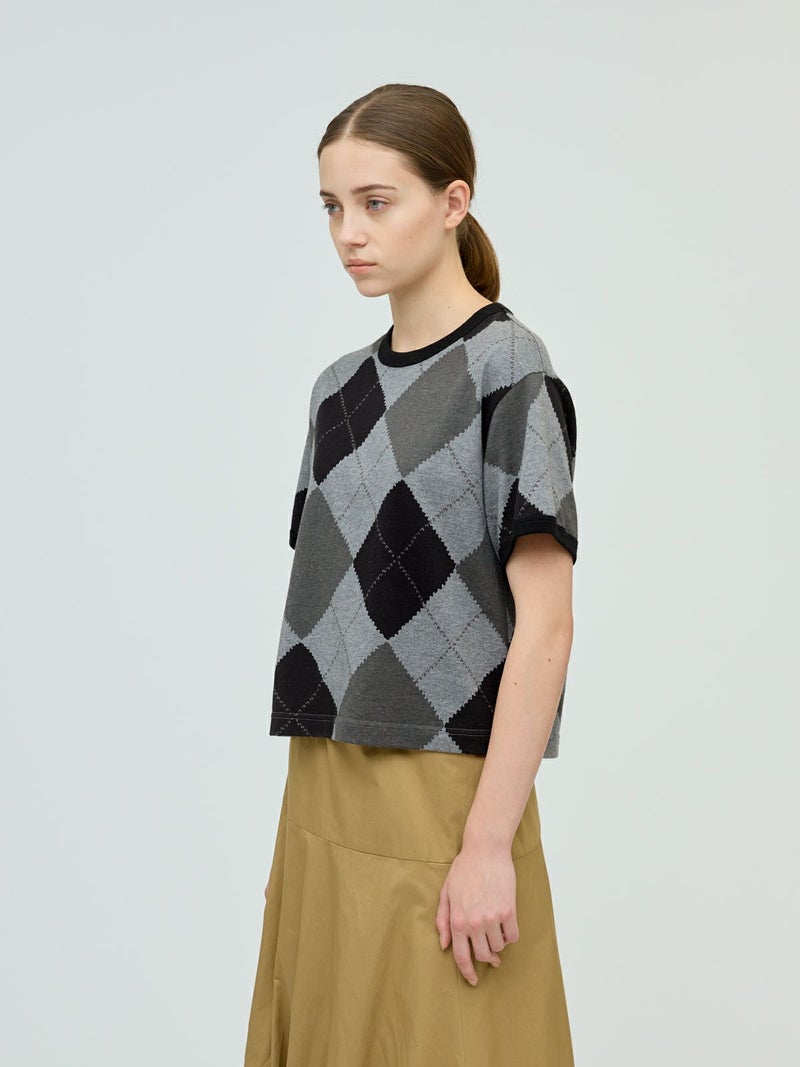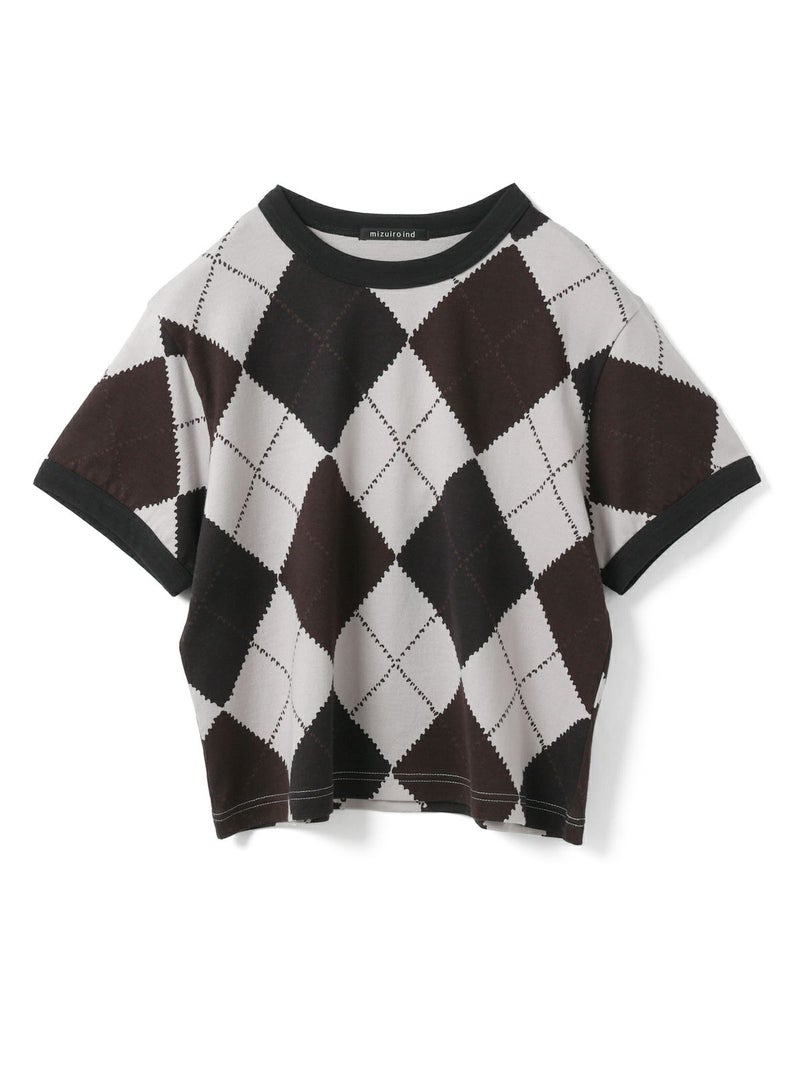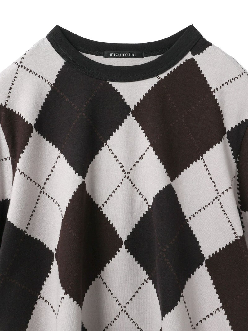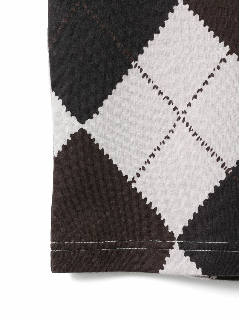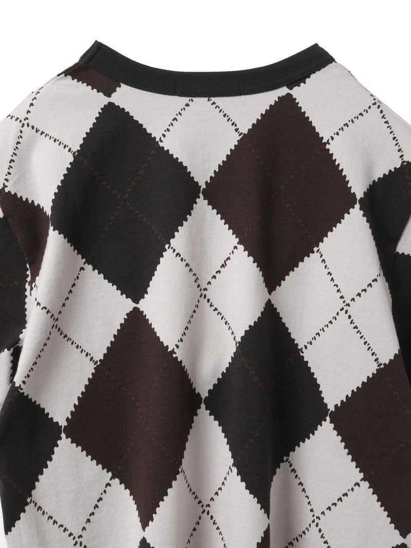 大きなダイア柄がプリントされたアーガイルプリントTシャツです。秋の雰囲気を感じさせてくれるカットソー素材のTシャツで、落着きのある色合いとトラッド感を演出した1枚です。スッキリとしたコンパクト目のサイズ感が特徴。ボリュームのあるボトムとも相性抜群。同シリーズ3-210059/アーガイルプリントカーディガンも展開。秋先取りアイテムにお勧めです。