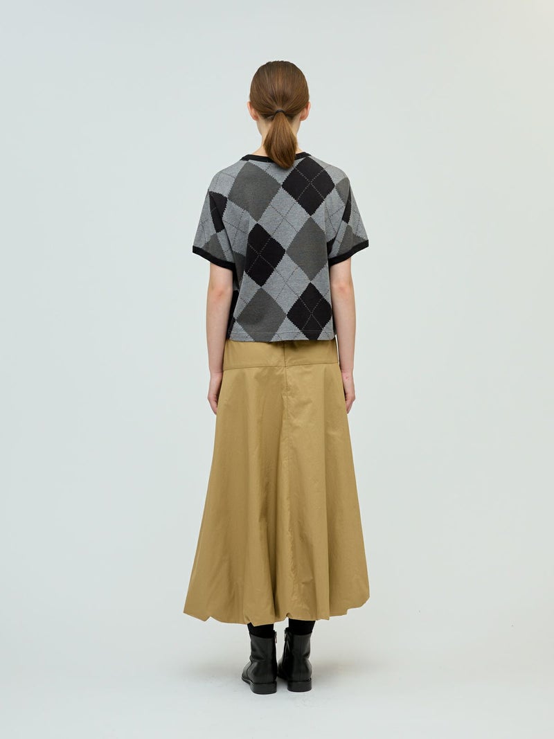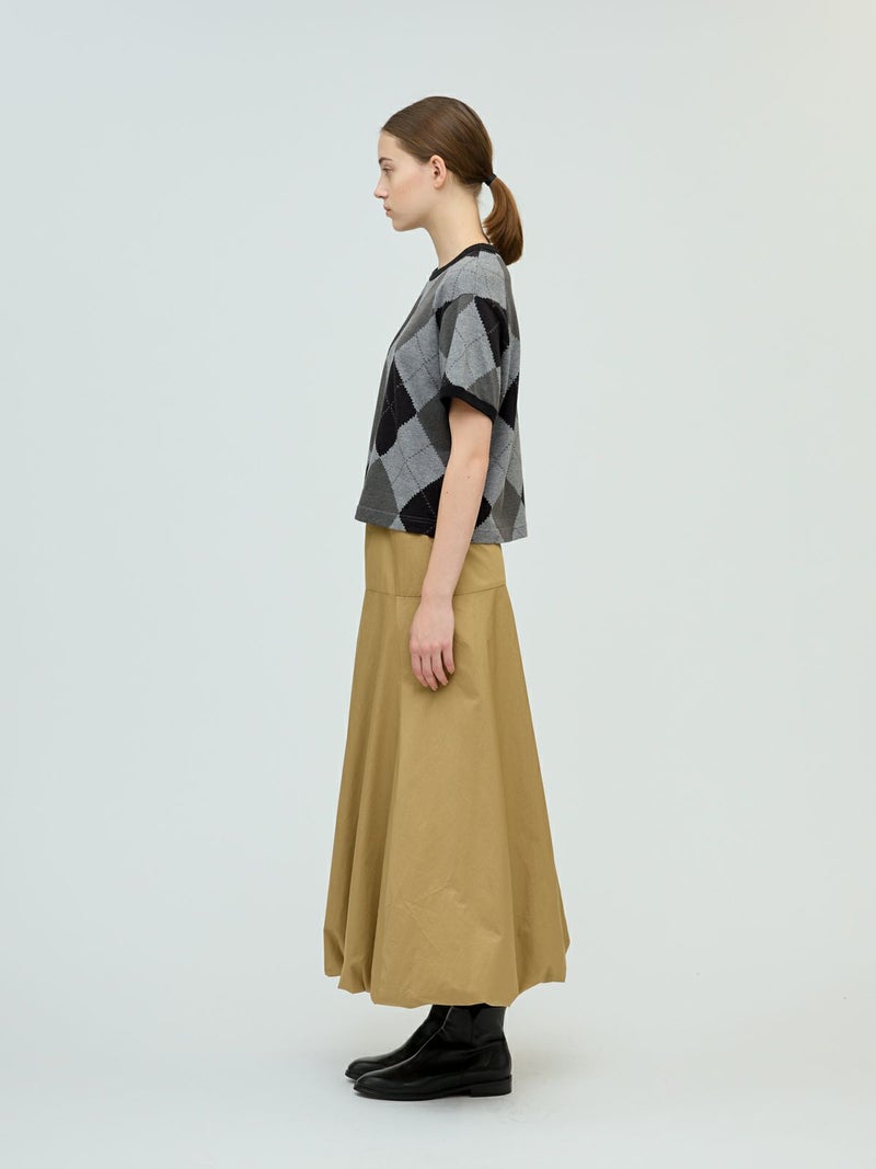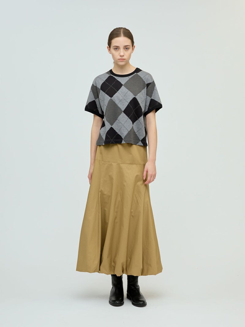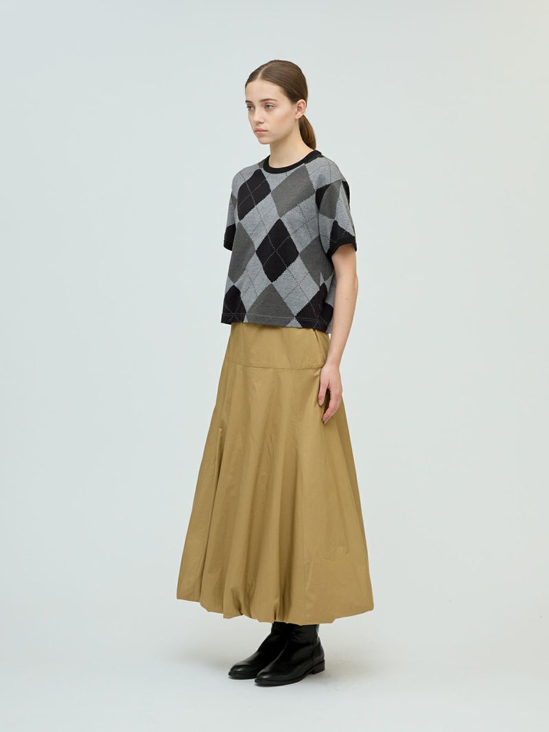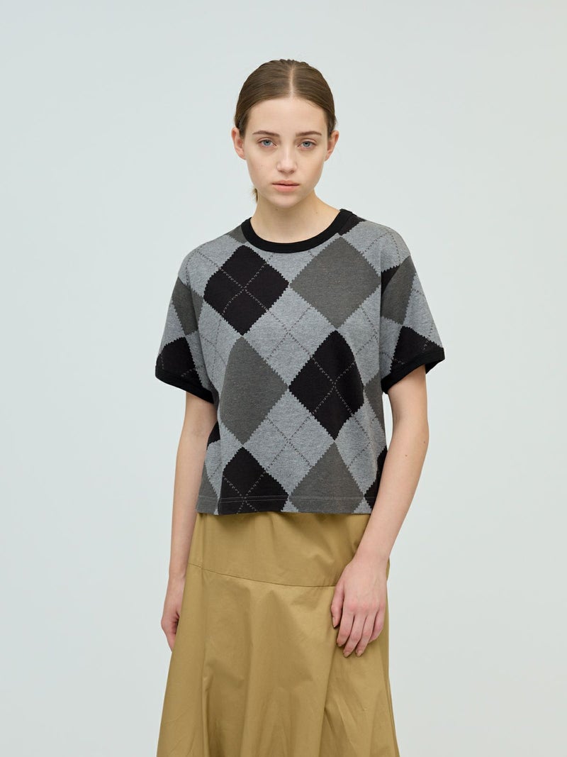 大きなダイア柄がプリントされたアーガイルプリントTシャツです。秋の雰囲気を感じさせてくれるカットソー素材のTシャツで、落着きのある色合いとトラッド感を演出した1枚です。スッキリとしたコンパクト目のサイズ感が特徴。ボリュームのあるボトムとも相性抜群。同シリーズ3-210059/アーガイルプリントカーディガンも展開。秋先取りアイテムにお勧めです。