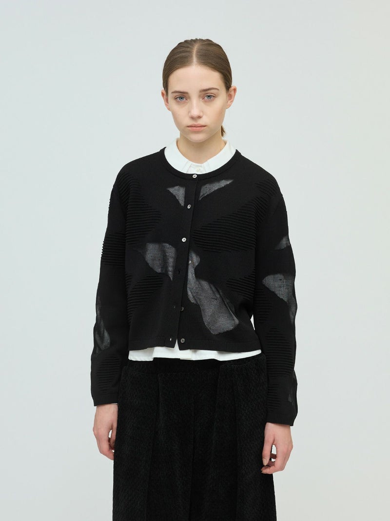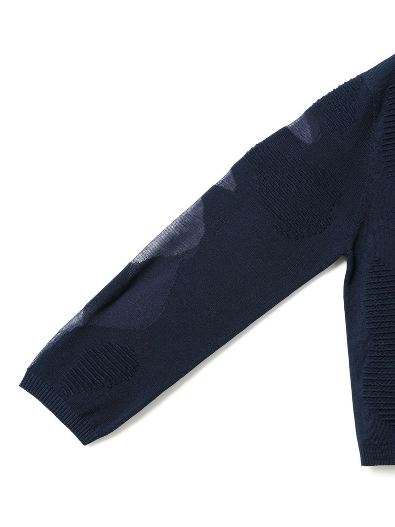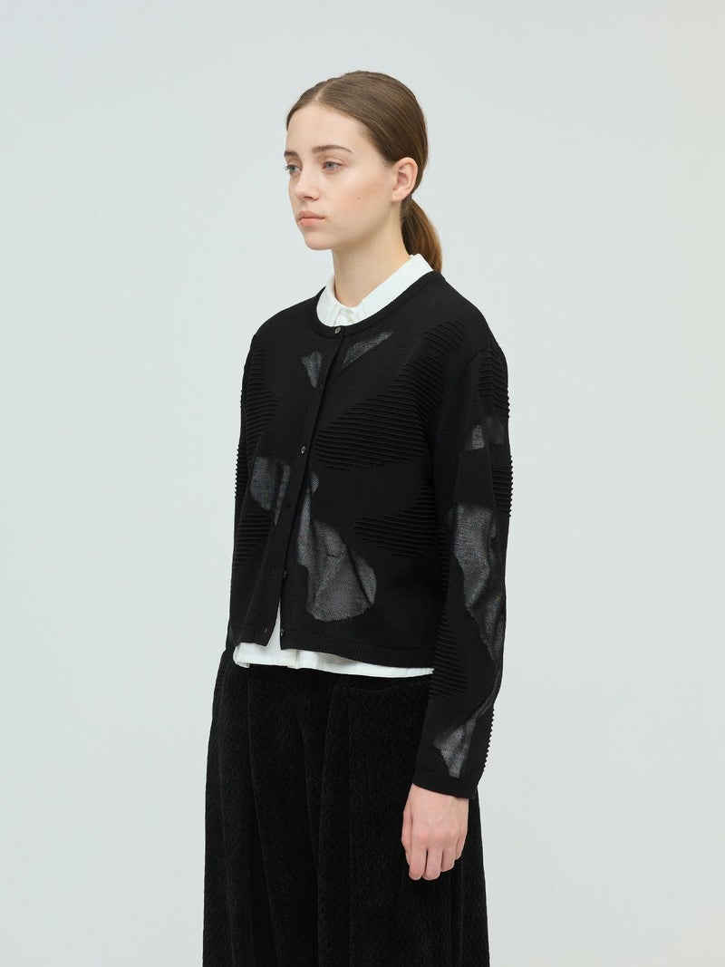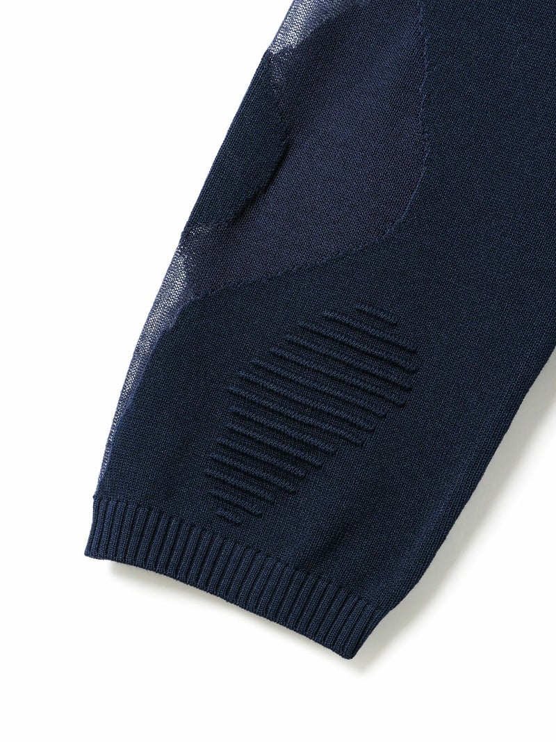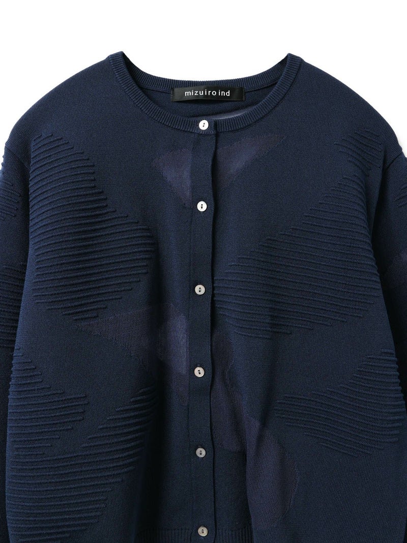 ニットの立体感と透け感のあるデザインがMIXした柄編み模様が特徴のシアーパターンカーディガンです。透け感のある部分のデザインは糸を変えて作っており、細部に拘りを感じさせてくれます。ヒップ上のすっきりとした丈感を表現。ネイビーとブラックの2色に絞ったカラー展開なのでどちらもシックな雰囲気を演出します。透け感があるのでインナーを敢えて別カラーにすることで、シアー模様がより印象的に映ります。同シリーズ3-220098/シアーパターンチュニックも展開。
