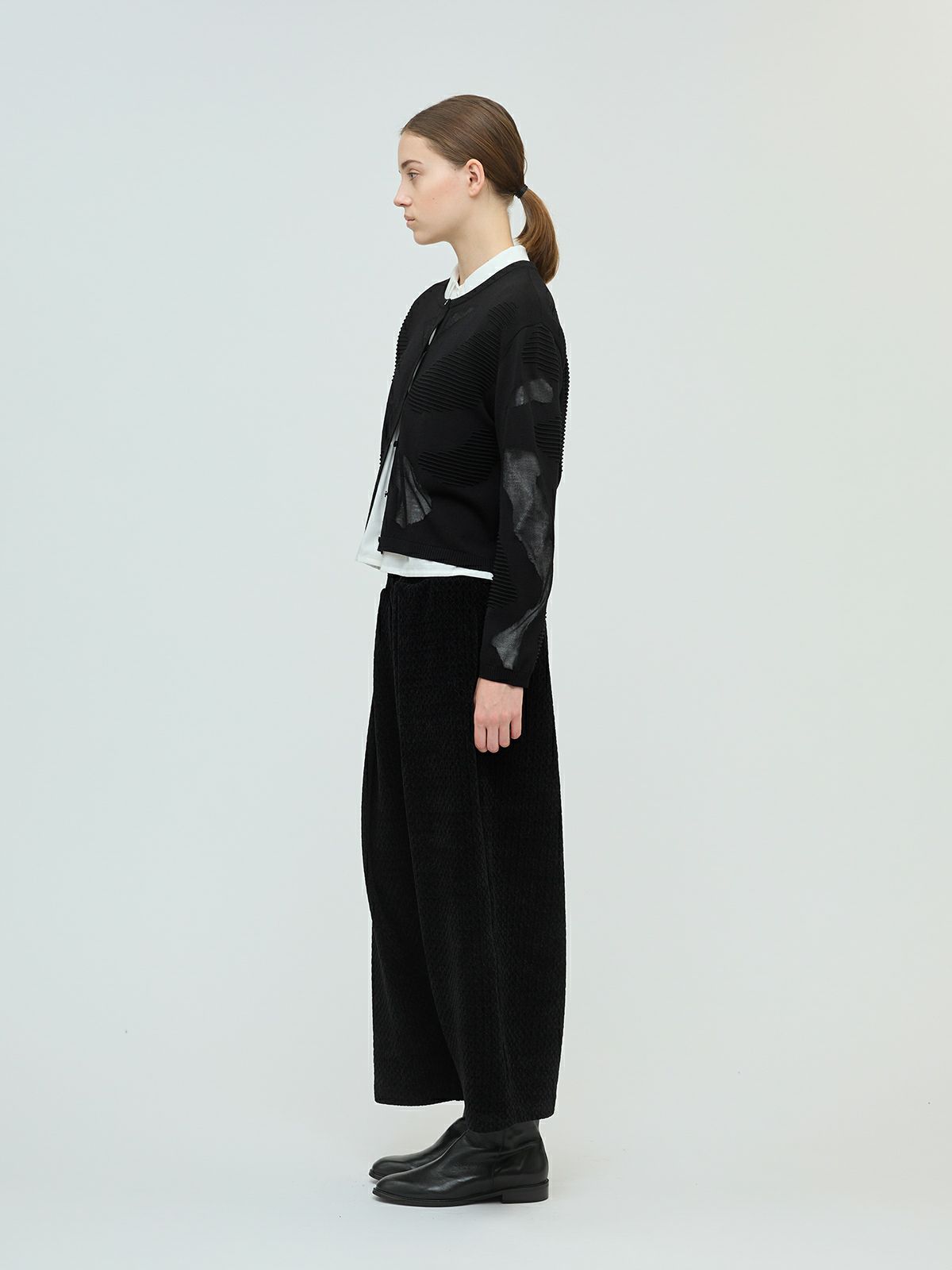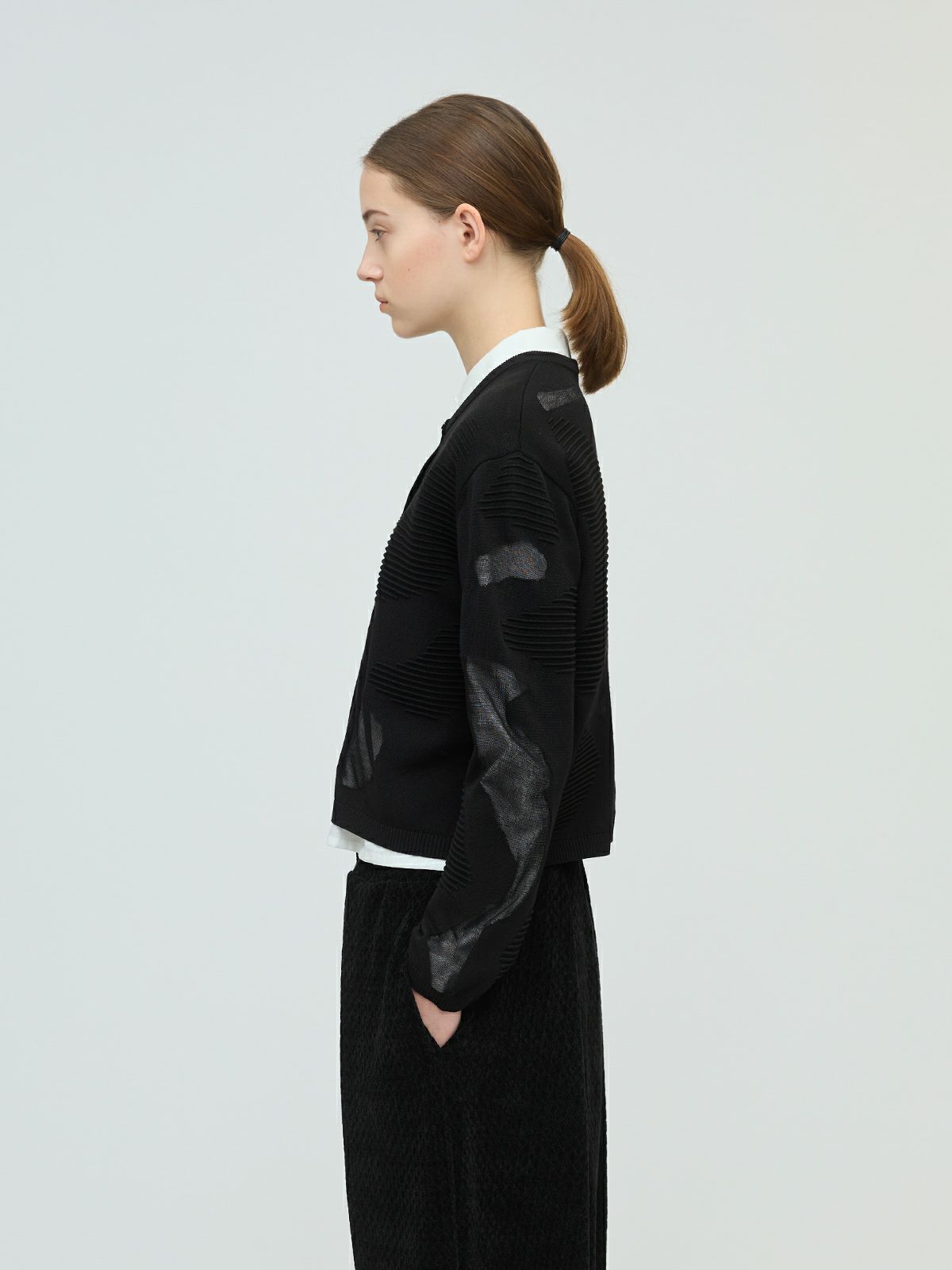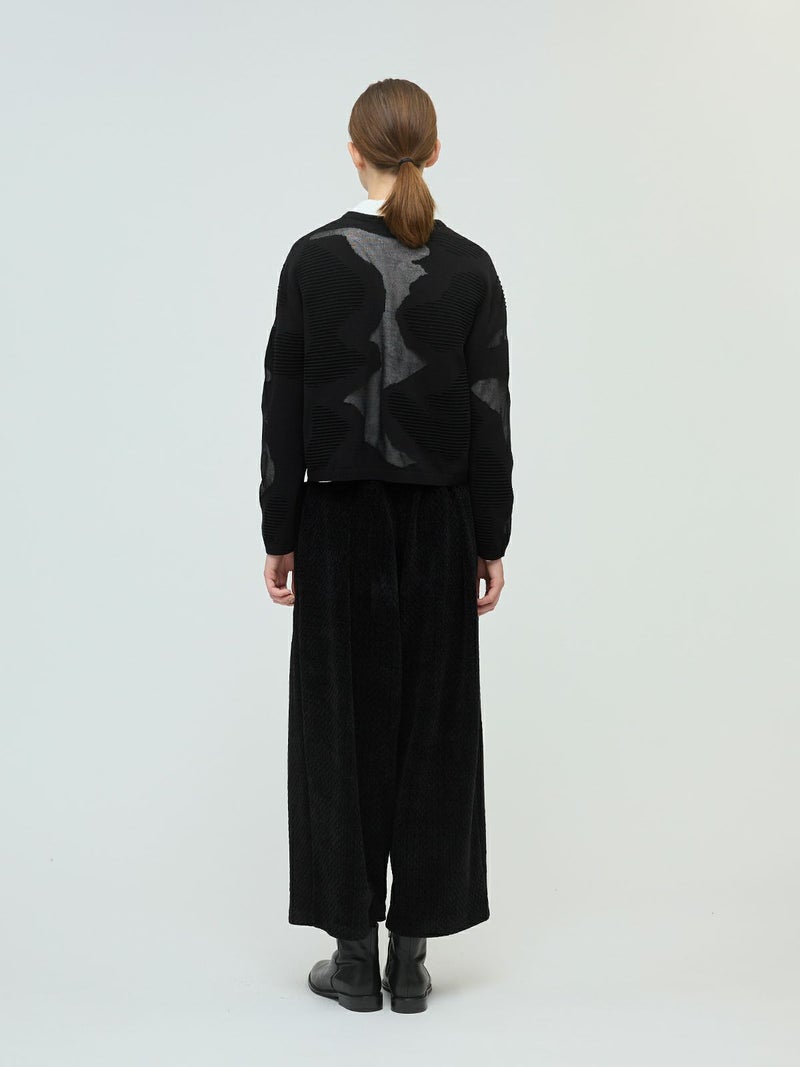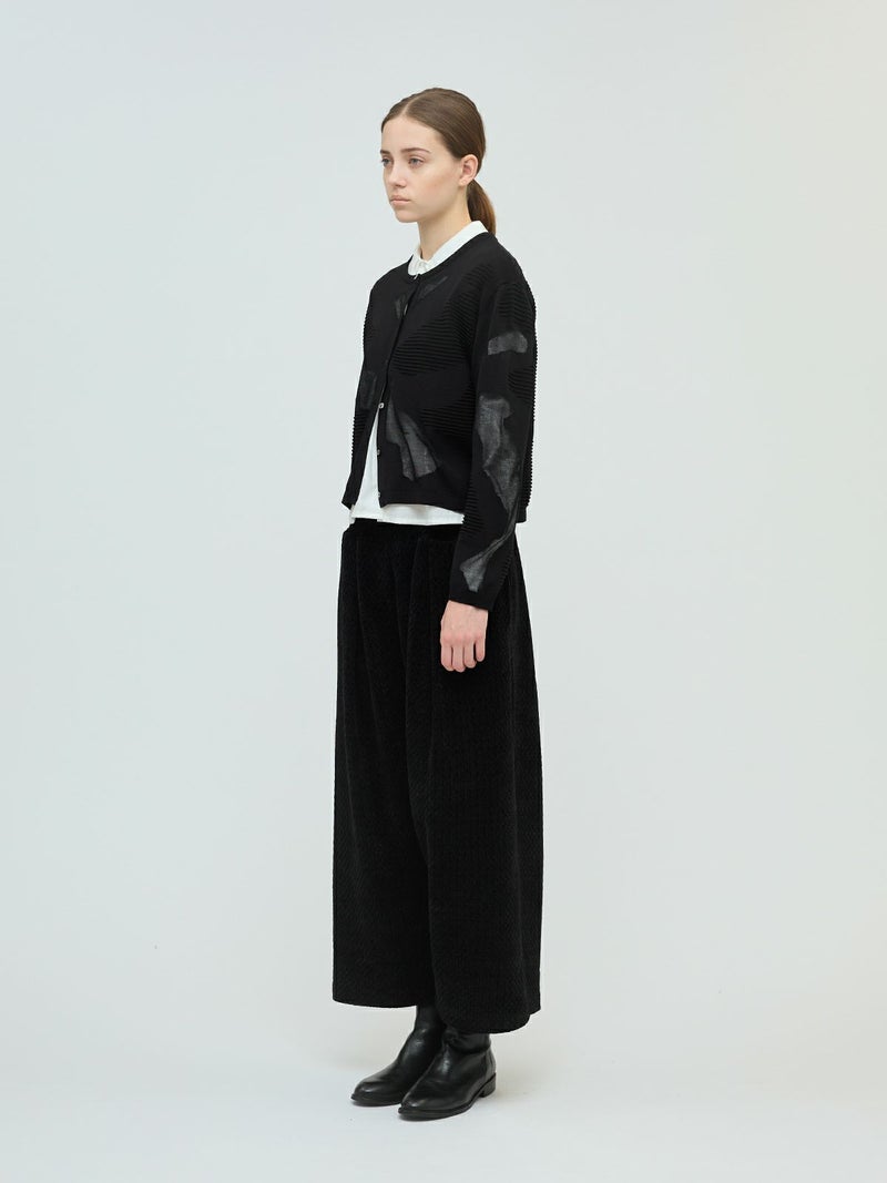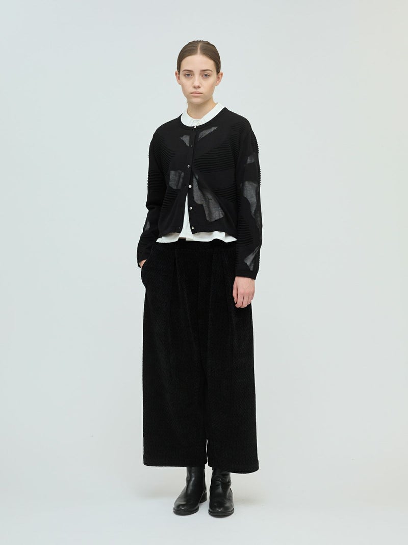 ニットの立体感と透け感のあるデザインがMIXした柄編み模様が特徴のシアーパターンカーディガンです。透け感のある部分のデザインは糸を変えて作っており、細部に拘りを感じさせてくれます。ヒップ上のすっきりとした丈感を表現。ネイビーとブラックの2色に絞ったカラー展開なのでどちらもシックな雰囲気を演出します。透け感があるのでインナーを敢えて別カラーにすることで、シアー模様がより印象的に映ります。同シリーズ3-220098/シアーパターンチュニックも展開。
