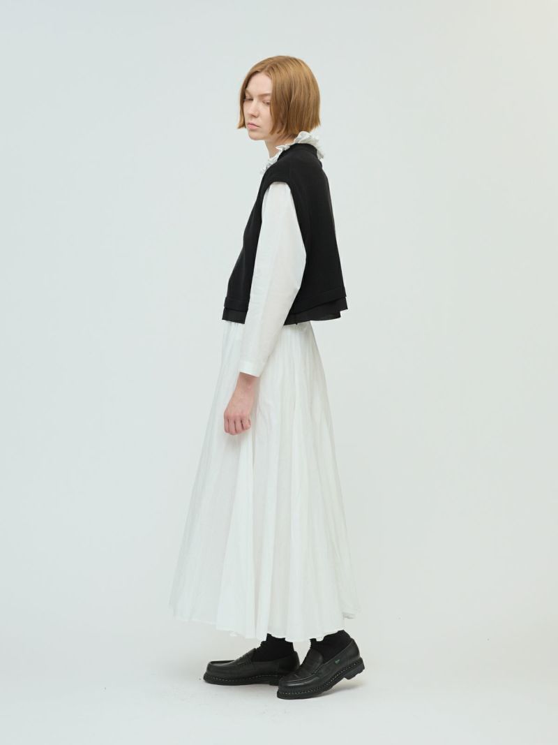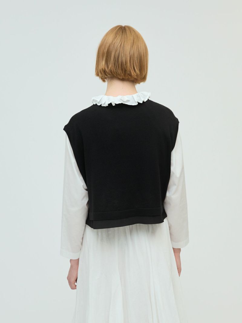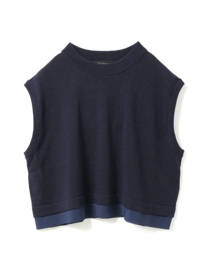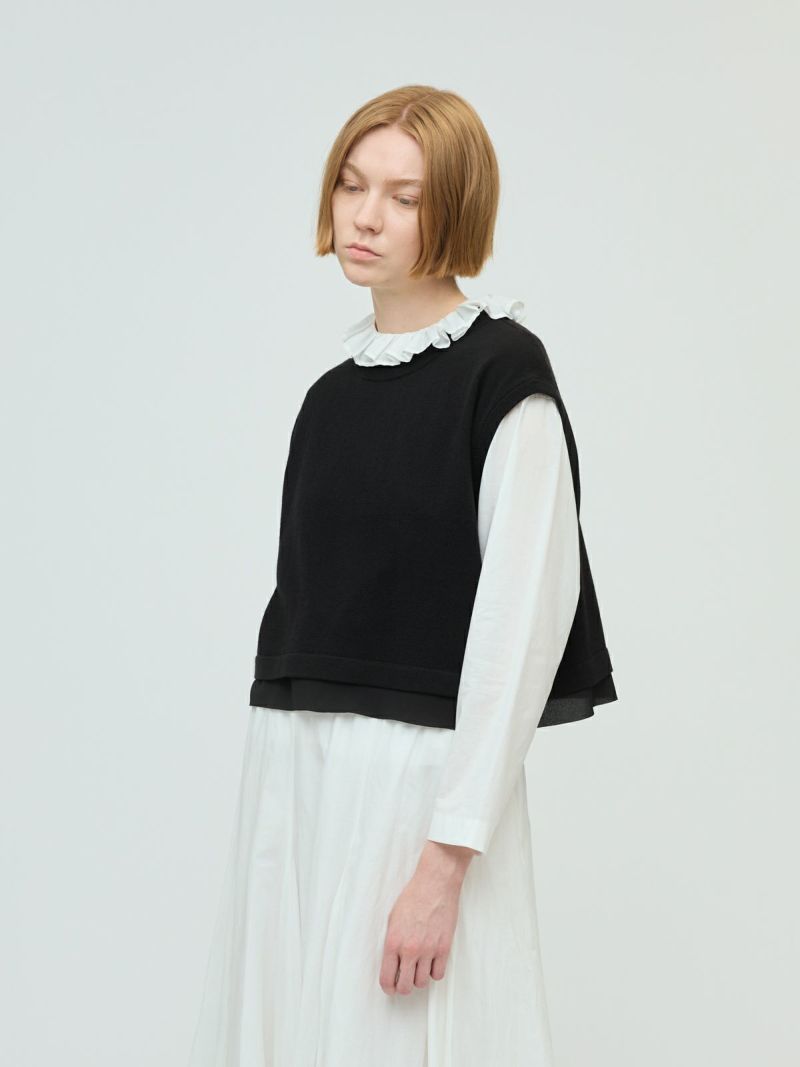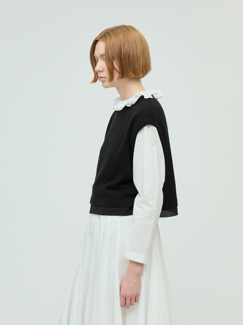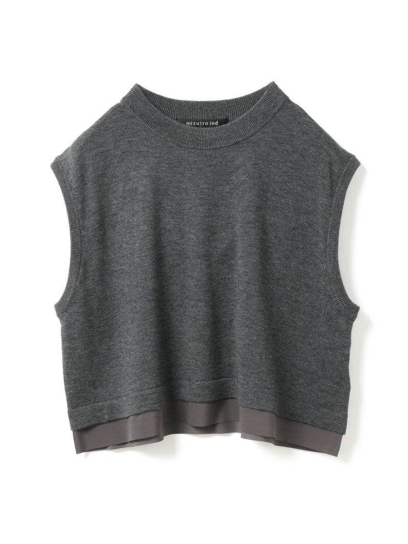 ニット×ジョーゼット(布帛)素材を組み合わせたシフォンフリルヘムベストです。レイヤードライクな印象を演出できるデザインで同シリーズ3-220111/シフォンフリルVネックカーディガンも展開。ベストは裾部分にジョーゼットを組み合わせたデザイン仕上げ。フレンチスリーブのように肩を包んでくれるので女性らしさがございます。アームも広く重ね着しやすいのもポイント。程よくゆとりのあるサイズ感でスッキリ丈。甘くなりすぎないmizuiro indらしいフリルを提案した1枚です。