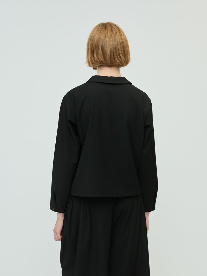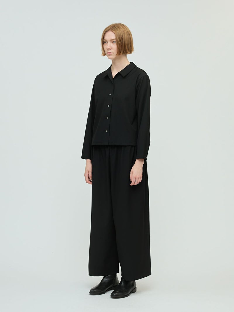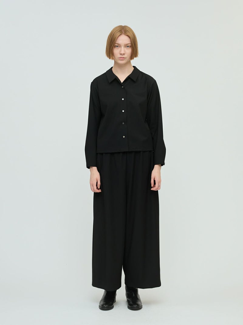ウールライクのさらりとした質感で、シワになりにくい素材を使用したT/Rベーシックシャツです。4WAYストレッチのきいた動きやすくシックに決まる1枚です。モード感のある雰囲気とスッキリとしたコンパクトシルエットを表現。同シリーズ3-260096/T/Rワイドイージーパンツとセットアップが可能です。