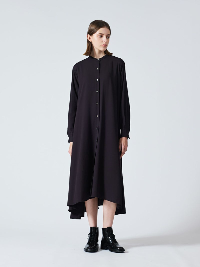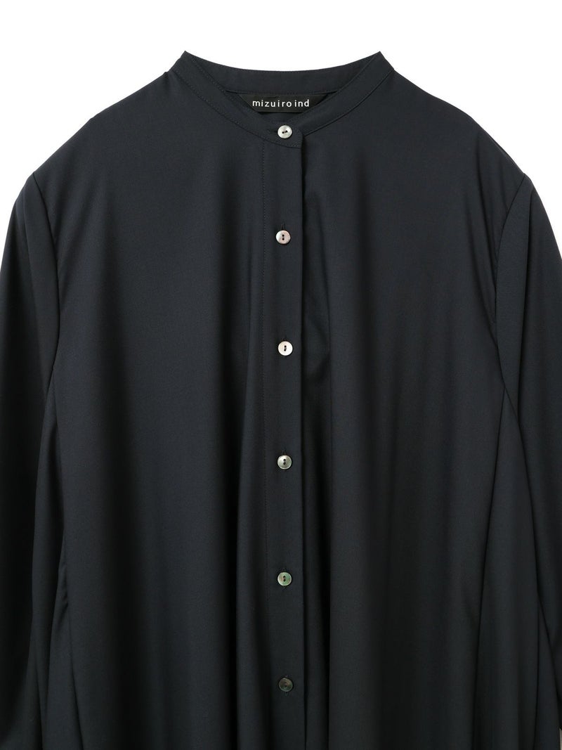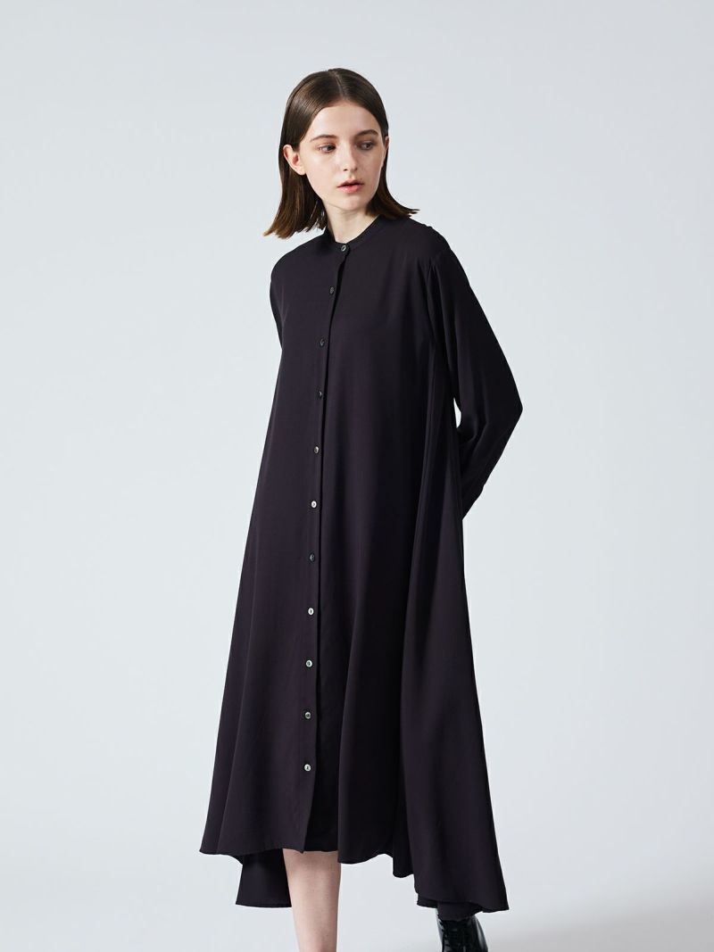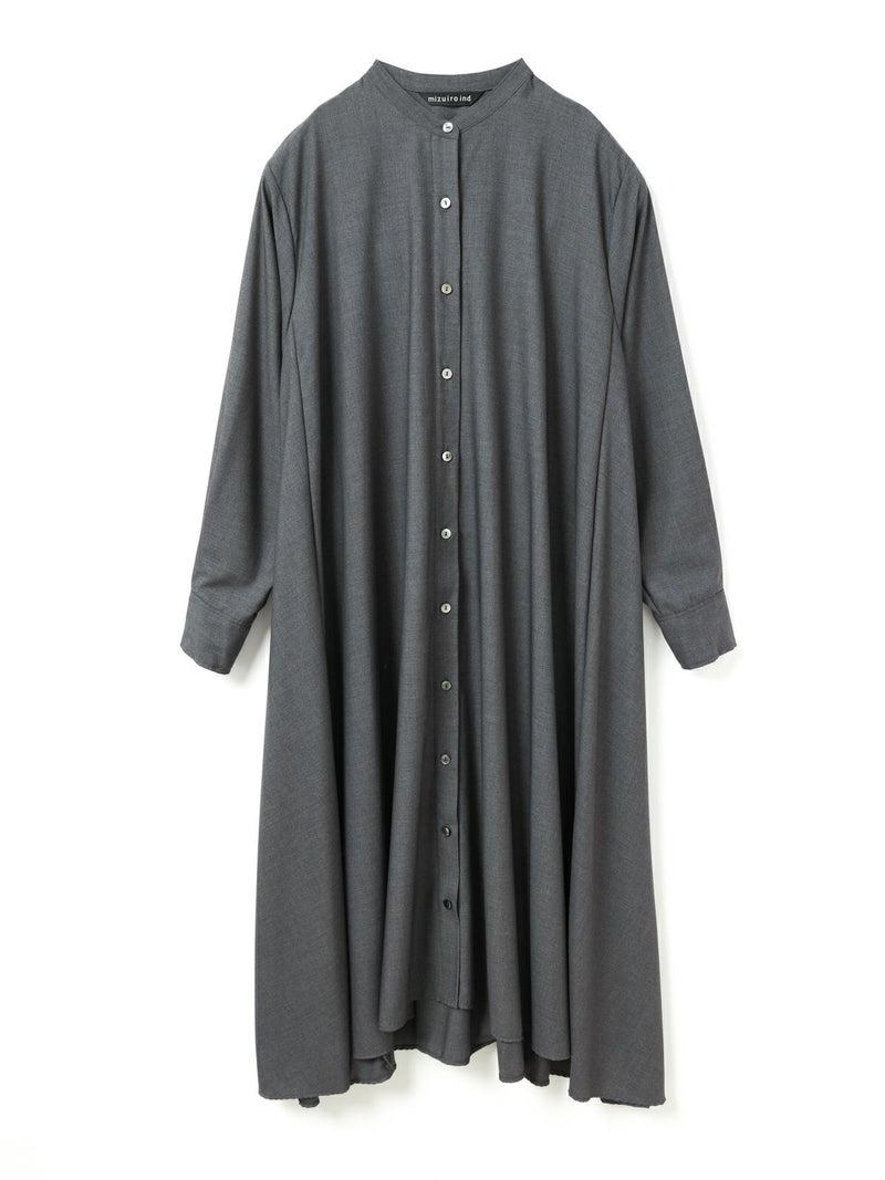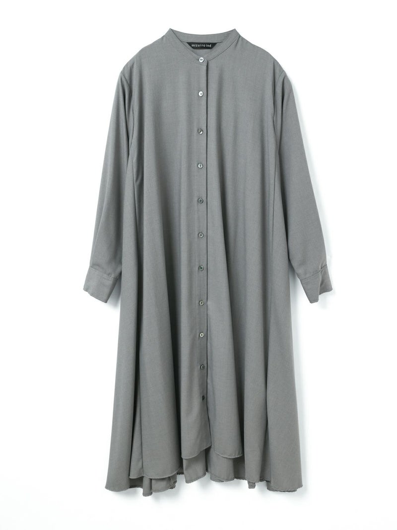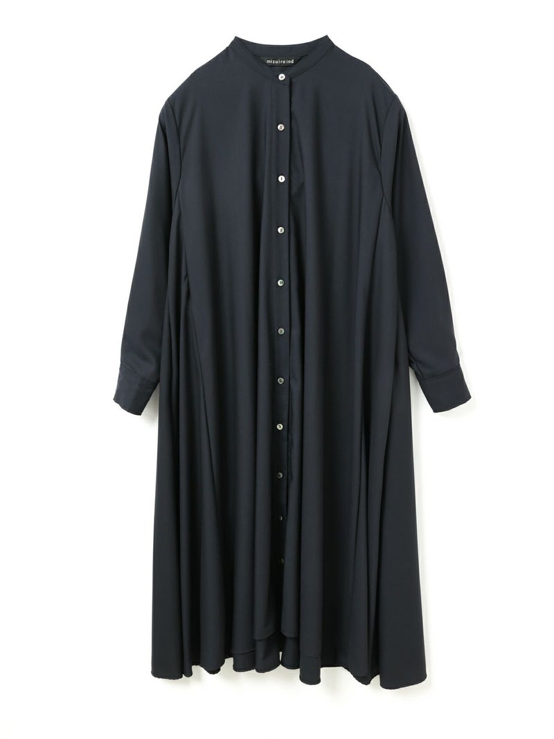 mizuiro ind定番のデザインで落ち感がきれいなT/Rスタンドカラーフレアシャツワンピースです。スッキリとしたスタンドカラーと綺麗に広がりのあるフレアラインが魅力的。若干の前後差を付けた裾のラインでパンツを穿いてコーディネートしても良く、フロントボタンを外して羽織でコーディネートしても素敵です。オケージョン対応も可能。長く人気のある1枚です。