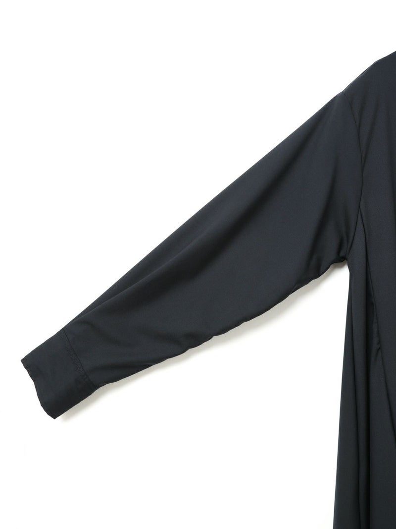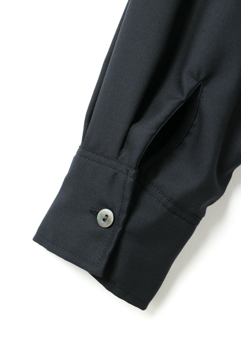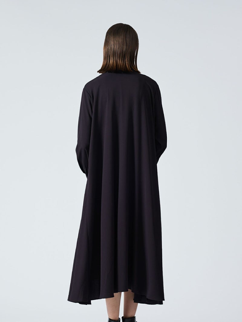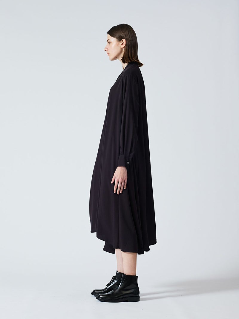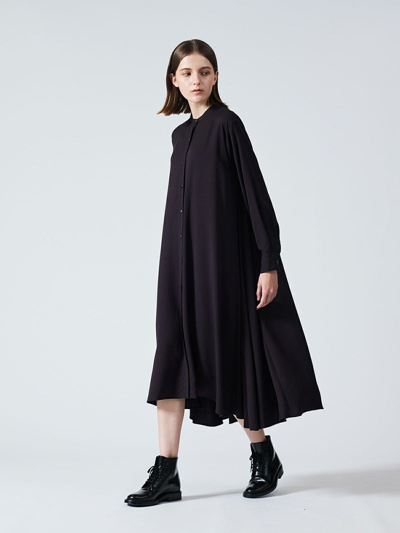 mizuiro ind定番のデザインで落ち感がきれいなT/Rスタンドカラーフレアシャツワンピースです。スッキリとしたスタンドカラーと綺麗に広がりのあるフレアラインが魅力的。若干の前後差を付けた裾のラインでパンツを穿いてコーディネートしても良く、フロントボタンを外して羽織でコーディネートしても素敵です。オケージョン対応も可能。長く人気のある1枚です。