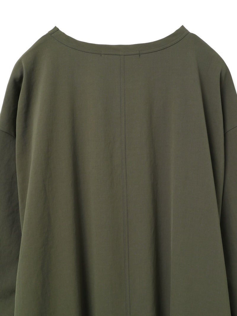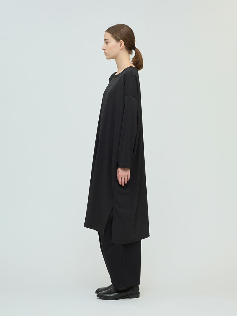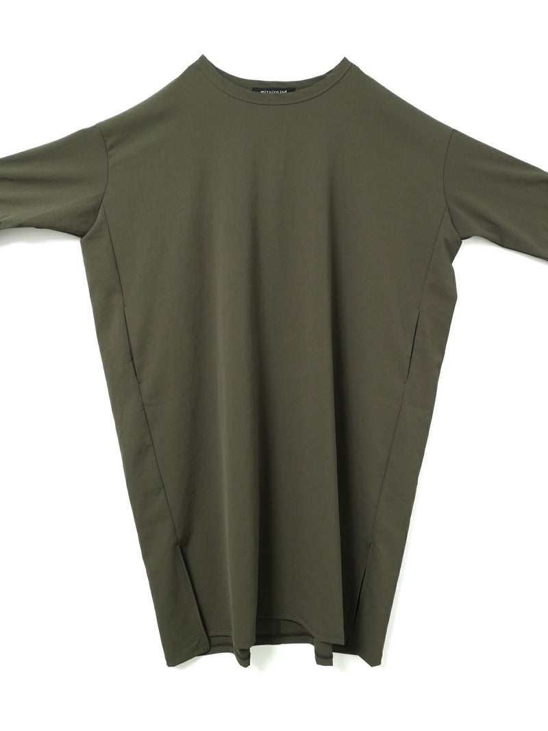 環境にやさしい再生ポリエステル糸を使用したクルーネックロングワンピースです。布帛カットソー縫製でハリ・シボ感のある生地で、清涼感を持ち合わせた晩夏の気温の高い時期にも着用しやすい1枚です。クルーネックのシンプルなデザインワンピースで、足元までのストンとしたロング丈を表現。前後差を付け、サイドスリットが入っているので足さばきが良いのもポイント。ボトムを合わせてmizuiro indらしい着こなしを演出していただけます。シックな3色のカラー展開です。