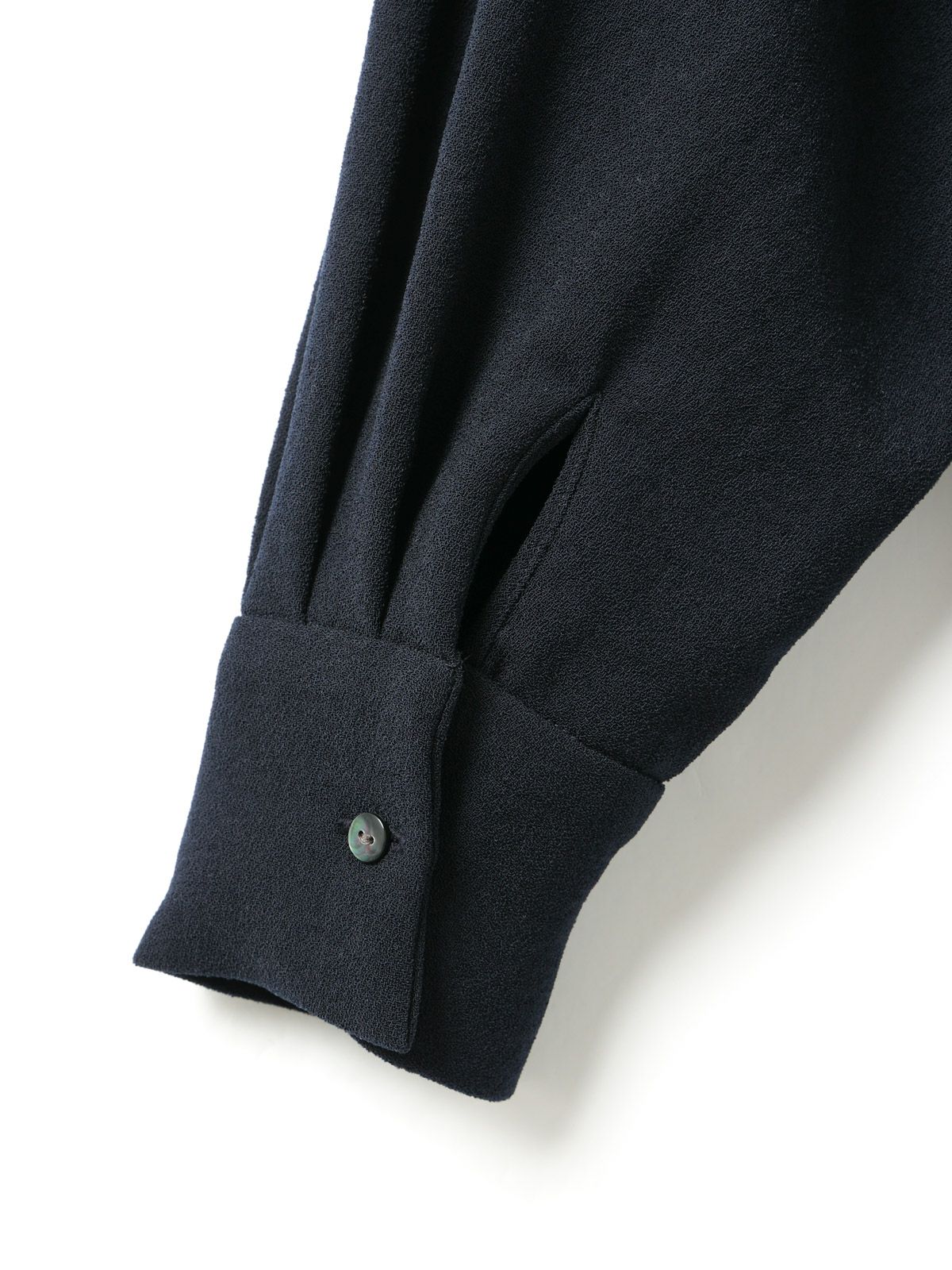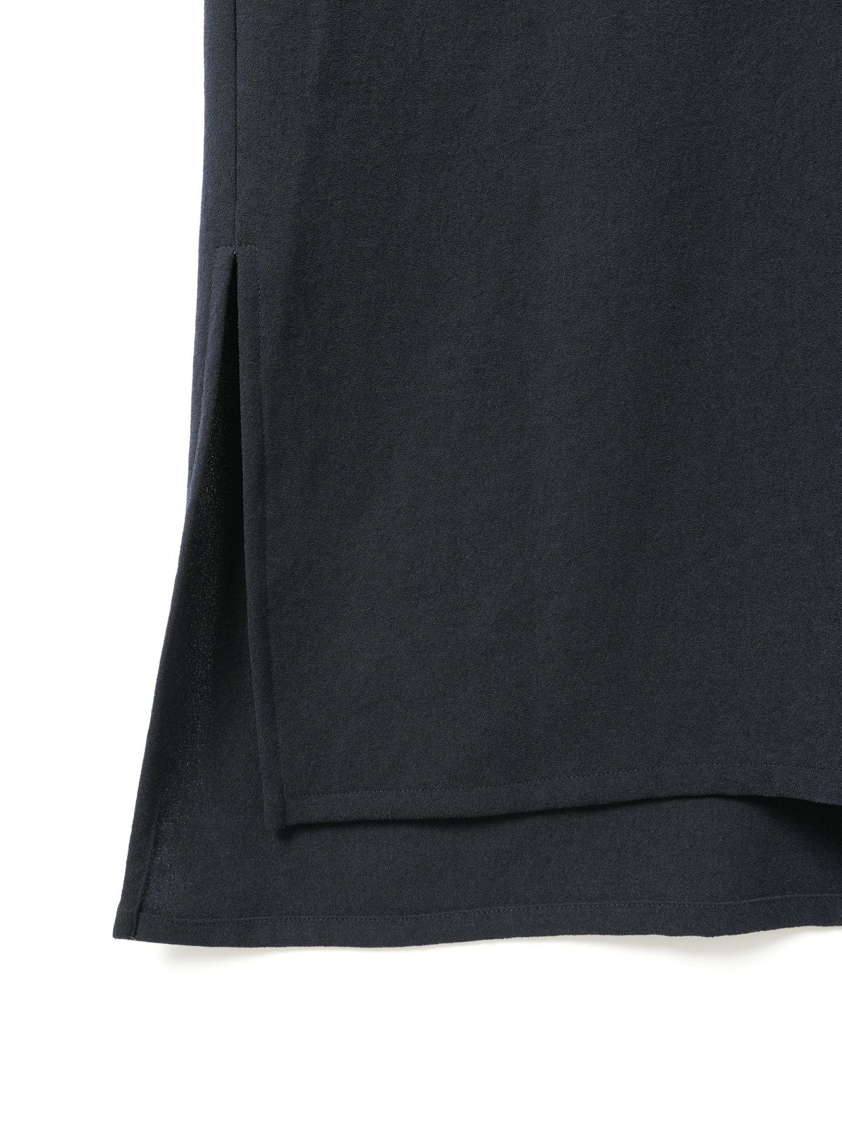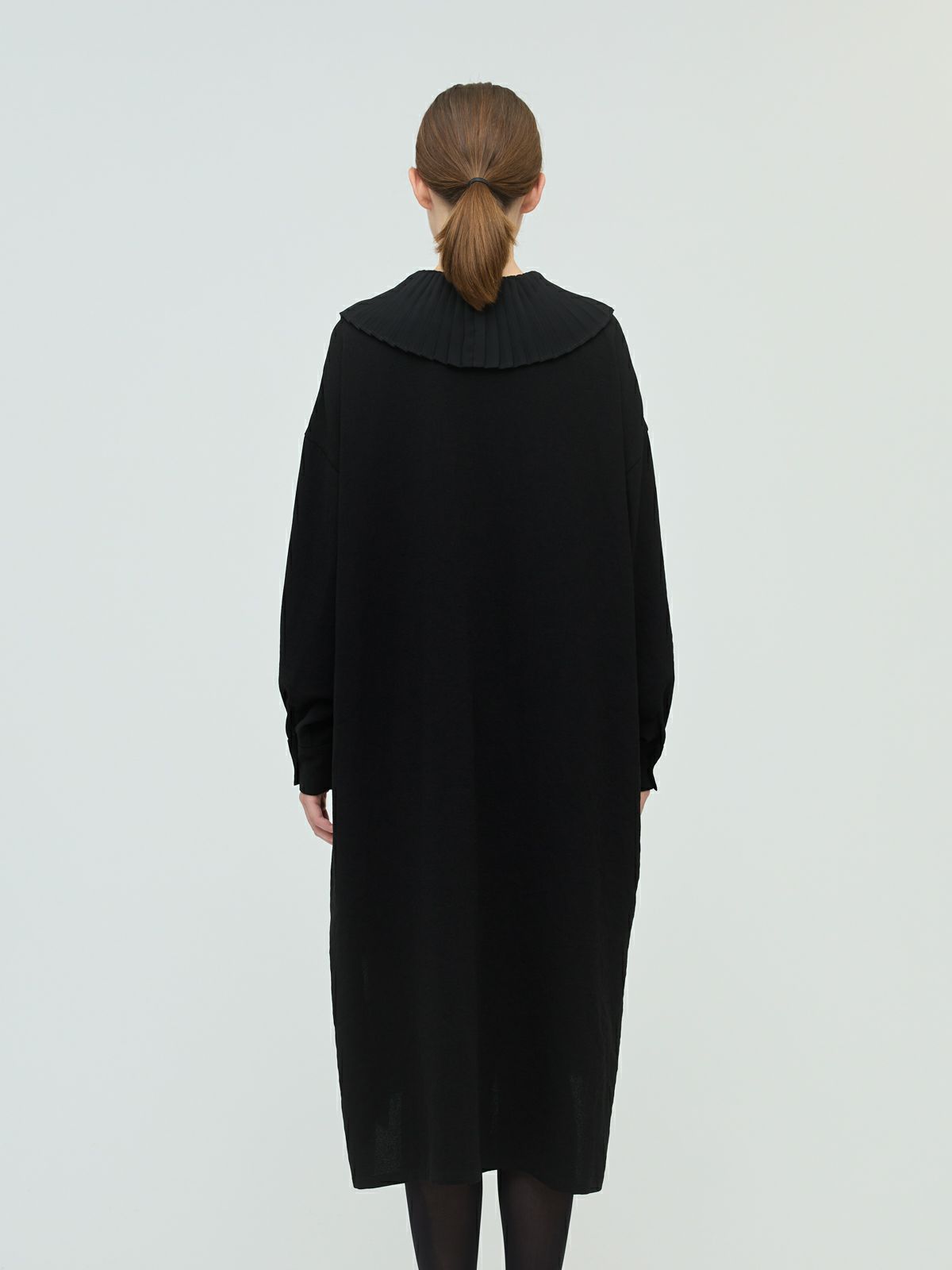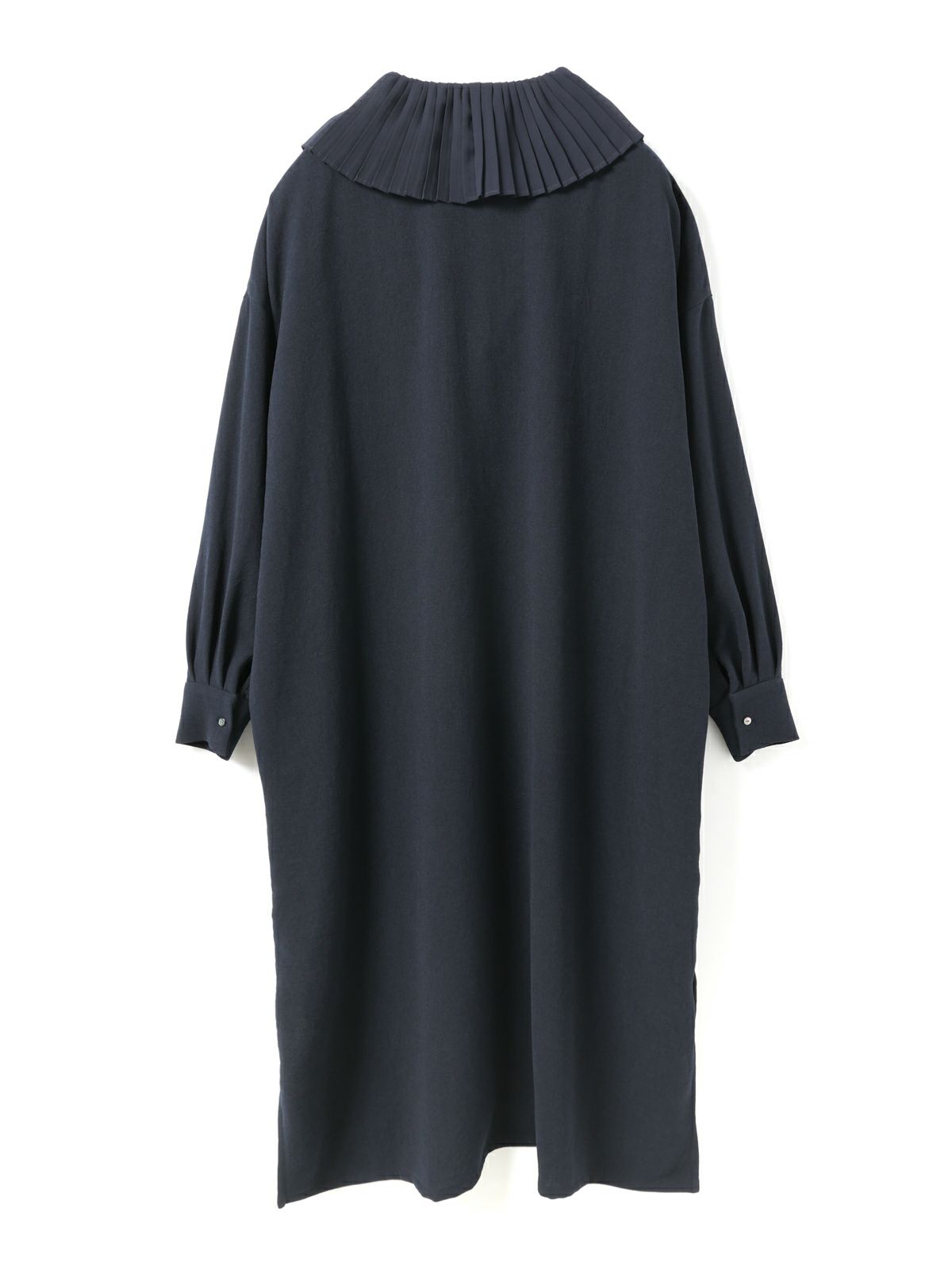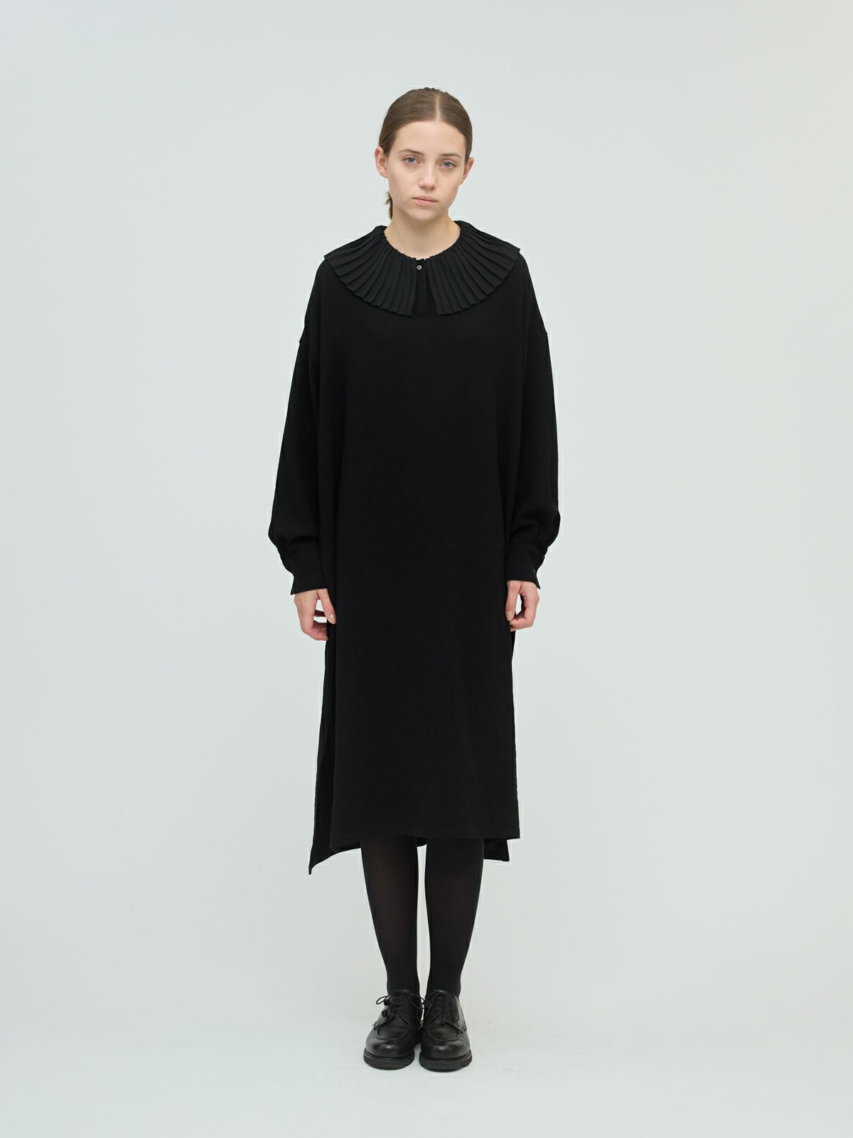 プリーツカラーの襟元が印象的なプリーツカラーワンピースです。モードな着こなしもエレガントな雰囲気も持ち合わせた上品な1枚です。襟元は隠れボタンのポロシャツタイプで着脱のしやすいデザイン。若干の前後差が付いておりサイドスリットが入っています。すっきりとしたワントーンのシックなデザインなので、オケージョン対応にもお勧め。プリーツカラーを出して重ね着をすると華やかな印象になり素敵です。同シリーズ3-230085/プリーツカラーシャツプルオーバーも展開。