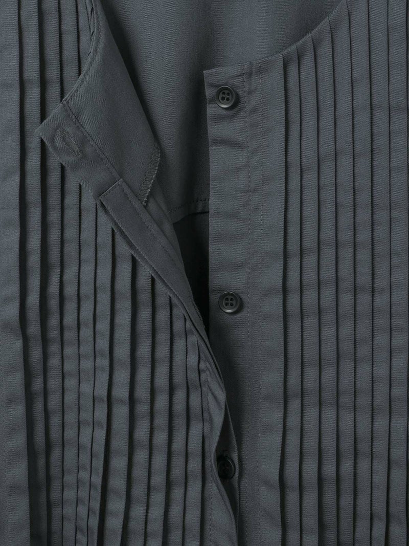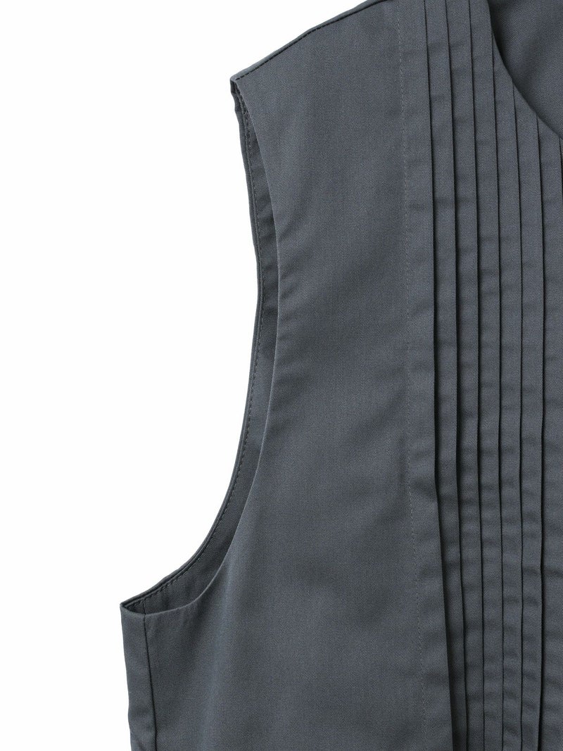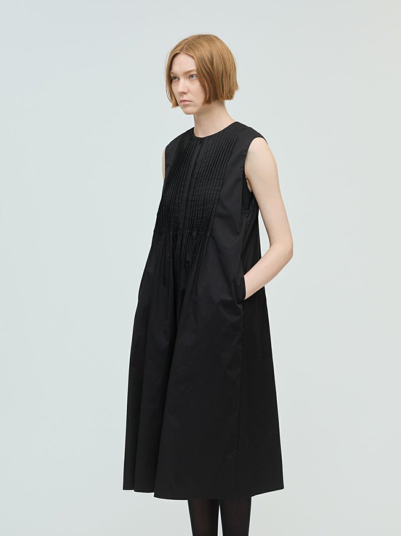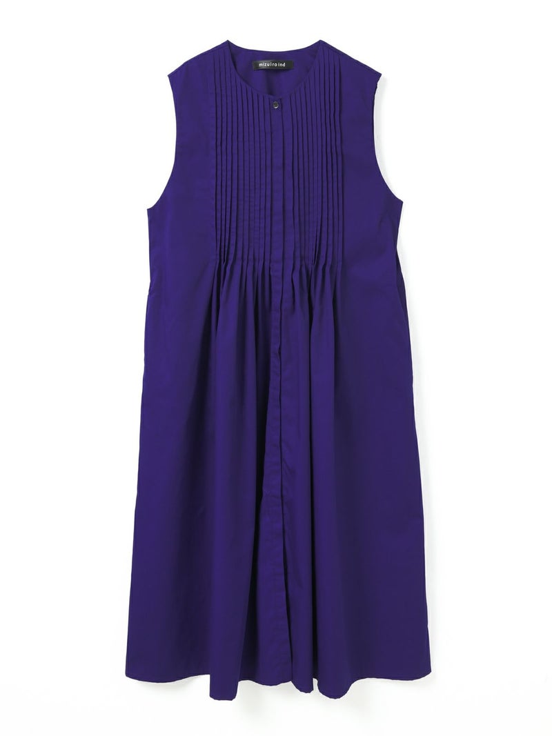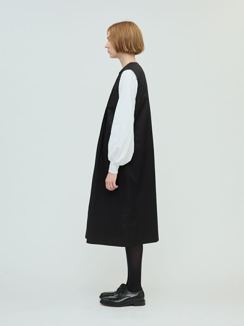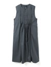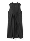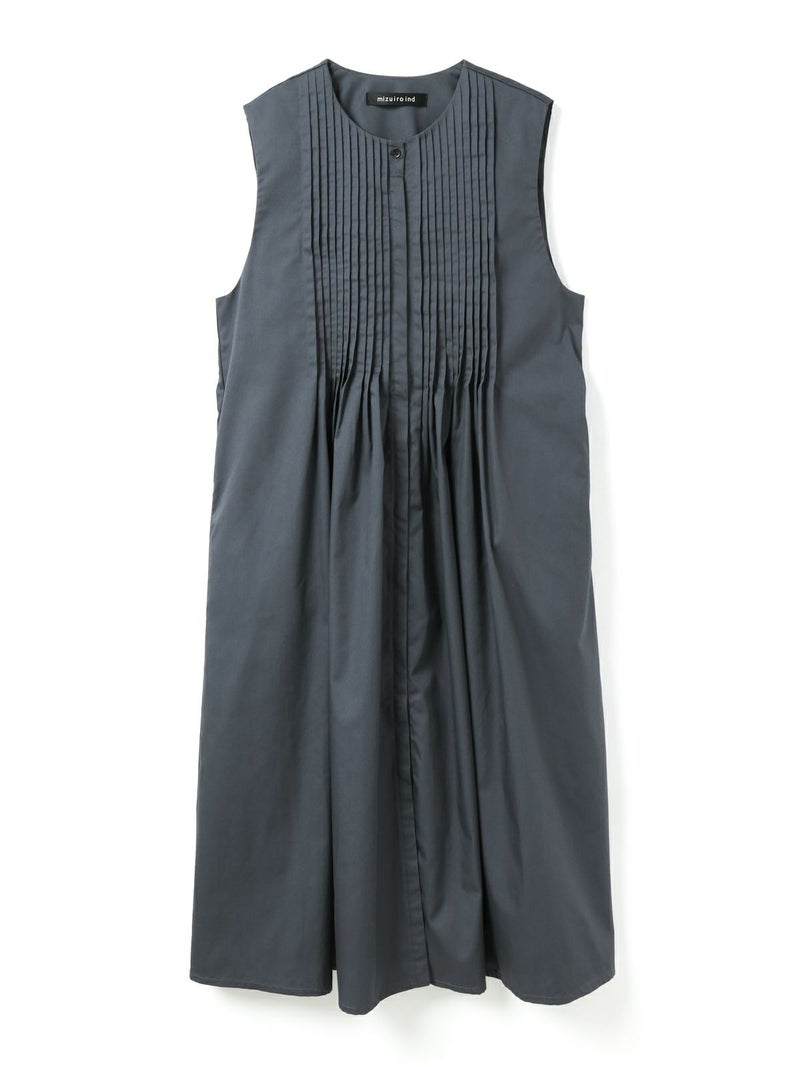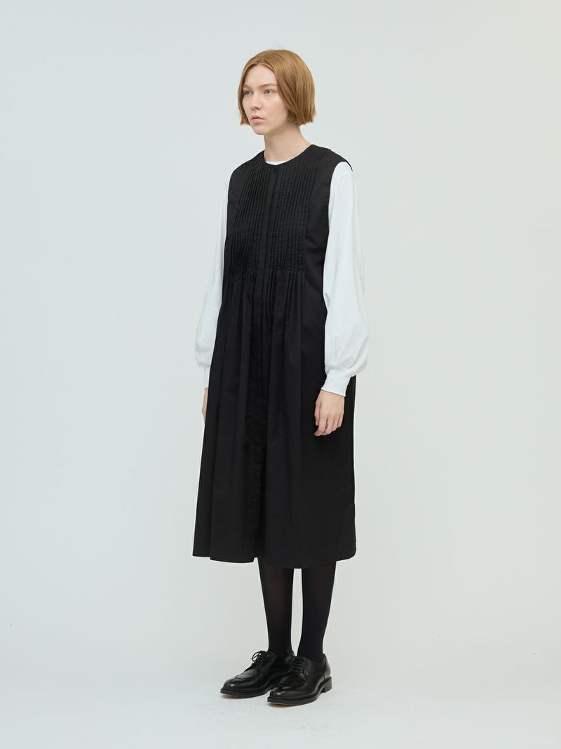 ジレにでもワンピースにでも着用可能なクルーネックピンタックワンピースです。フロントに施したピンタックが特徴的。ウエスト切替からタックが多く入っているのでフンワリ感のある女性らしい1枚となっています。フロントボタンは閉めてノースリーブのワンピースとして暑い季節にも着用可能。ジレとしてコーディネートに重ねて雰囲気を変えるのも素敵で、季節が進んでも長袖での着こなしも魅力的に演出できる1枚です。