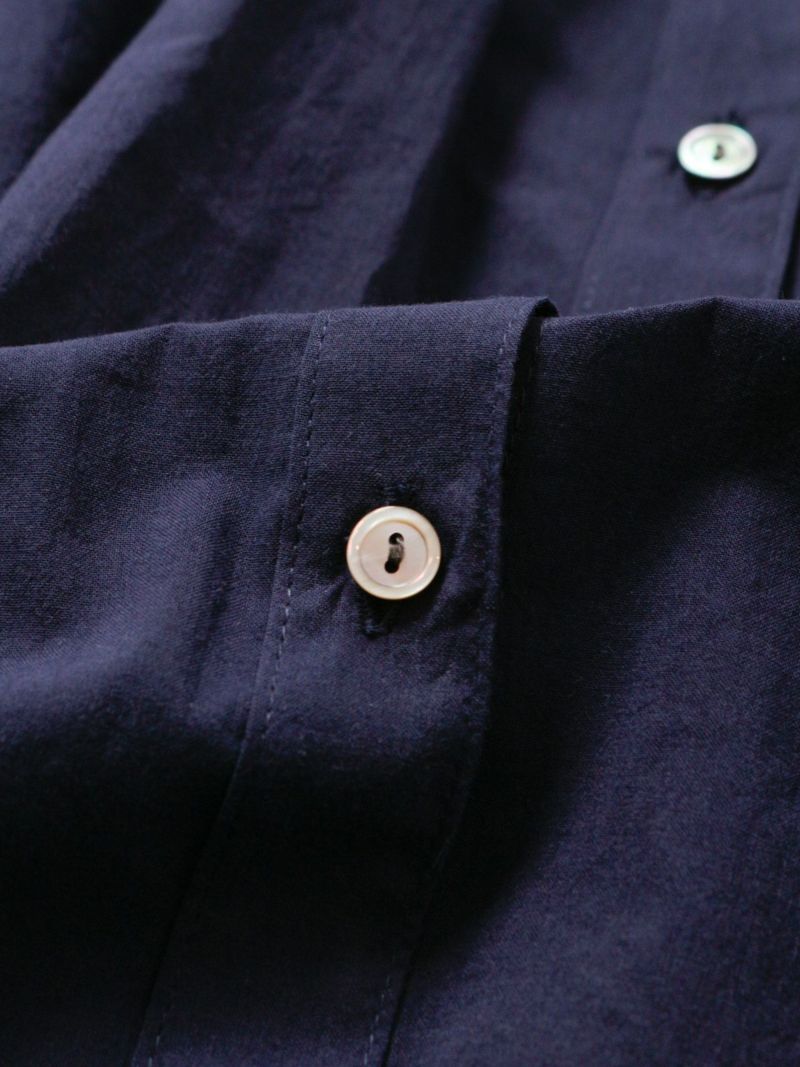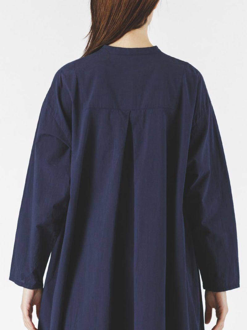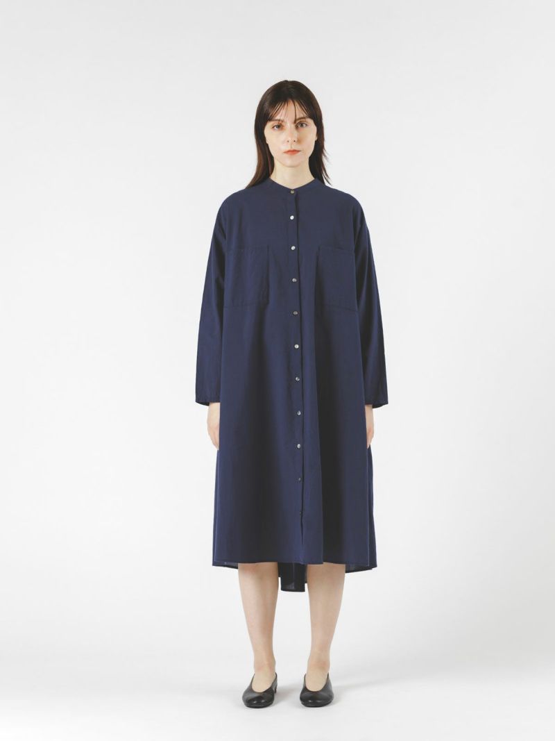 mizuiro indの定番型ワンピース、60ローンの素材を使用したポケット付バンドカラーロングワンピースです。大きな胸のポケットが特長。スッキリ感のバンドカラーの襟元から膝下までのフレアラインがキレイなシルエットで、背中にタックを施した動きのあるシルエットを表現しました。レイヤードアイテムとしてもお勧めの1枚です。着心地のよいコットン生地で、気温の変化によって中に重ね着ができ、上からカーディガンを合わせたりと、長く愛用して頂けるワンピースです。