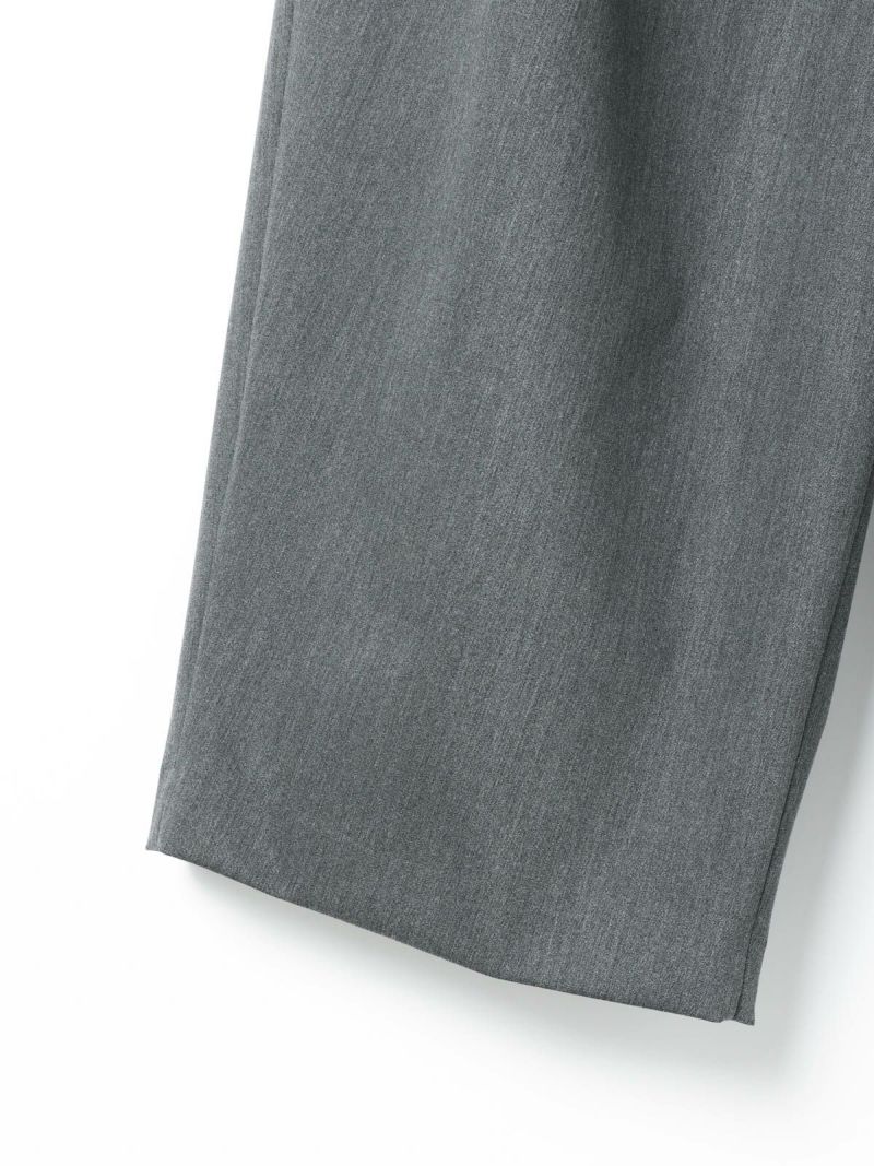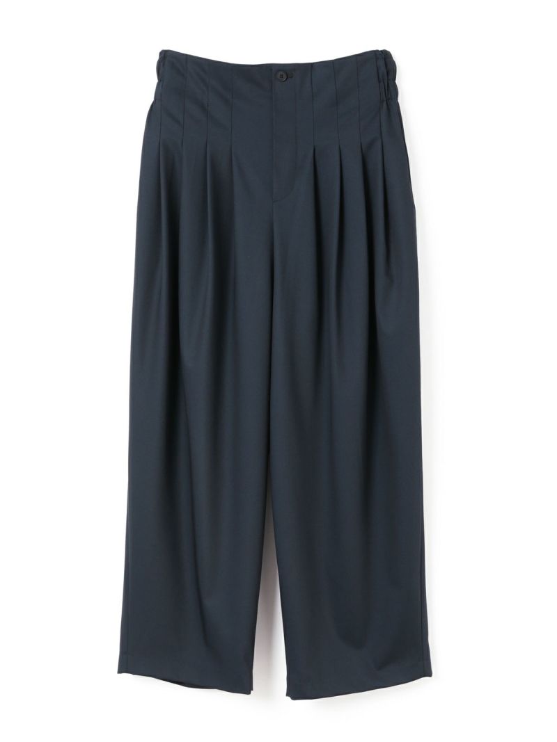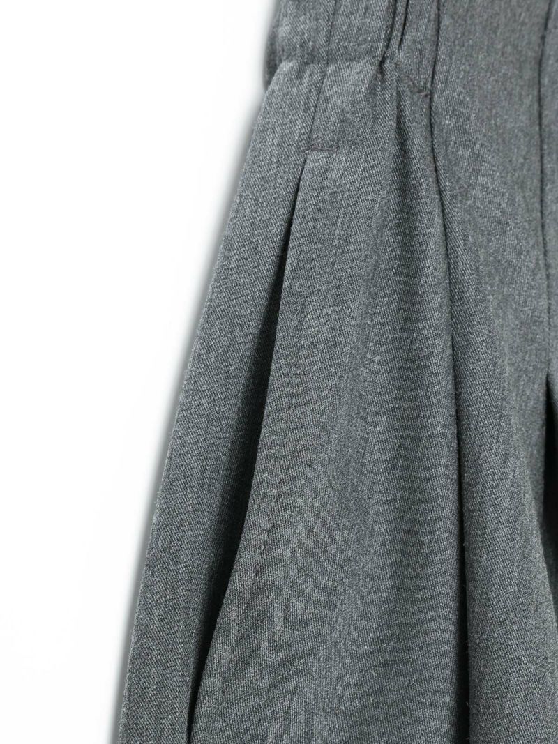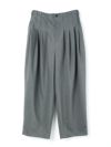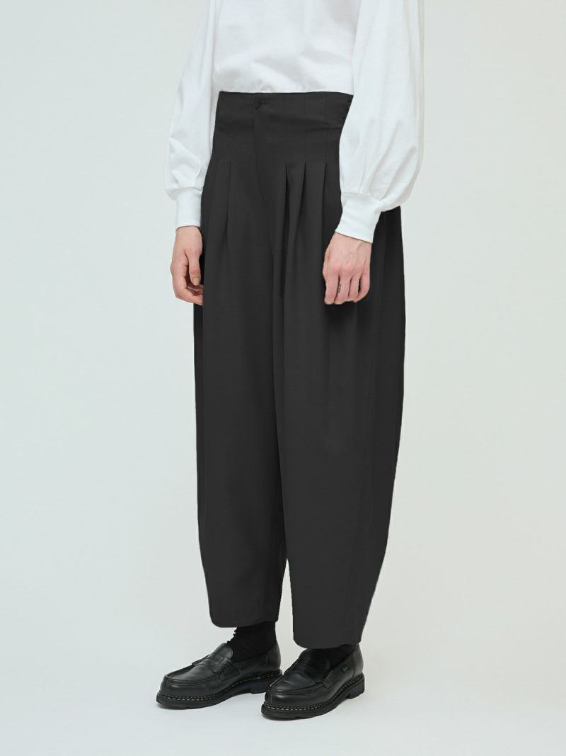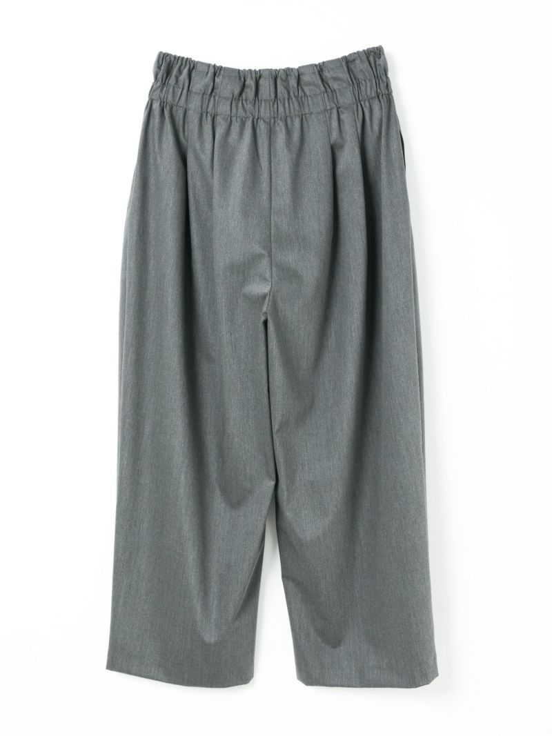 25春夏から人気のスムースでなめらかな素材を使用したハイウエストタックパンツが秋冬展開で新登場。きれいめのハイウエストタックパンツで、タックは腰位置より下からデザインしておりウエスト前すっきり、後ろギャザーデザインが特徴。メンズトラッドをざっくりと穿いたようなラフさもありながらきれいめに着用できるパンツを表現しました。シャツインもしやすいデザインで内紐が付いているのでウエストキープしてくれます。ストレッチのきいた穿きやすい1枚です。