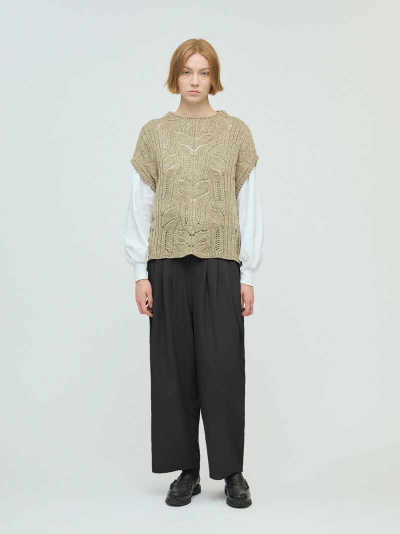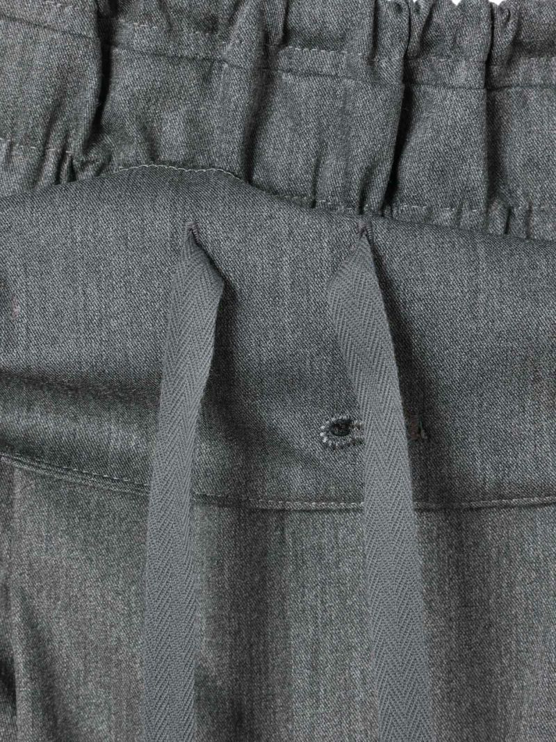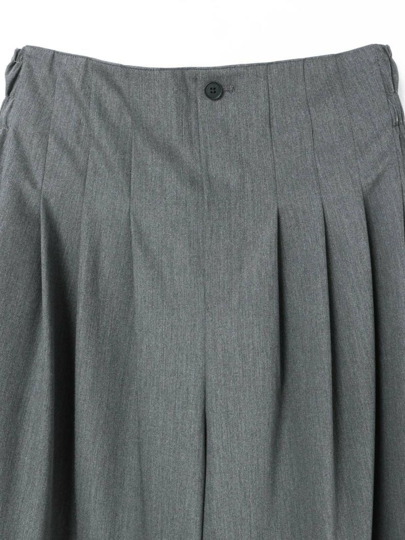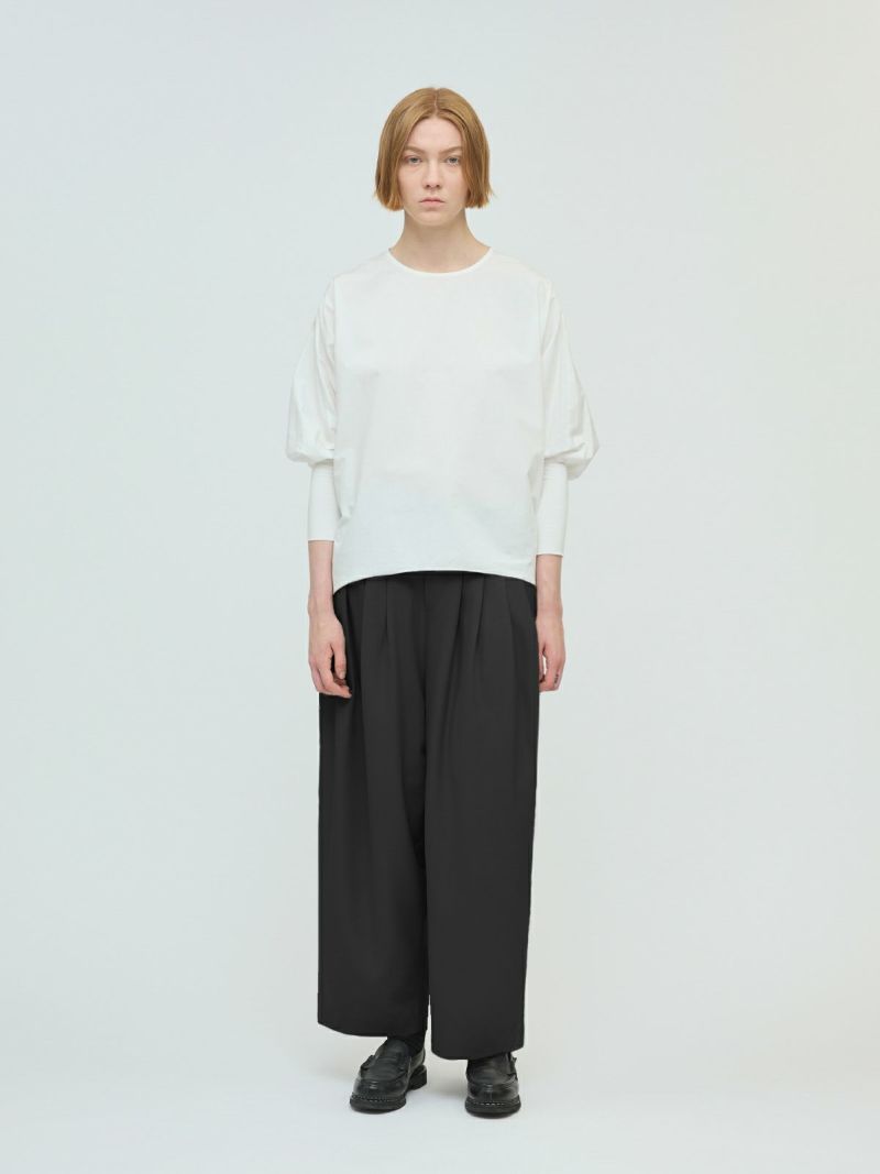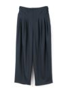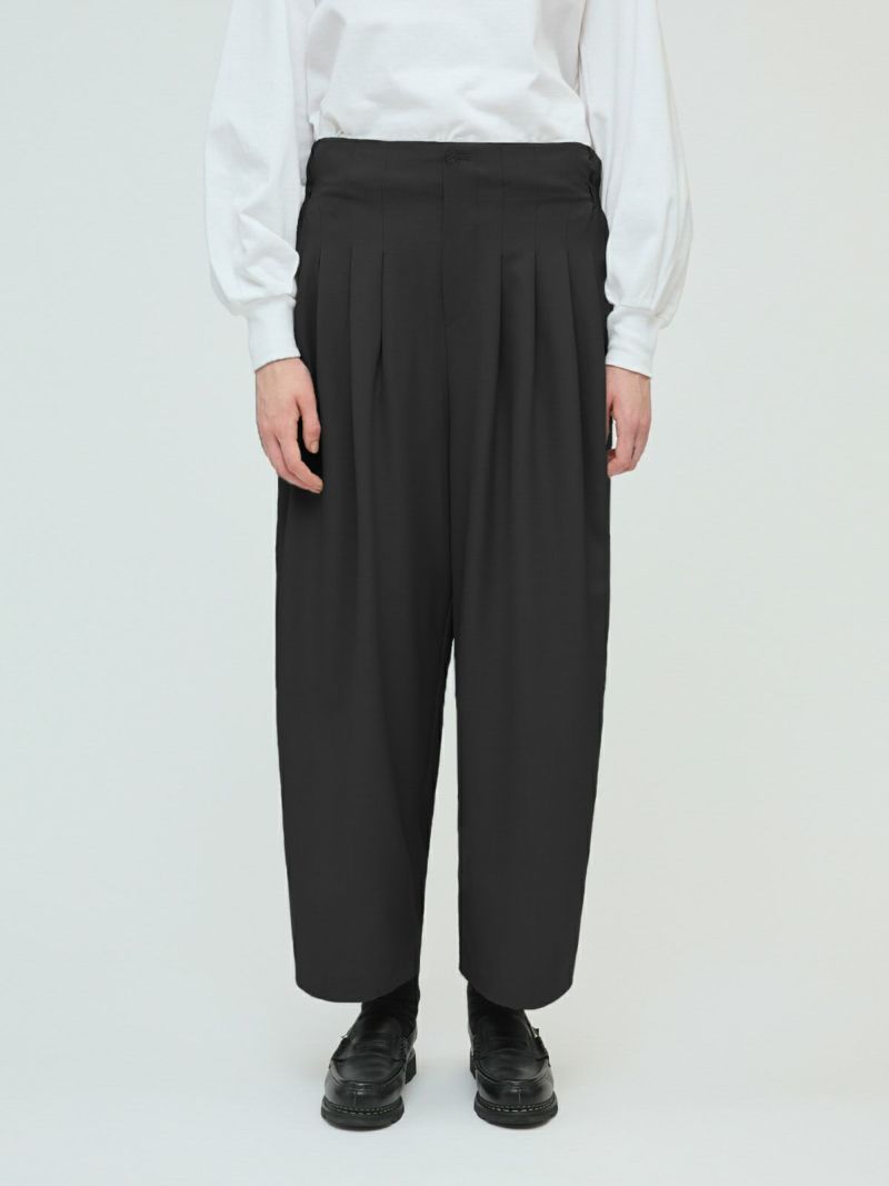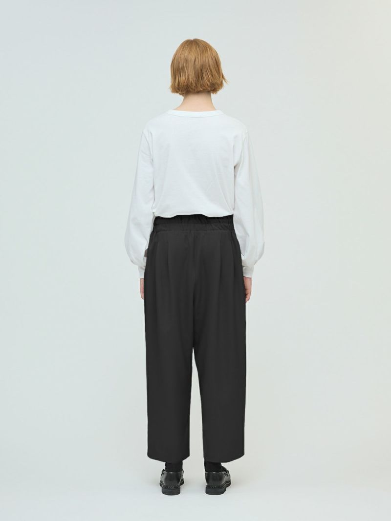 25春夏から人気のスムースでなめらかな素材を使用したハイウエストタックパンツが秋冬展開で新登場。きれいめのハイウエストタックパンツで、タックは腰位置より下からデザインしておりウエスト前すっきり、後ろギャザーデザインが特徴。メンズトラッドをざっくりと穿いたようなラフさもありながらきれいめに着用できるパンツを表現しました。シャツインもしやすいデザインで内紐が付いているのでウエストキープしてくれます。ストレッチのきいた穿きやすい1枚です。