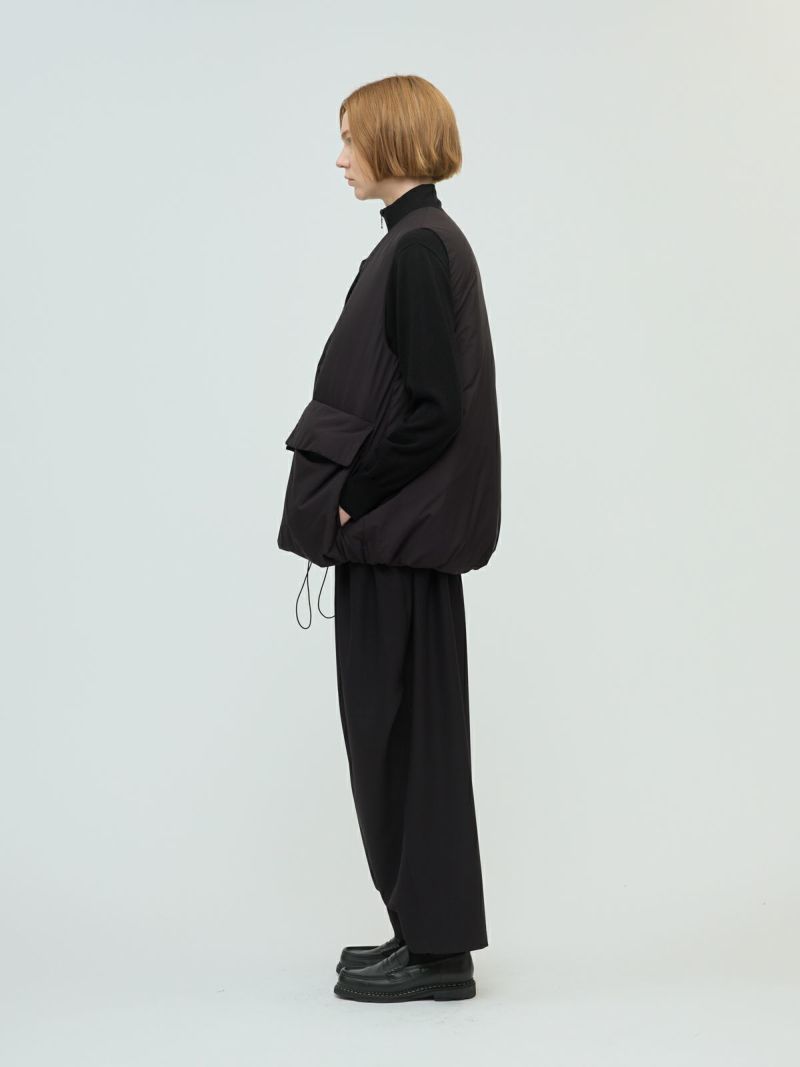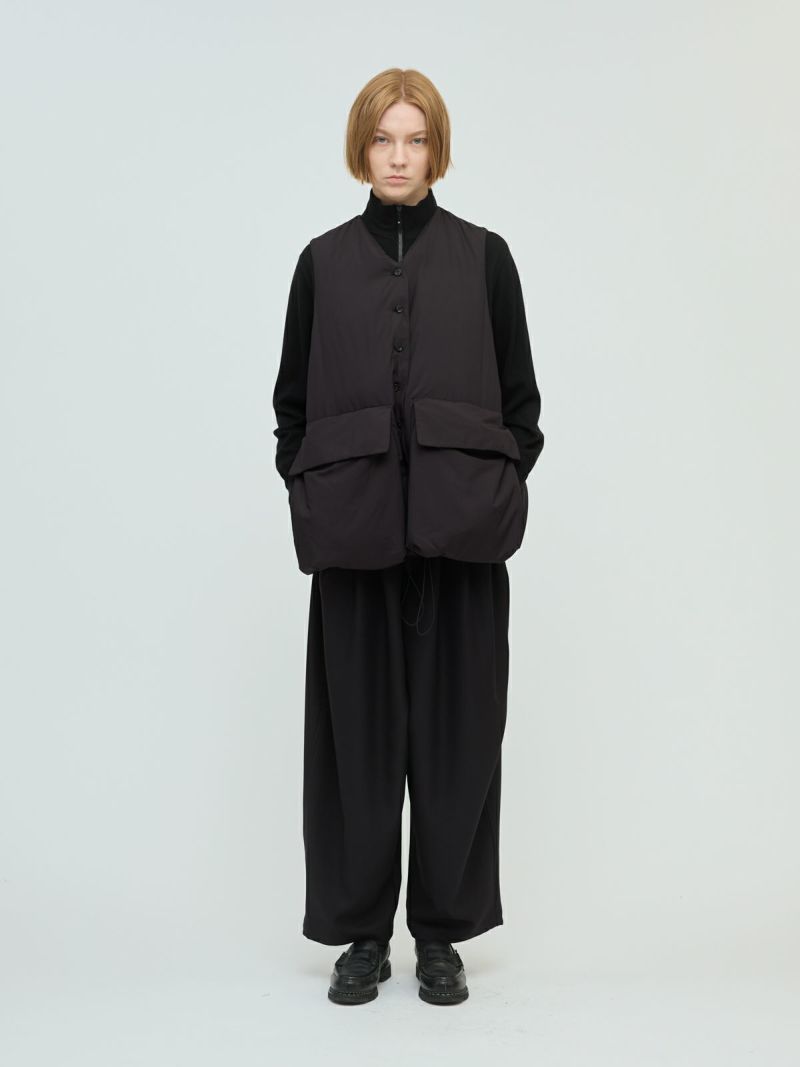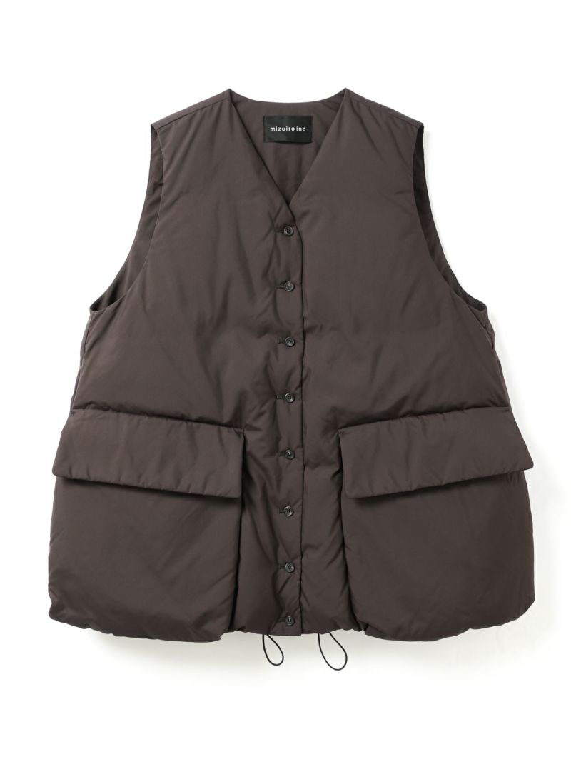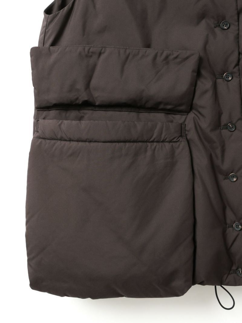 大きなポケットが特徴のダウンベストです。その下にはフロントポケットとは別にサイドポケットもあり拘りのデザインに。Vネックからフロントボタン使用になっており、裾にかけボリューム感のデザインを表現しました。裾にはドロストコードが付いており絞ることで、立体的なシルエットを演出していただけます。スポーティなデザインでアクティブに動きやすいのもポイント。インナーの重ね着がしやすいのでコーディネートの調整もしやすい1枚です。