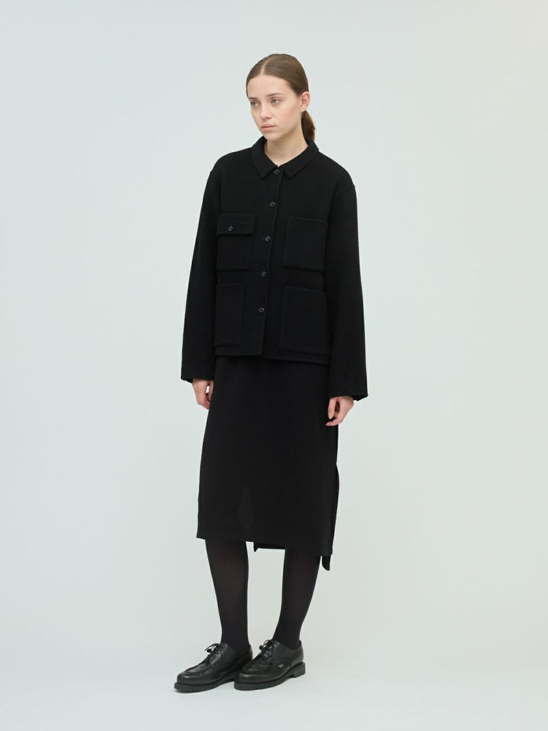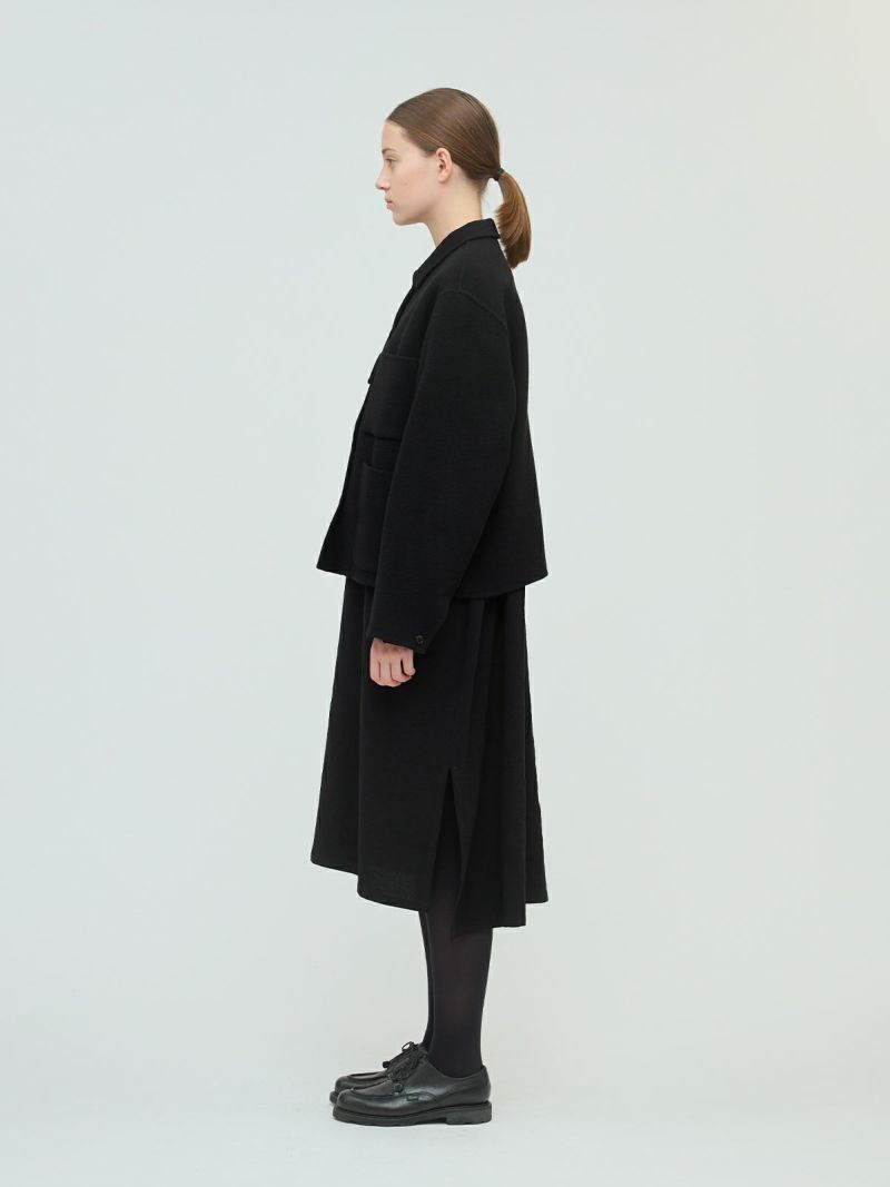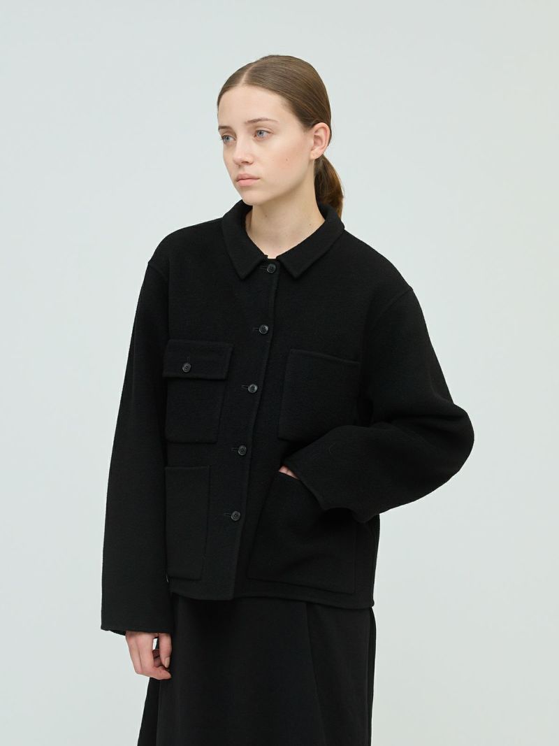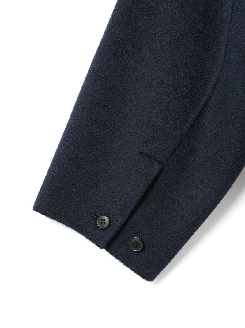 リバーフェイス素材を使用したウールユーティリティジャケットです。mizuiro ind新型のアウターで、メンズライクなカバーオールのデザインを表現しました。一枚仕立てで軽さと保温性の高さが魅力。手作業で縫い合わせた手間と時間がかかる、高級な仕立てで仕上げています。フロントボタン使用、フロントポケットが特徴的。ネイビーとブラックの2色に絞ったトラッドなアウターで長く愛用していただける1枚です。