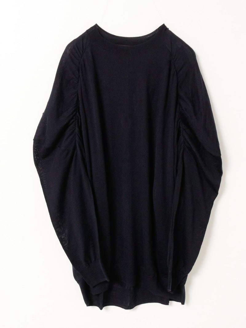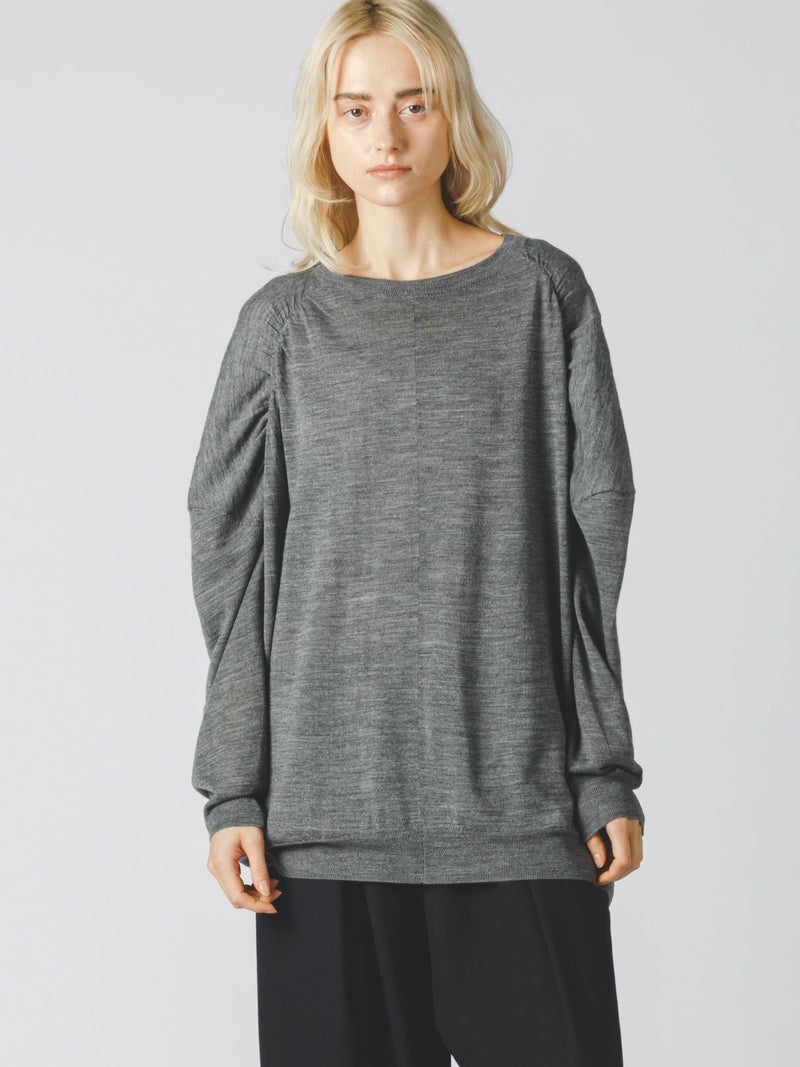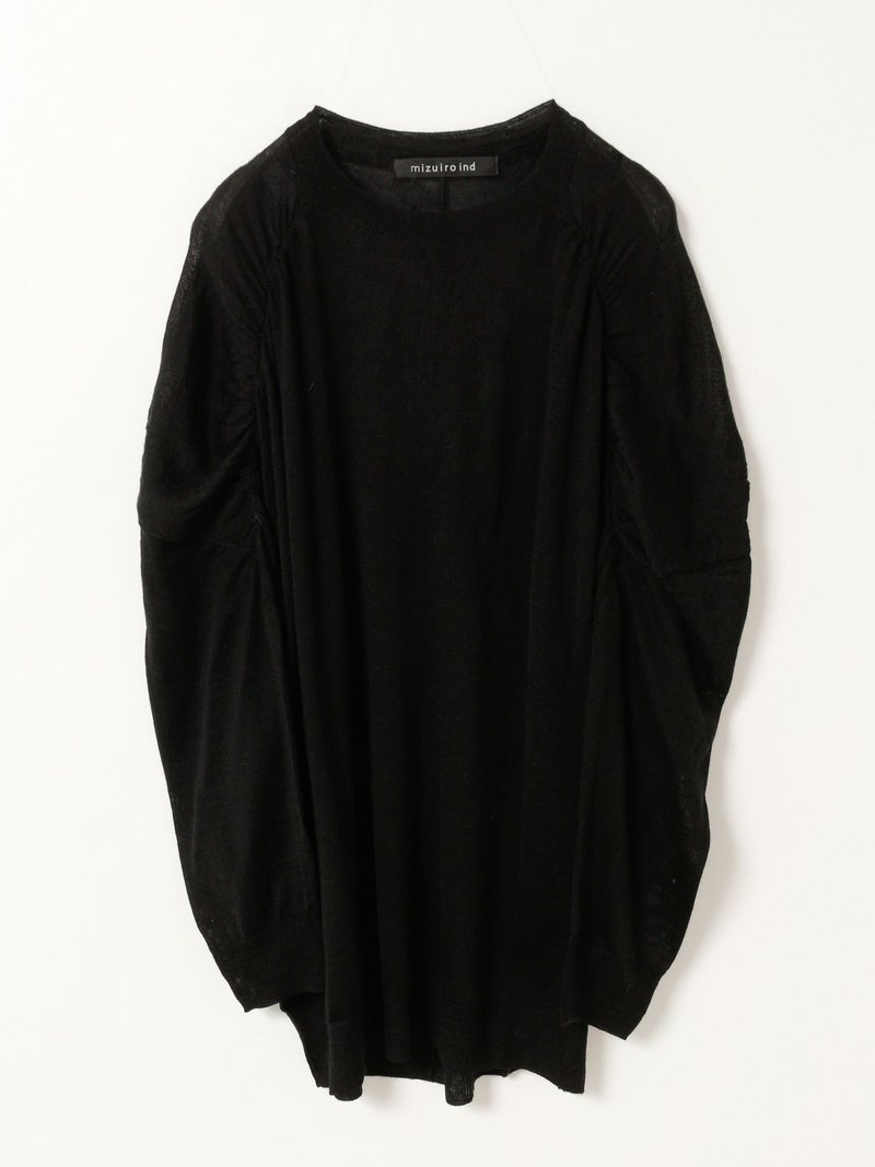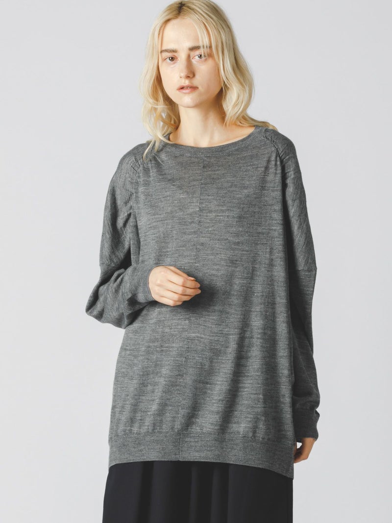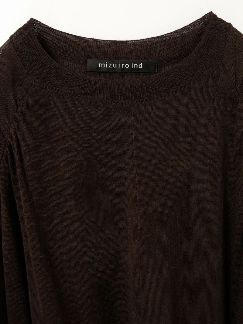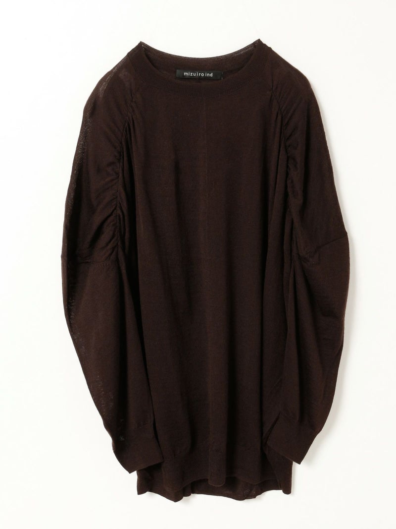 14ゲージの透け感がほどよい仕上がりのクルーネックギャザーショルダーチュニックです。肩部分のギャザーがポイントでmizuiro indのニューベーシックアイテムとして登場。女性らしいしなやかな動きのあるデザインが印象的。膝上のチュニック丈で、ざっくりとしたラフな大人の着こなしを演出します。スカートにもパンツスタイルにもよく合う1枚です。