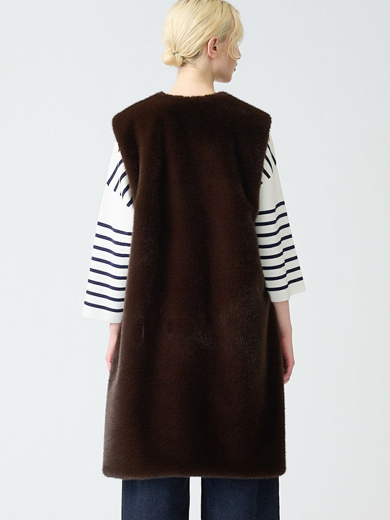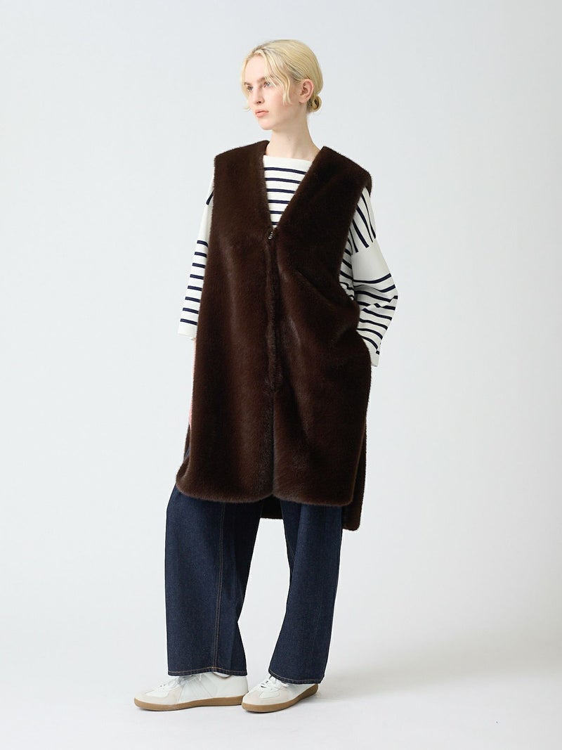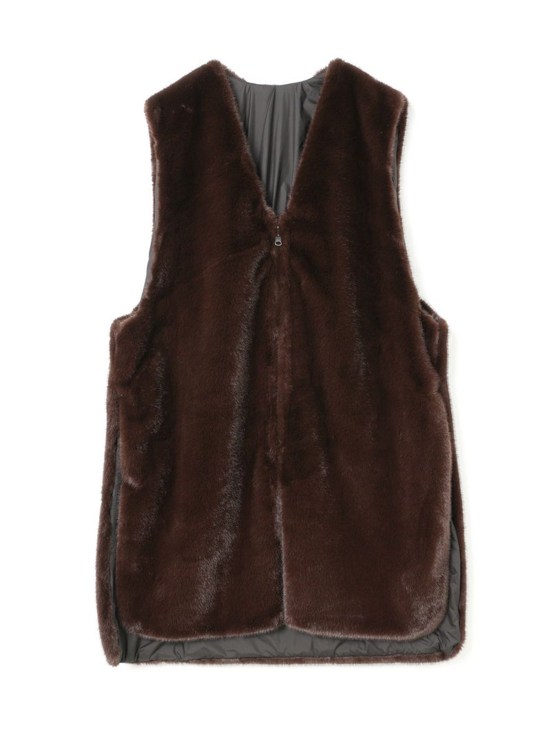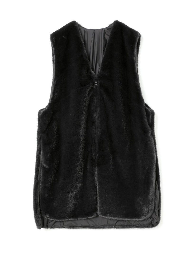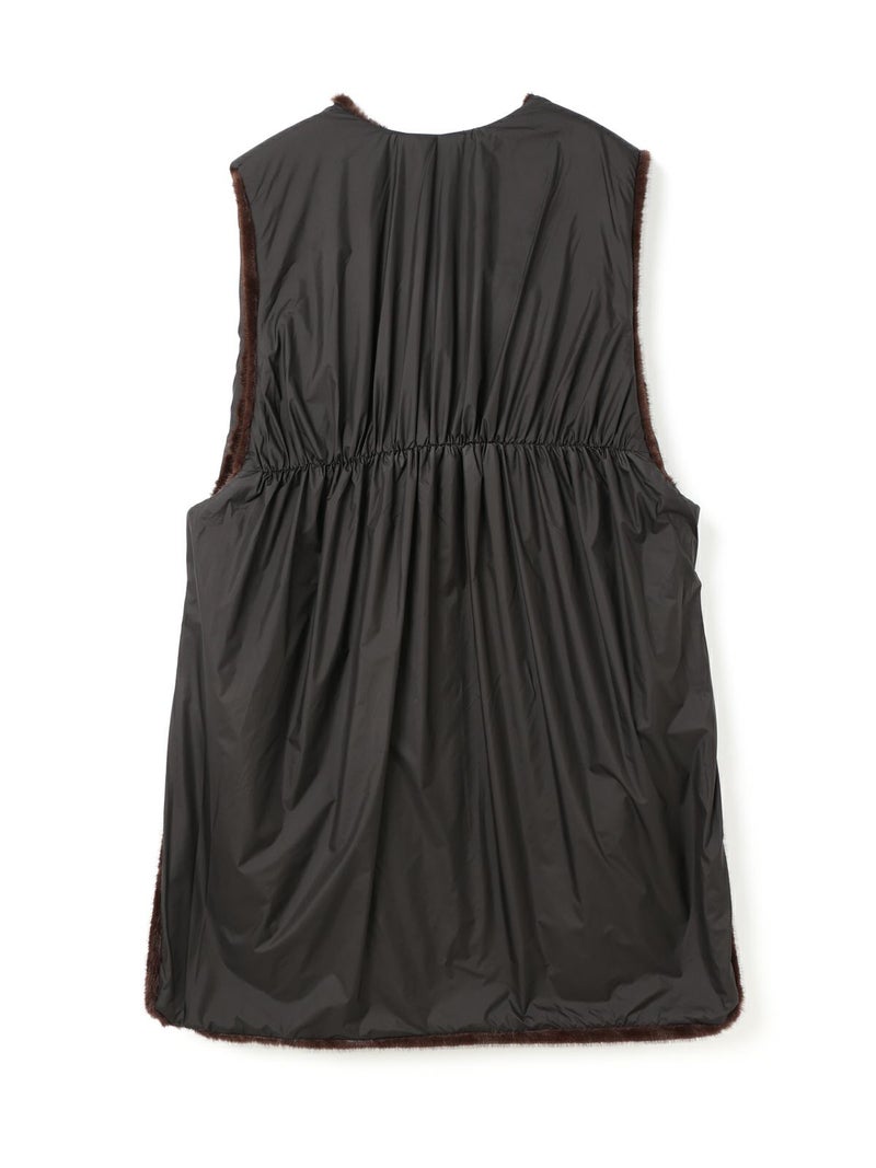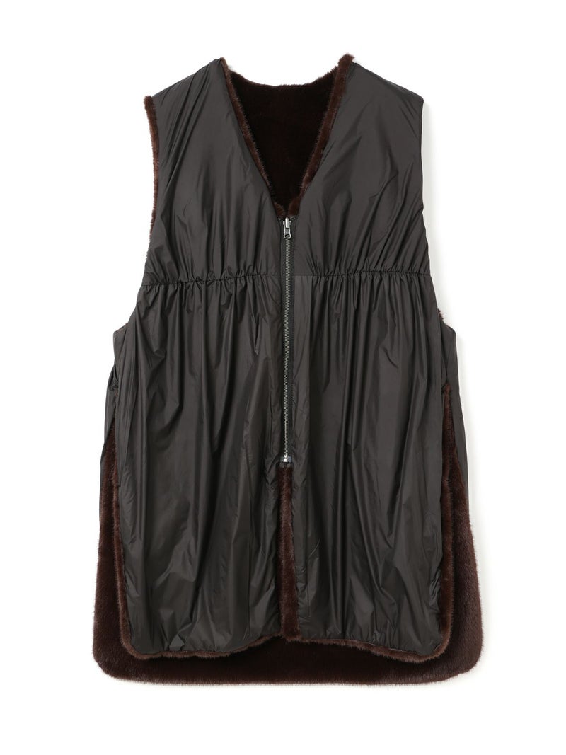 ポリエステル生地とファーを使用したファーボアリバーシブルロングベストです。季節感を感じさせるファーは手触りもよく高級感も感じさせてくれ、ポリエステル地はギャザーを施したことでファーとは違うシルエットデザインがポイント。前後差を付けたデザインとサイドポケット付。雰囲気が異なる為リバーシブルでの着こなしをより楽しんでいただける1枚になっています。重ね着しても上からアウターを羽織っていただきやすいサイズ感です。カジュアルにもシックな着こなしも演出できるロングベストです。