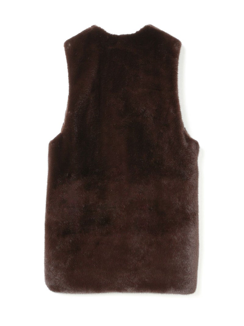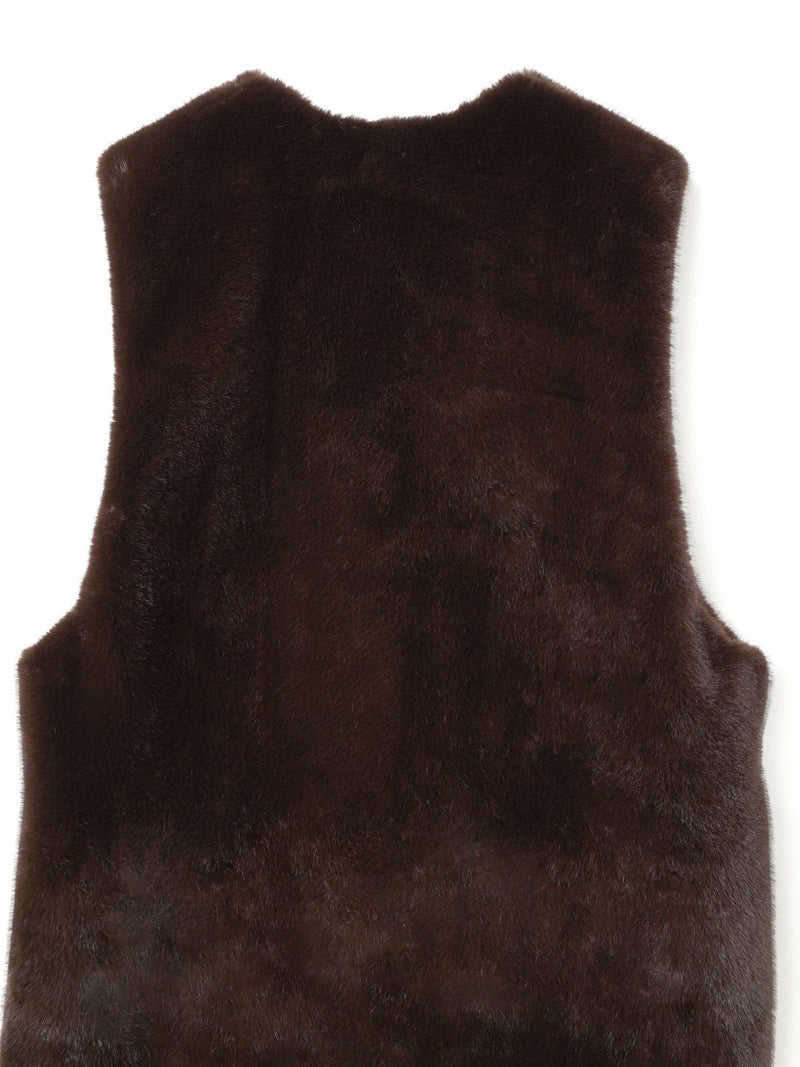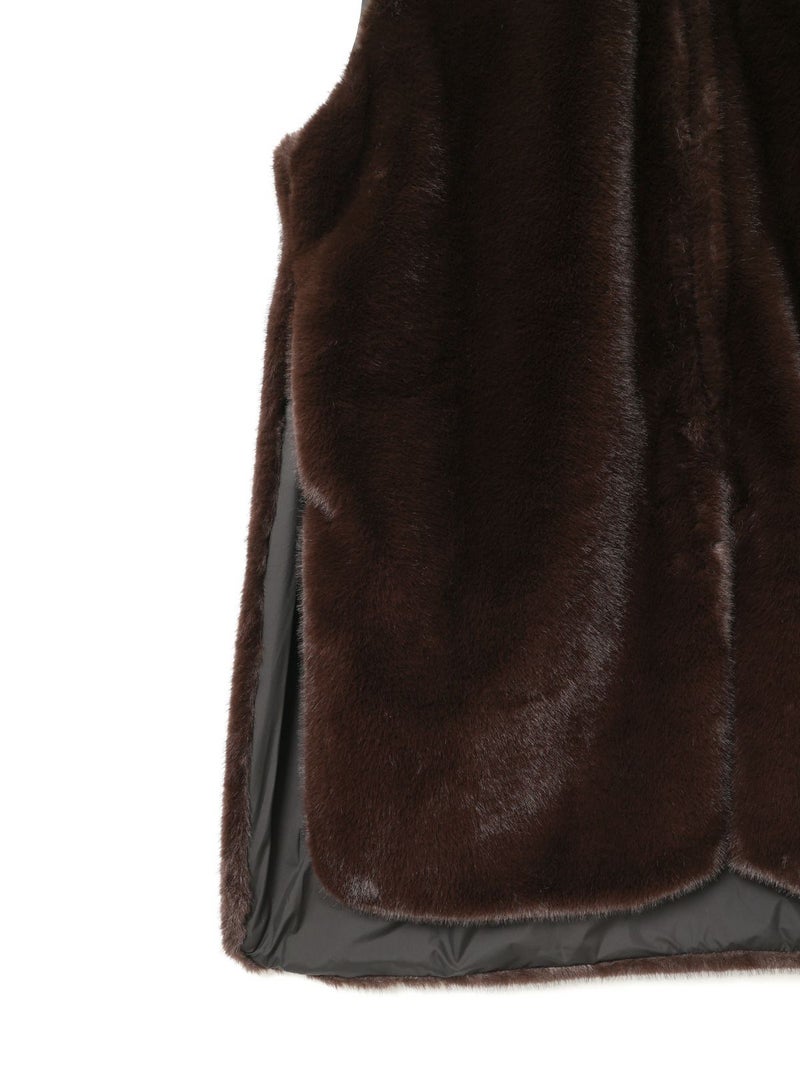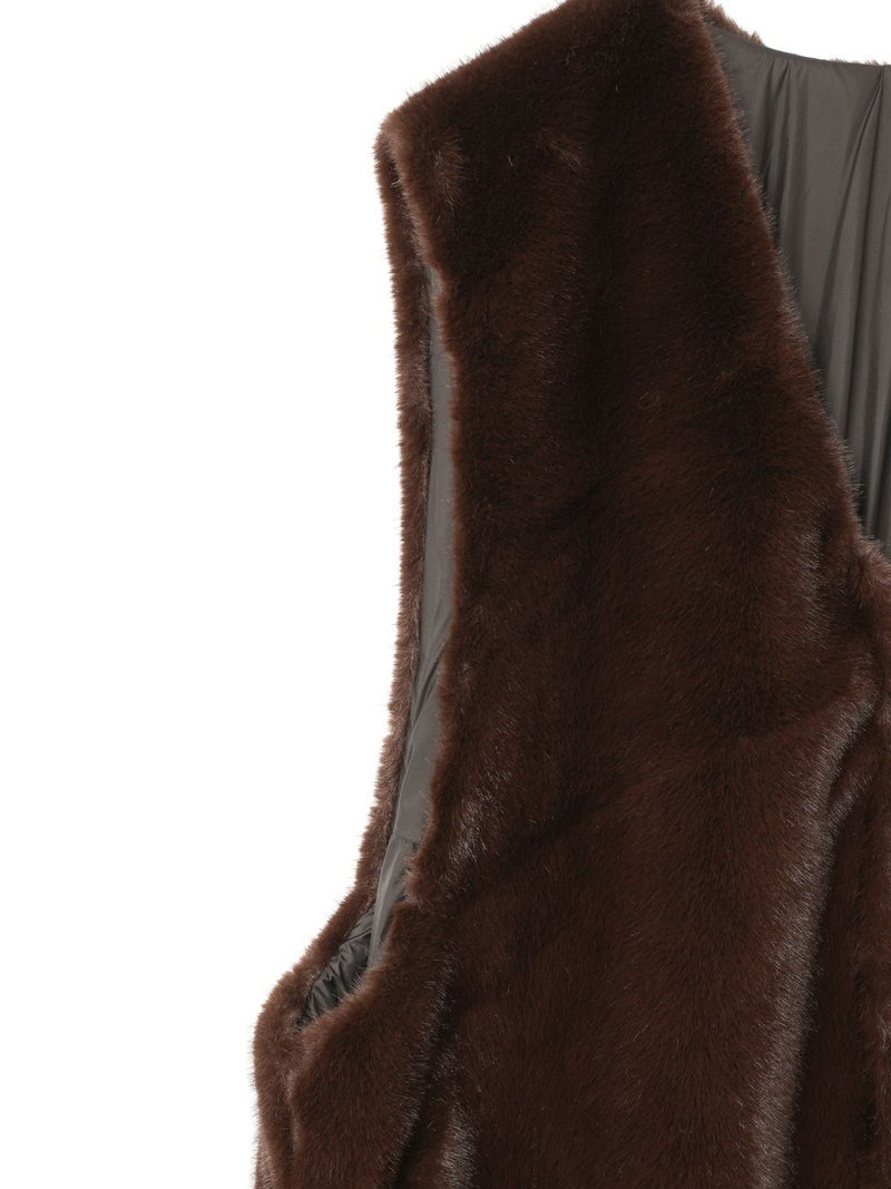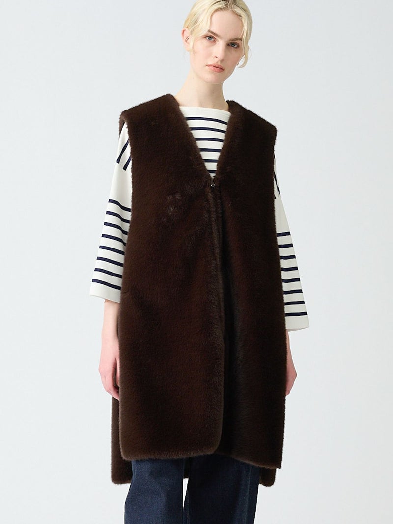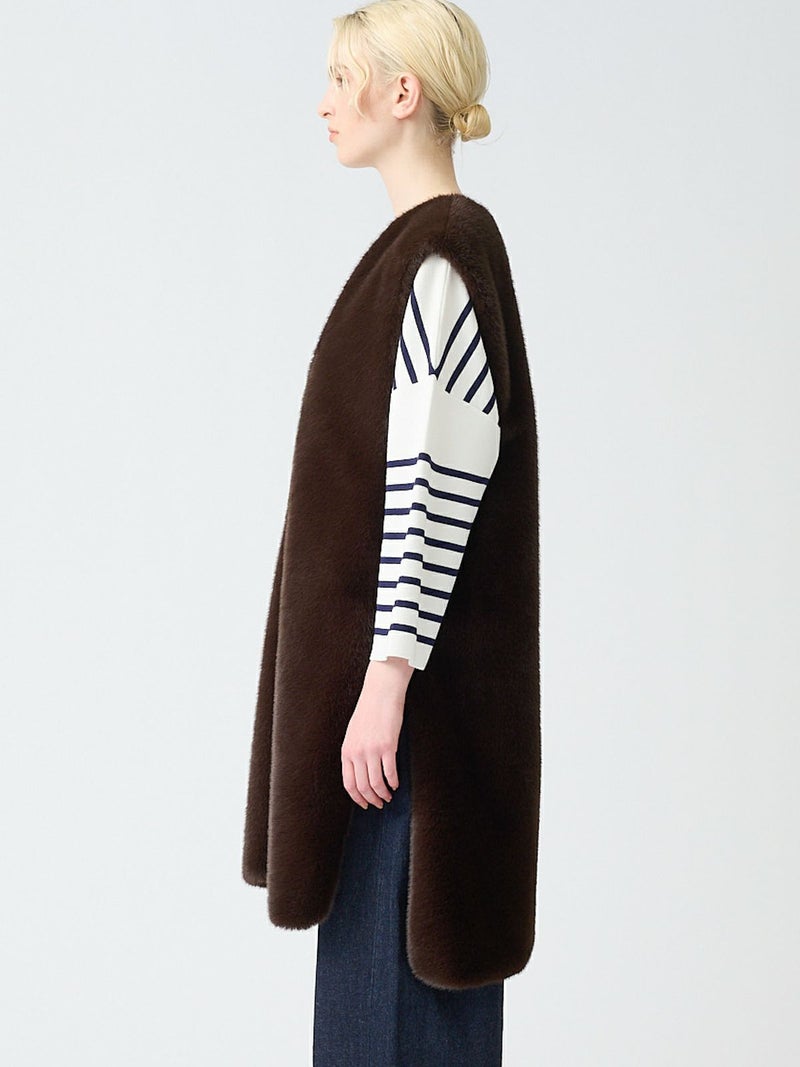 ポリエステル生地とファーを使用したファーボアリバーシブルロングベストです。季節感を感じさせるファーは手触りもよく高級感も感じさせてくれ、ポリエステル地はギャザーを施したことでファーとは違うシルエットデザインがポイント。前後差を付けたデザインとサイドポケット付。雰囲気が異なる為リバーシブルでの着こなしをより楽しんでいただける1枚になっています。重ね着しても上からアウターを羽織っていただきやすいサイズ感です。カジュアルにもシックな着こなしも演出できるロングベストです。