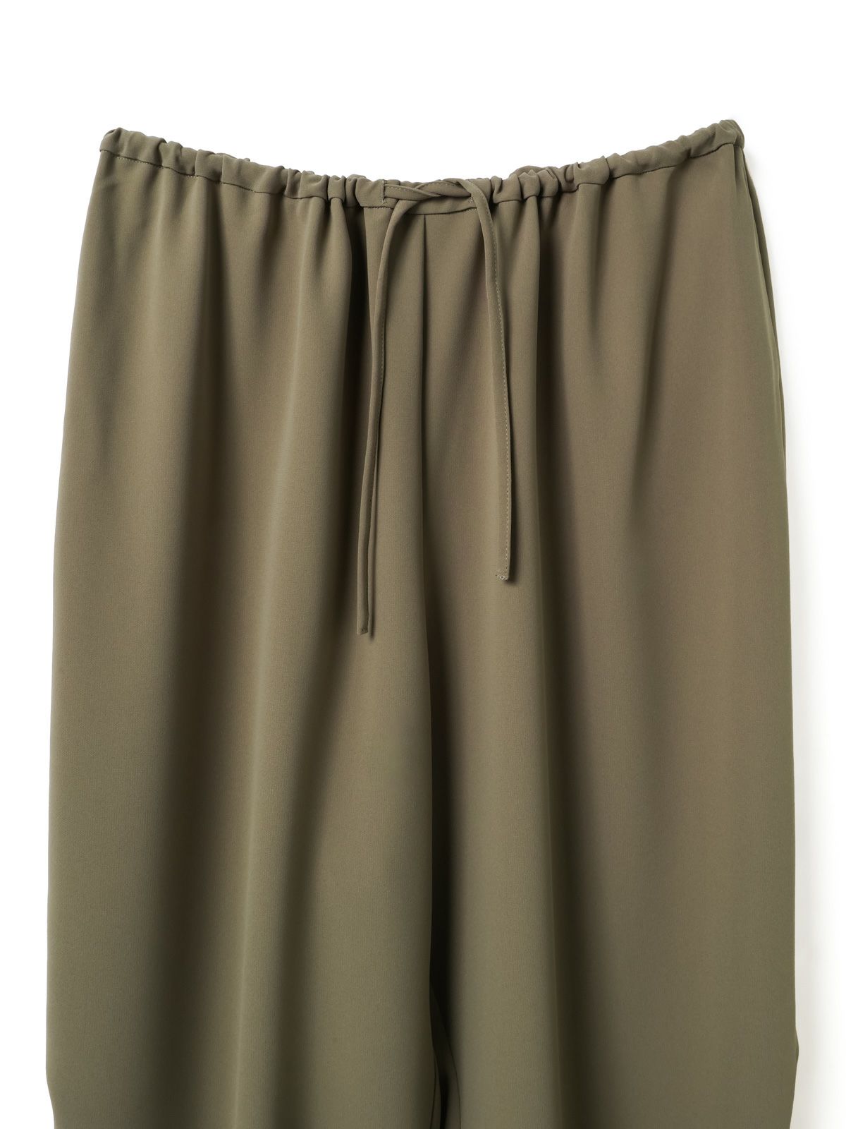 ドレープ感のあるPE素材を使用したドローストリングヘムパンツです。程よくゆとりのあるシルエットを表現。ウエストは調整のできる紐で絞るデザイン仕上げ。足元にはドロストリングのゴムを使用。サラッとした落ち感のあるキレイな生地感なのでシーズンを通して長く着用していただけます。若干の丸みのあるパンツラインが特徴的。ブーツにも良く合う1枚です。