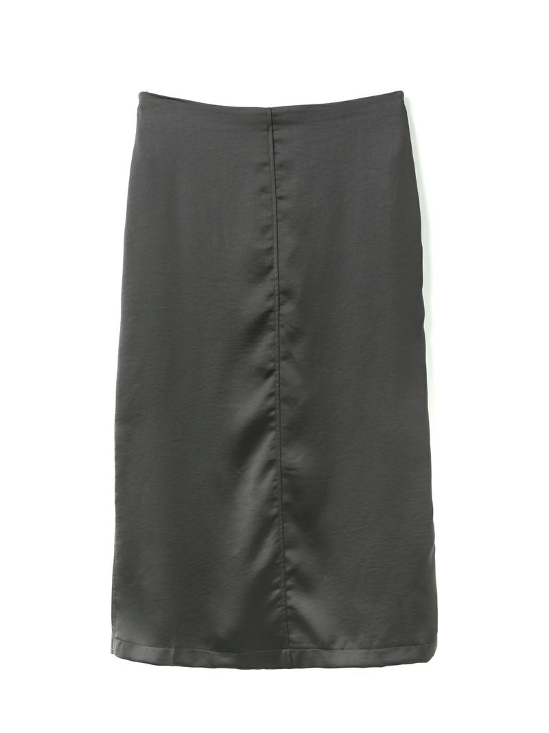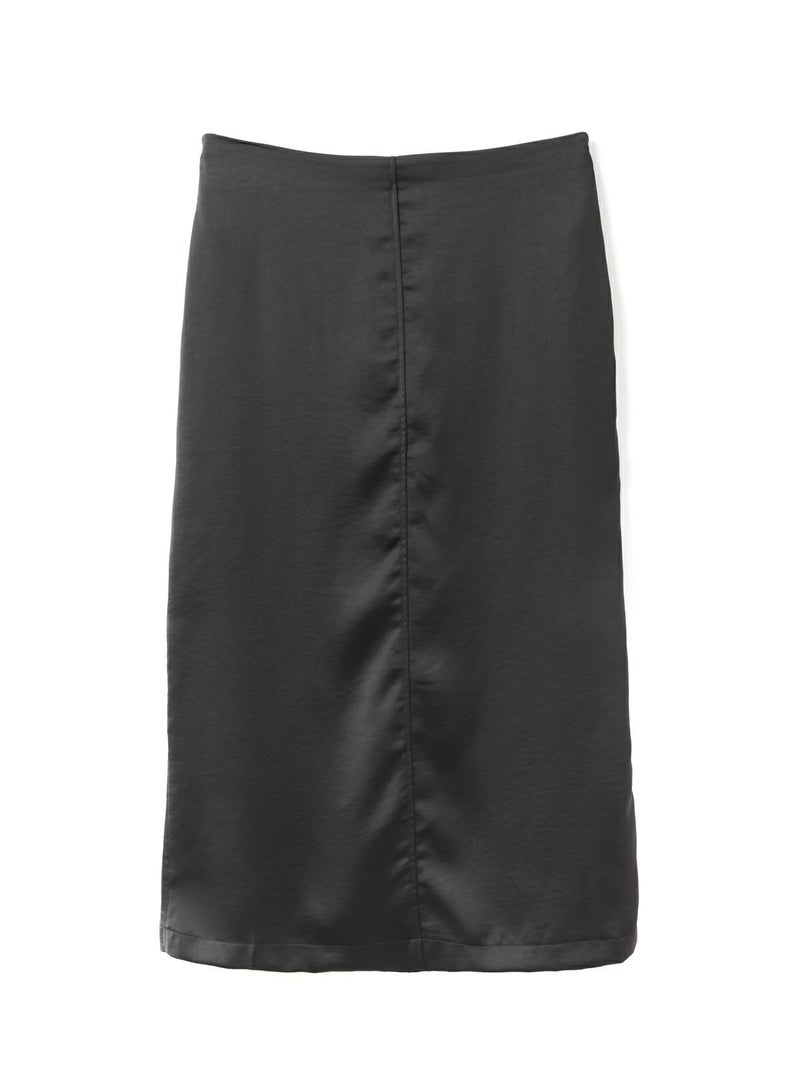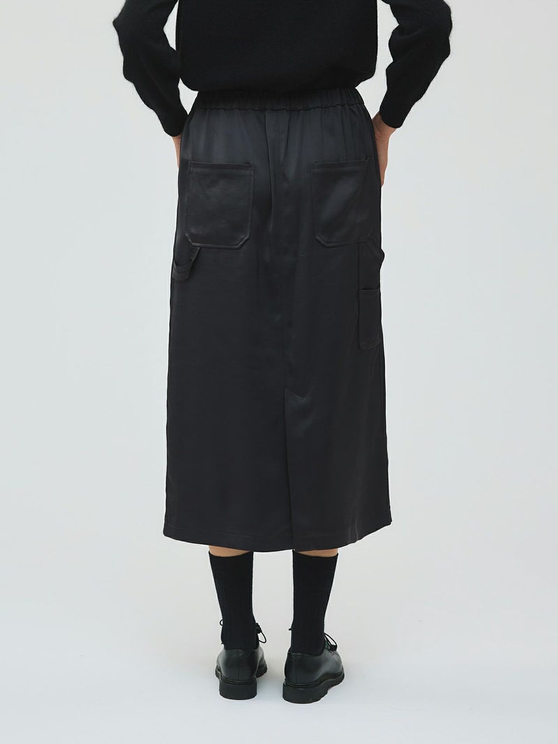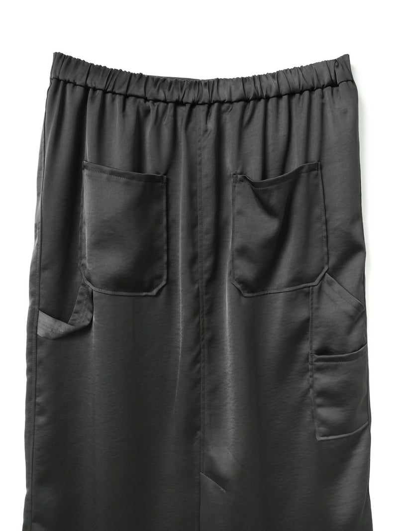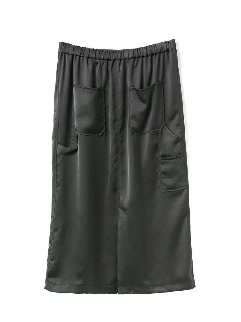 上品なサテン生地にペインターパンツのデザインをプラスしたペインタータイトスカートです。ポケットのデザインが特徴的。中紐が付いているのでウエストの調整が可能。バック部分のみゴム使用でシャツインにもお勧めです。タイト目なボックス型のシルエットはベーシックな中に女性らしい清楚な雰囲気が演出できる1枚。落ち着きのあるカラー展開なので着回しのきくスカートです。