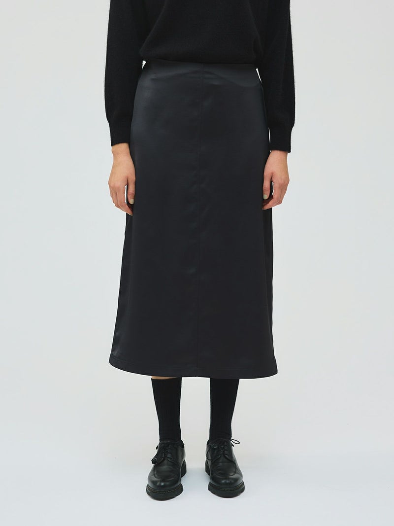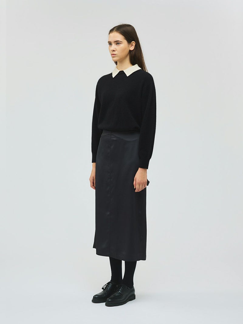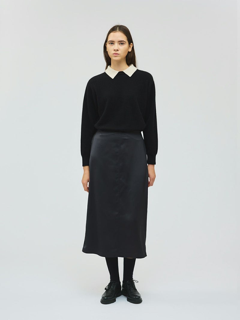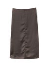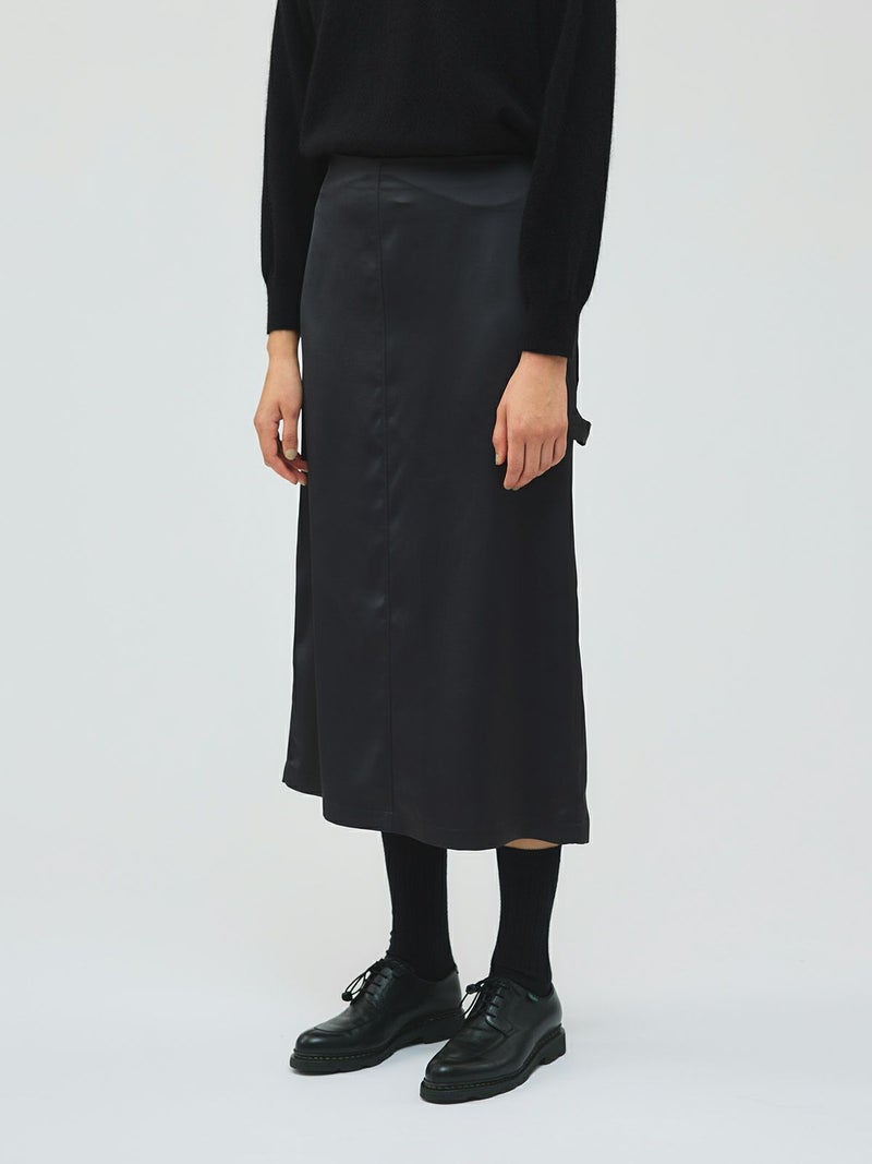 上品なサテン生地にペインターパンツのデザインをプラスしたペインタータイトスカートです。ポケットのデザインが特徴的。中紐が付いているのでウエストの調整が可能。バック部分のみゴム使用でシャツインにもお勧めです。タイト目なボックス型のシルエットはベーシックな中に女性らしい清楚な雰囲気が演出できる1枚。落ち着きのあるカラー展開なので着回しのきくスカートです。