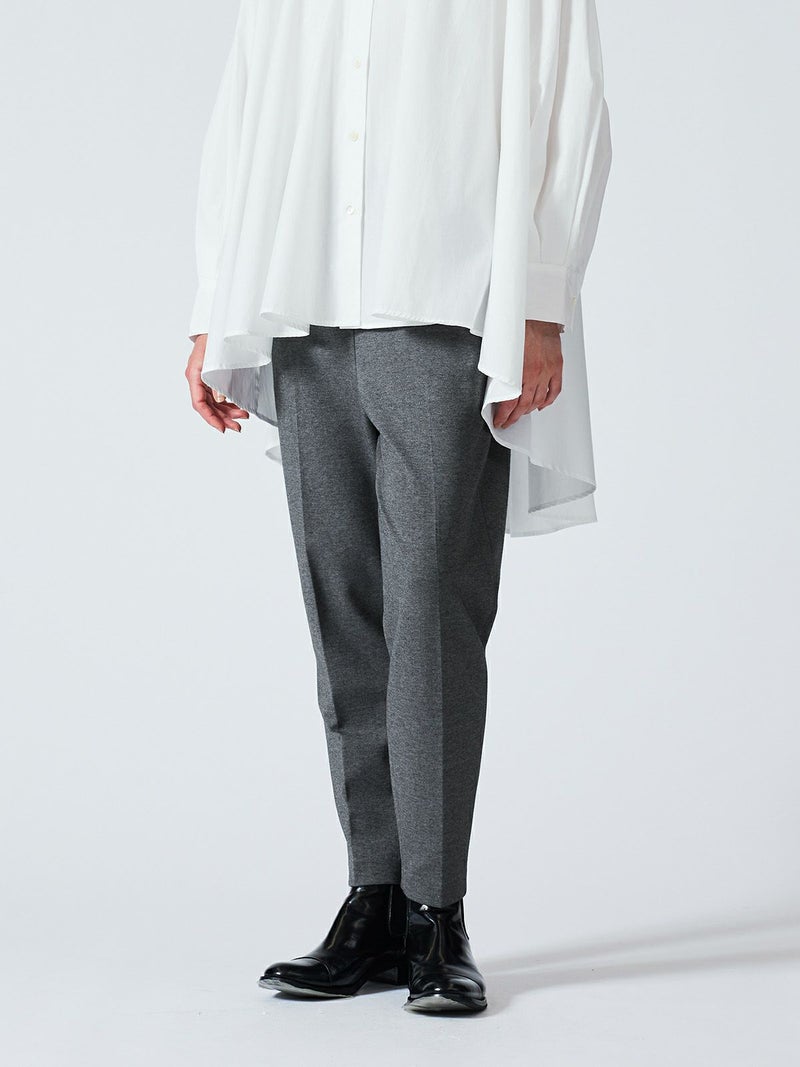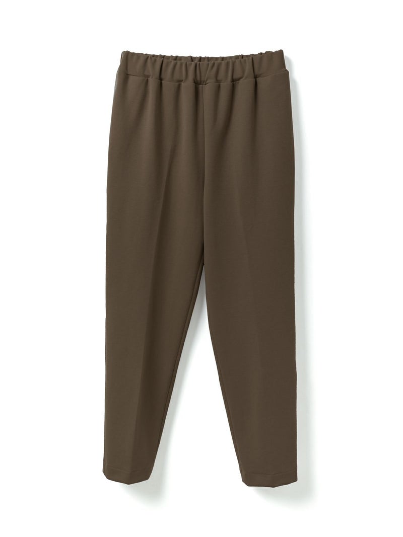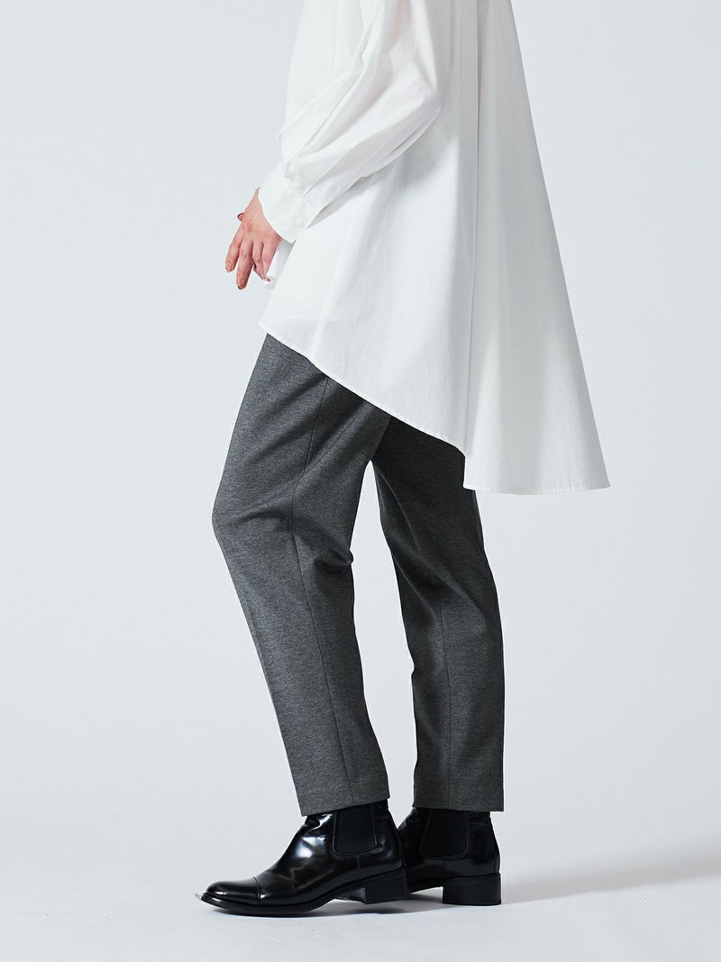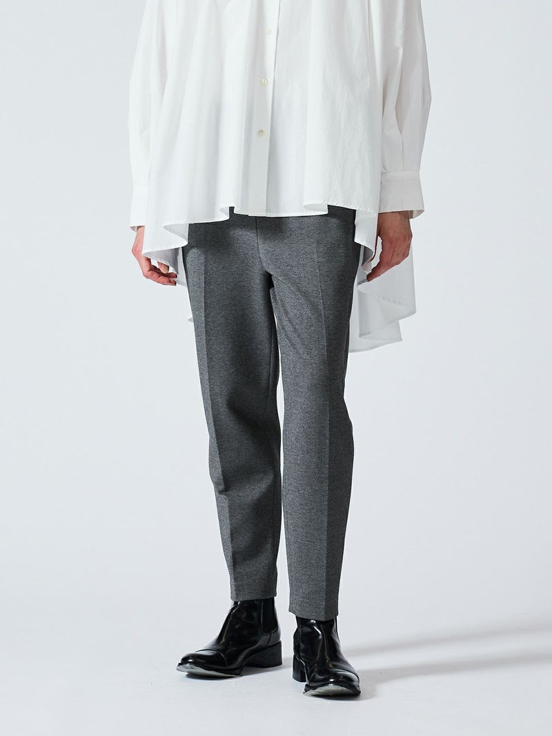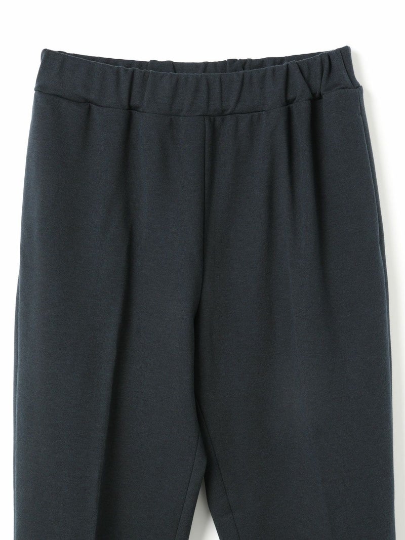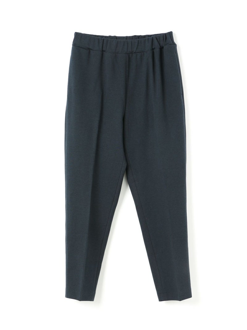 カットポンチ素材を使用したストレッチ性のあるなめらかな肌触りが特徴のジャージーセンタープレスパンツ。着心地もよく型崩れも少なくお洗濯もしやすいのもポイント。程よいパンツ幅でラフ過ぎずきちんと感を印象付けます。ウエストをゴム使用にしたリラックス感のあるデザインでmizuiro indらしい着こなしを表現します。同シリーズの3-210060/クルーネックコクーンプルオーバーとのセットアップがおすすめで、秋の季節感を演出していただける1枚です。