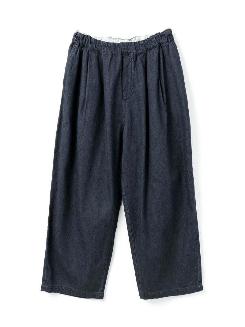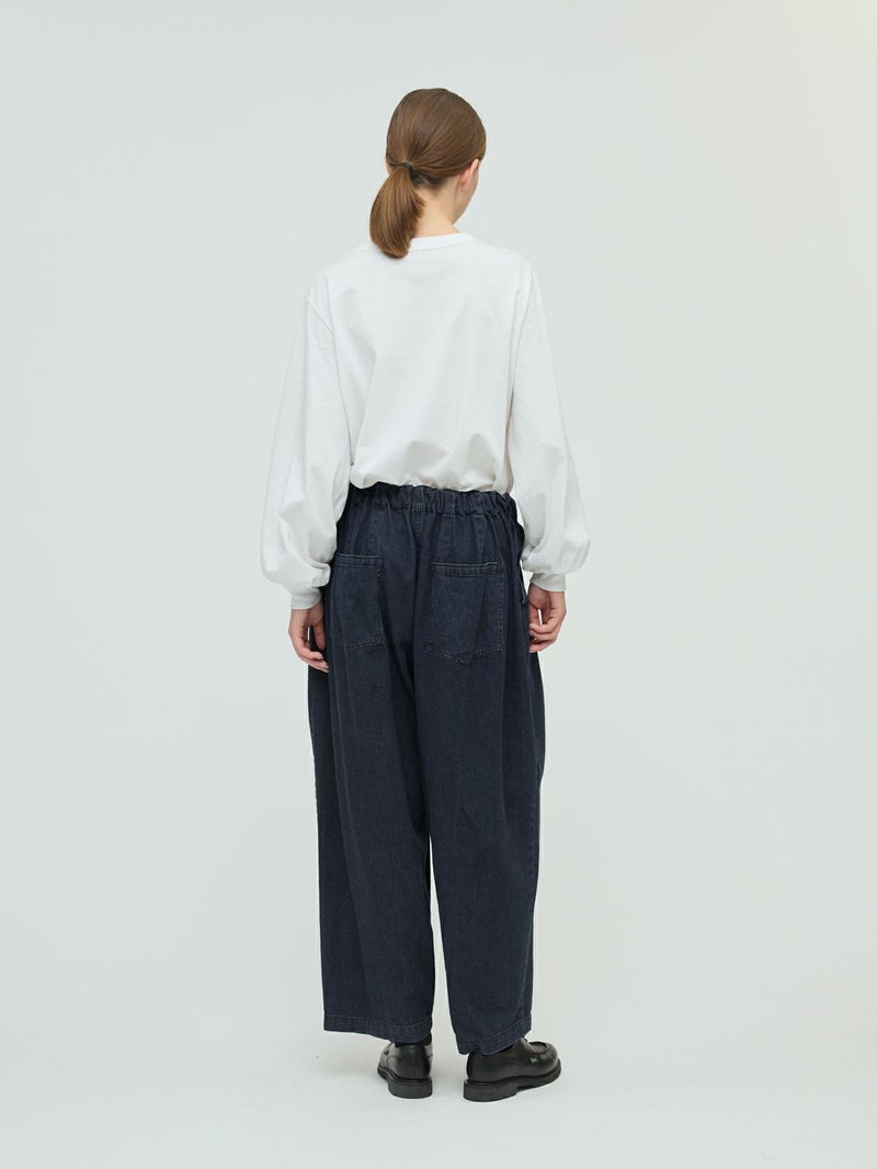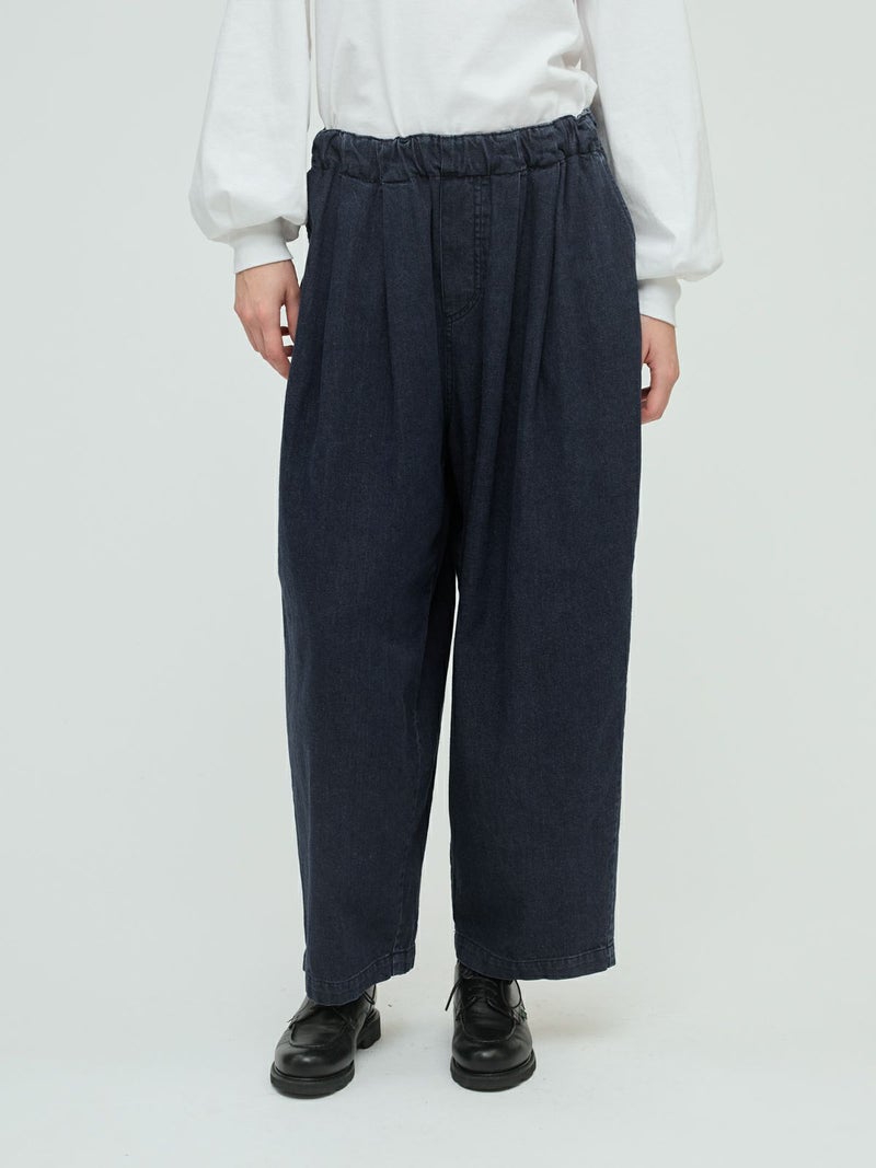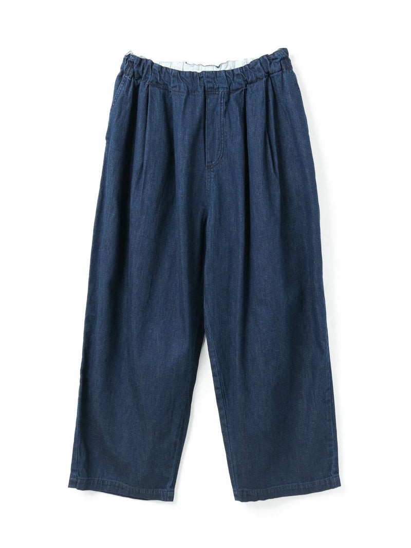 岡山産デニムを使用してデザインしたデニムタックワイドパンツです。ブラックのステッチを採用してモード感を演出。しっとりとした生地感で、程よい落ち感が特徴。ゆとりのあるワイドシルエットを表現。ウエストはリラックス感のあるゴム使用。フェード色とワンウォッシュの2色展開です。人気のデニムシリーズで同シリーズ3-230102/デニムベストと3-230101/デニムワイドシャツも展開。セットアップでの着こなしもお勧めです。