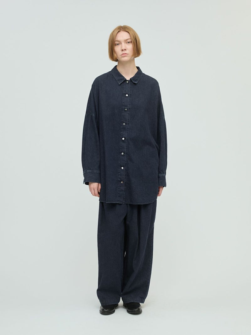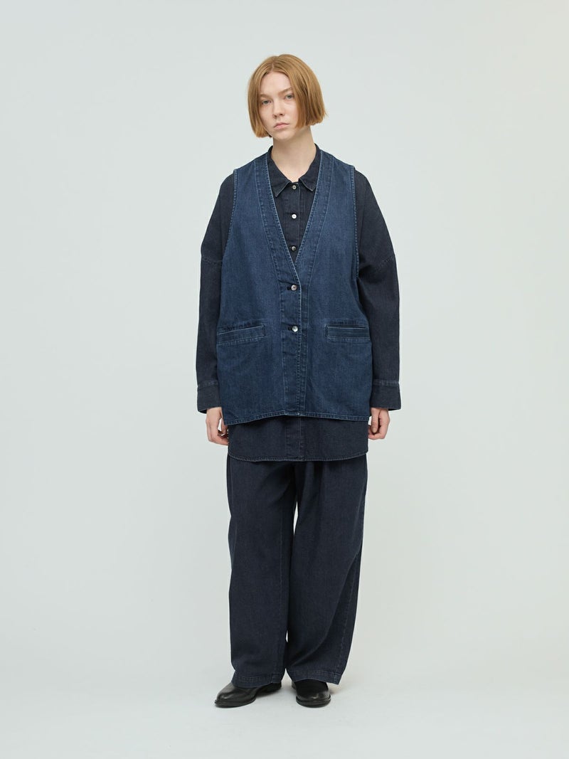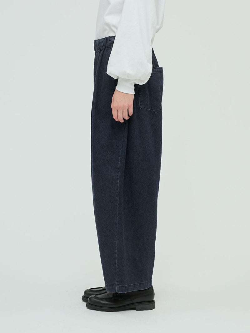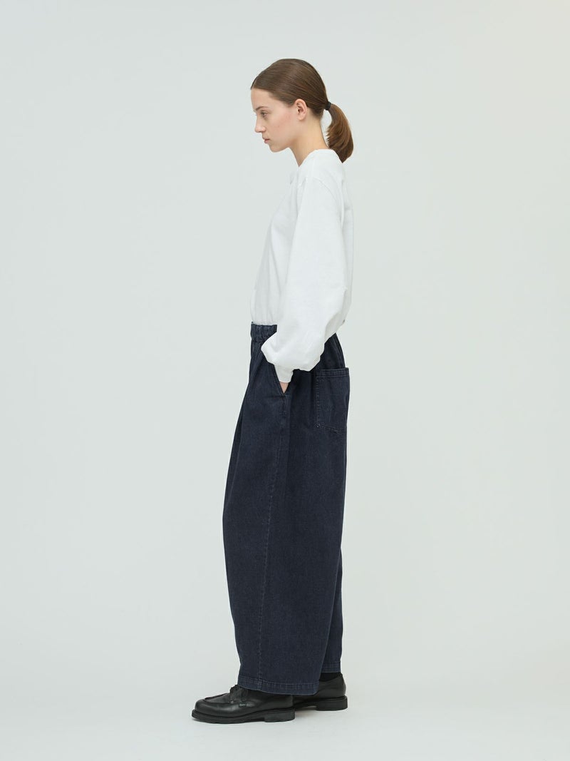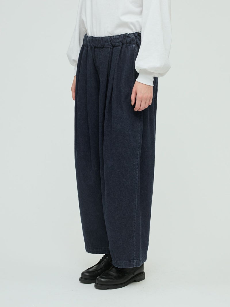 岡山産デニムを使用してデザインしたデニムタックワイドパンツです。ブラックのステッチを採用してモード感を演出。しっとりとした生地感で、程よい落ち感が特徴。ゆとりのあるワイドシルエットを表現。ウエストはリラックス感のあるゴム使用。フェード色とワンウォッシュの2色展開です。人気のデニムシリーズで同シリーズ3-230102/デニムベストと3-230101/デニムワイドシャツも展開。セットアップでの着こなしもお勧めです。