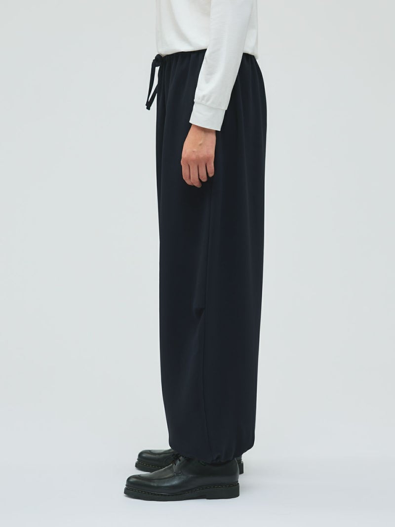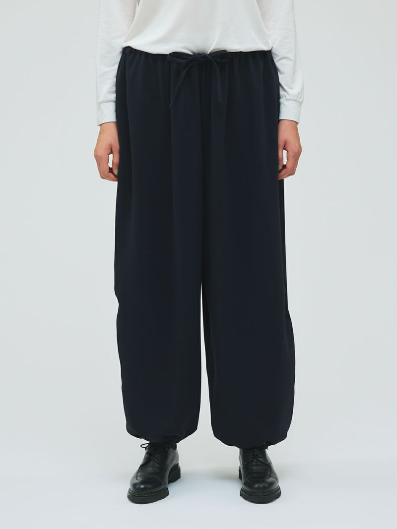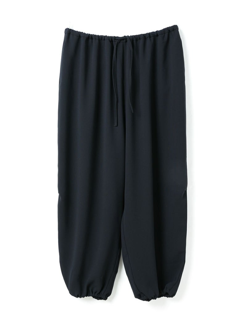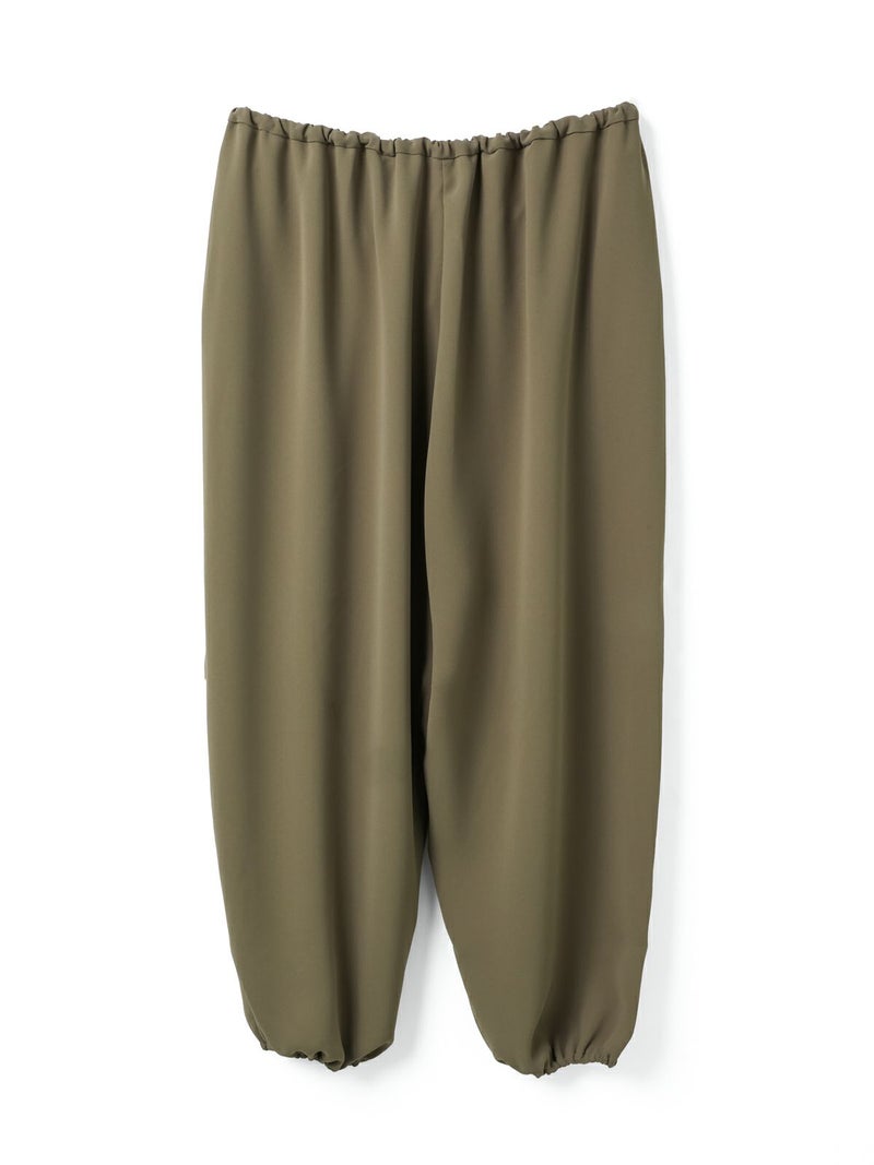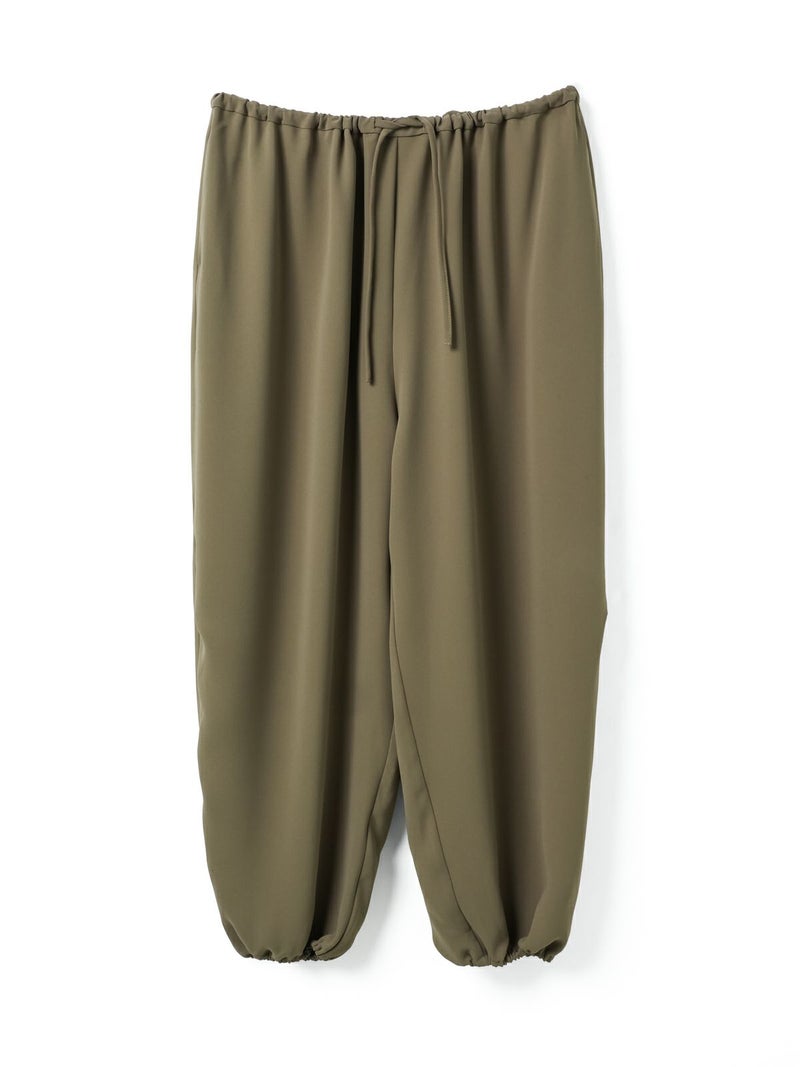 ドレープ感のあるPE素材を使用したドローストリングヘムパンツです。程よくゆとりのあるシルエットを表現。ウエストは調整のできる紐で絞るデザイン仕上げ。足元にはドロストリングのゴムを使用。サラッとした落ち感のあるキレイな生地感なのでシーズンを通して長く着用していただけます。若干の丸みのあるパンツラインが特徴的。ブーツにも良く合う1枚です。