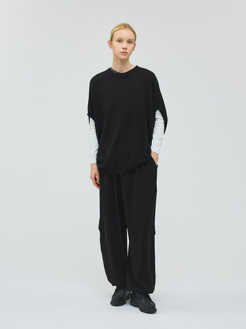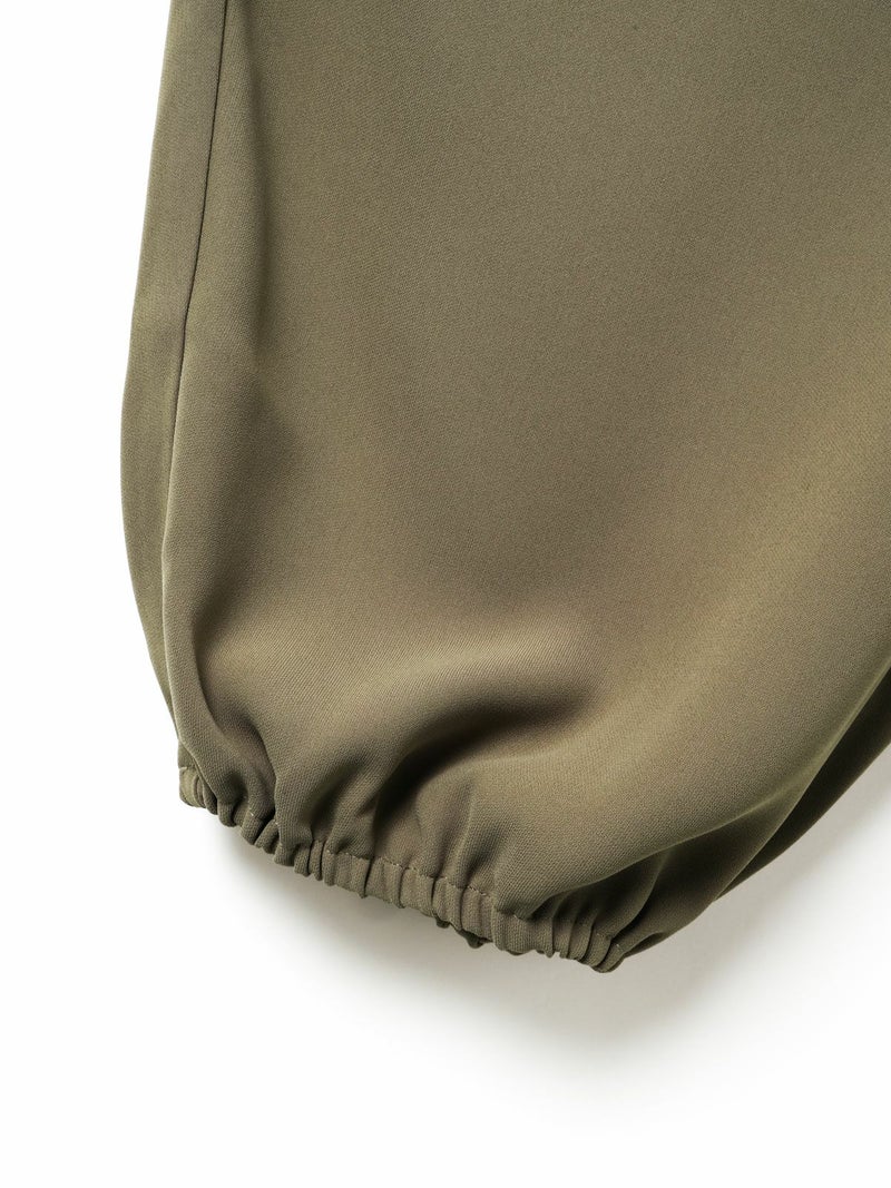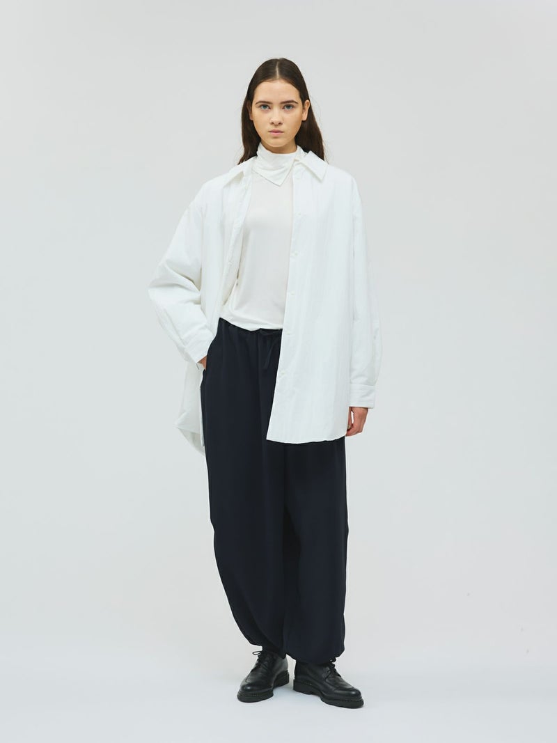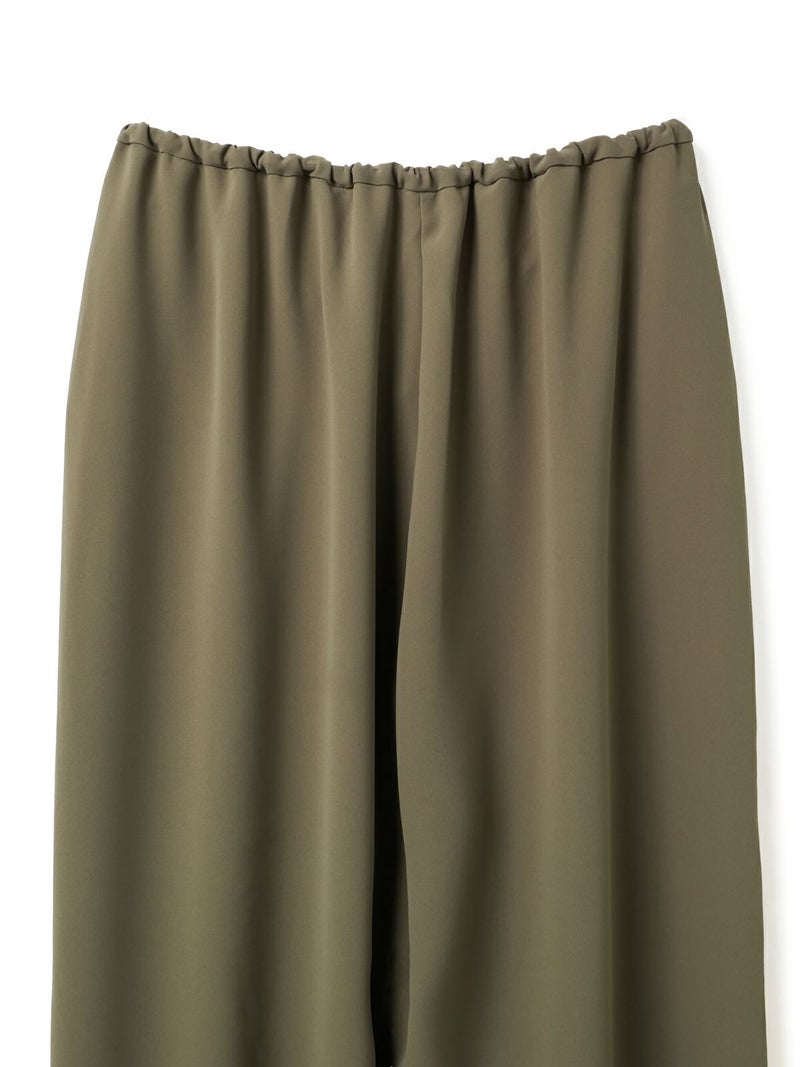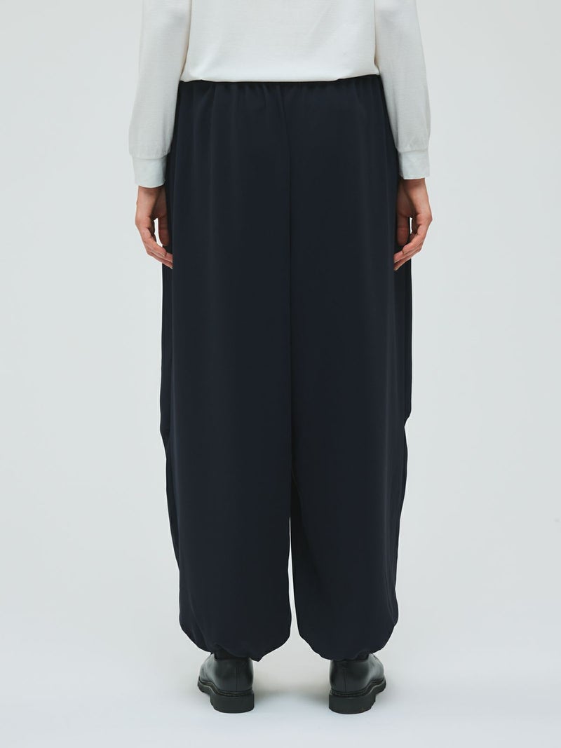 ドレープ感のあるPE素材を使用したドローストリングヘムパンツです。程よくゆとりのあるシルエットを表現。ウエストは調整のできる紐で絞るデザイン仕上げ。足元にはドロストリングのゴムを使用。サラッとした落ち感のあるキレイな生地感なのでシーズンを通して長く着用していただけます。若干の丸みのあるパンツラインが特徴的。ブーツにも良く合う1枚です。