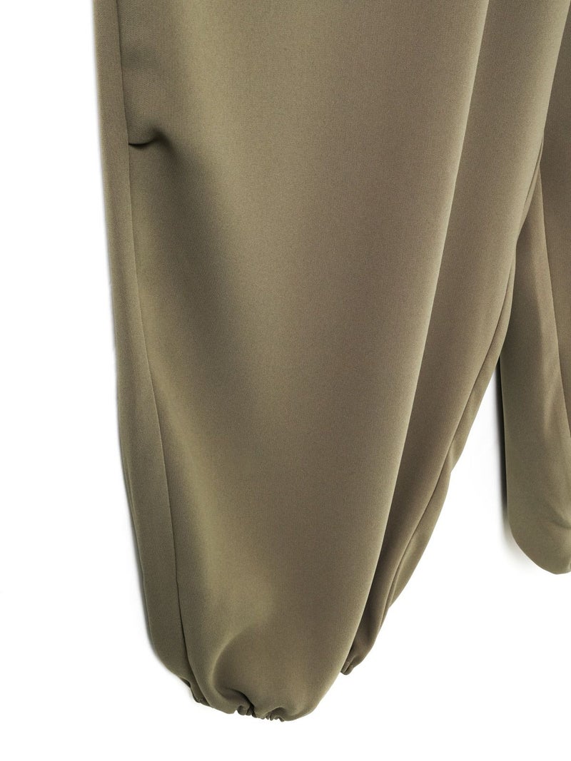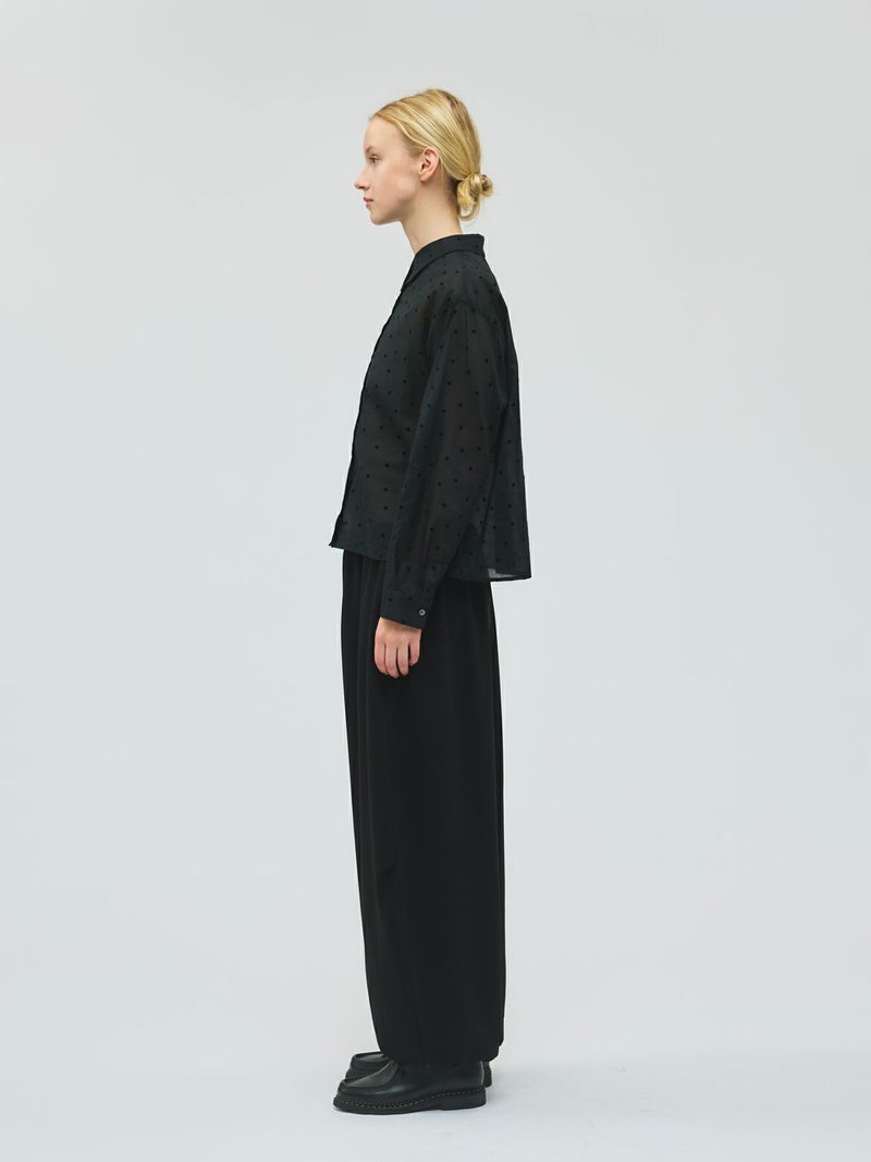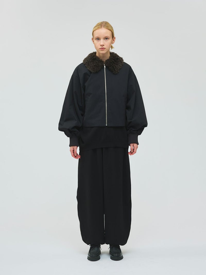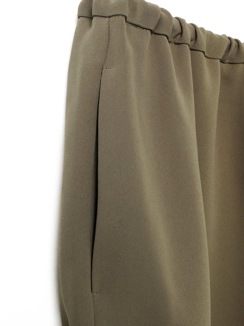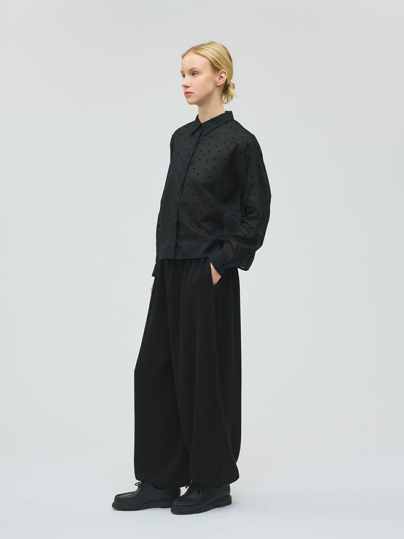 ドレープ感のあるPE素材を使用したドローストリングヘムパンツです。程よくゆとりのあるシルエットを表現。ウエストは調整のできる紐で絞るデザイン仕上げ。足元にはドロストリングのゴムを使用。サラッとした落ち感のあるキレイな生地感なのでシーズンを通して長く着用していただけます。若干の丸みのあるパンツラインが特徴的。ブーツにも良く合う1枚です。