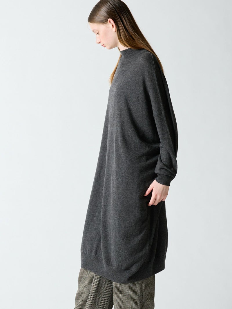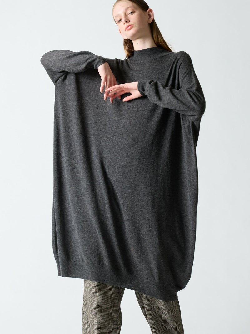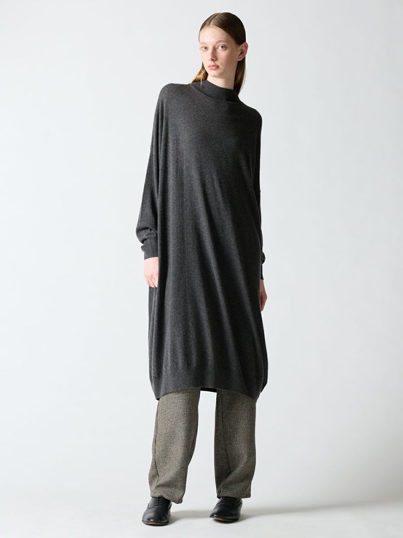 mizuiro indの定番ニットワンピースでもあるハイネックワイドワンピースです。清楚で暖かなハイネックのシンプルなデザインです。程良くゆったり感があるので、インナーが着やすいのがポイント。パンツと合わせて着こなしてもOK。厚手過ぎないので上からカーディガンなどの羽織りものも着やすくジレなどレイヤードもしやすいワンピースです。手洗いもできるシンプルで暖かく大変着回しのきく人気アイテムです。