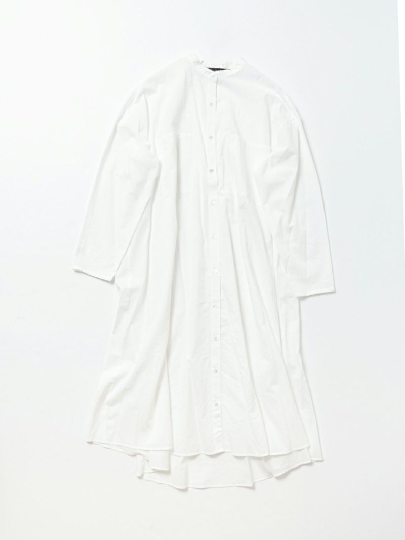 mizuiro indの定番型ワンピース、60ローンの素材を使用したポケット付バンドカラーロングワンピースです。大きな胸のポケットが特長。スッキリ感のバンドカラーの襟元から膝下までのフレアラインがキレイなシルエットで、背中にタックを施した動きのあるシルエットを表現しました。レイヤードアイテムとしてもお勧めの1枚です。着心地のよいコットン生地で、気温の変化によって中に重ね着ができ、上からカーディガンを合わせたりと、長く愛用して頂けるワンピースです。