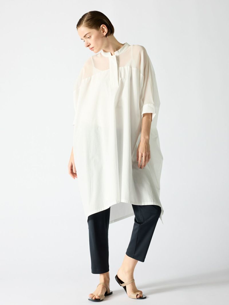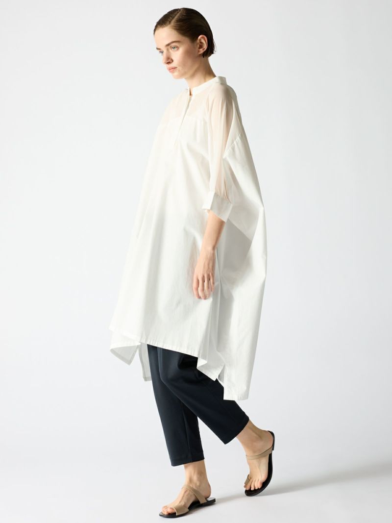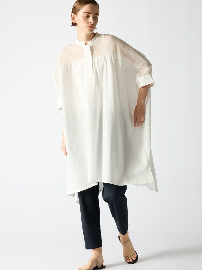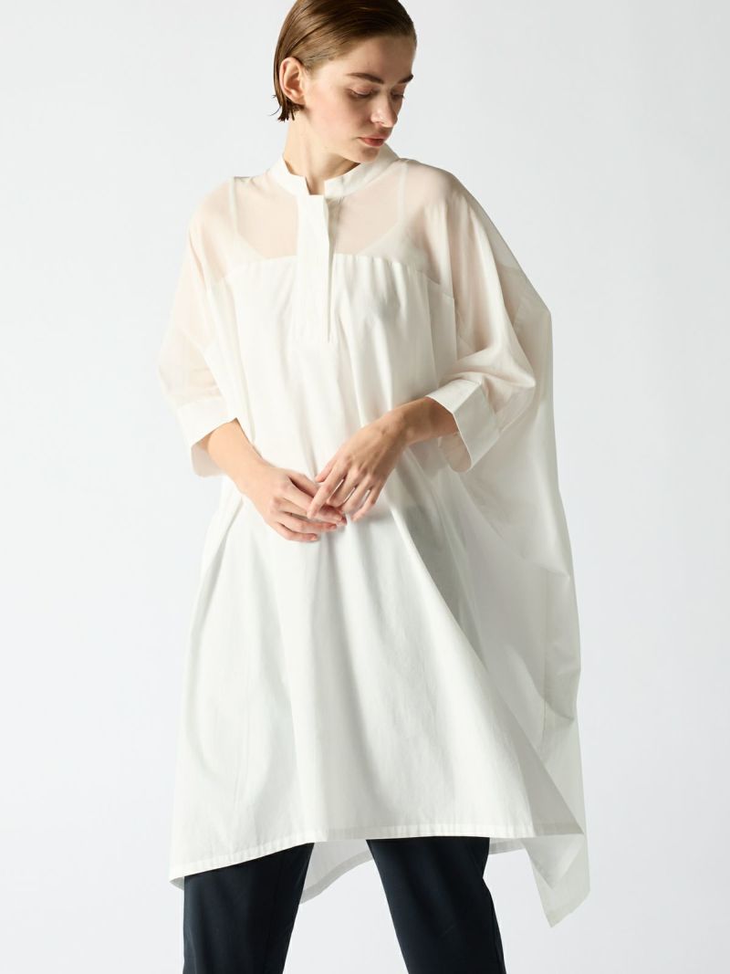 ベースに50ブロードを使用する事で透け感を上品にミックスしたシアーボイルミックススタンドカラーワイドワンピースです。ヨーク部分の透け感がポイントで、普段使いがしやすい新鮮なデザインとして提案できる1枚。人気のある透け感のあるデザインをワンピースに取り入れた大人の魅力をより引き出しました。清楚でシャープな雰囲気の3色のカラー展開。