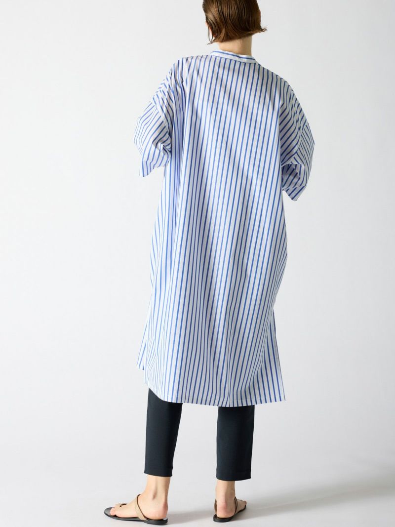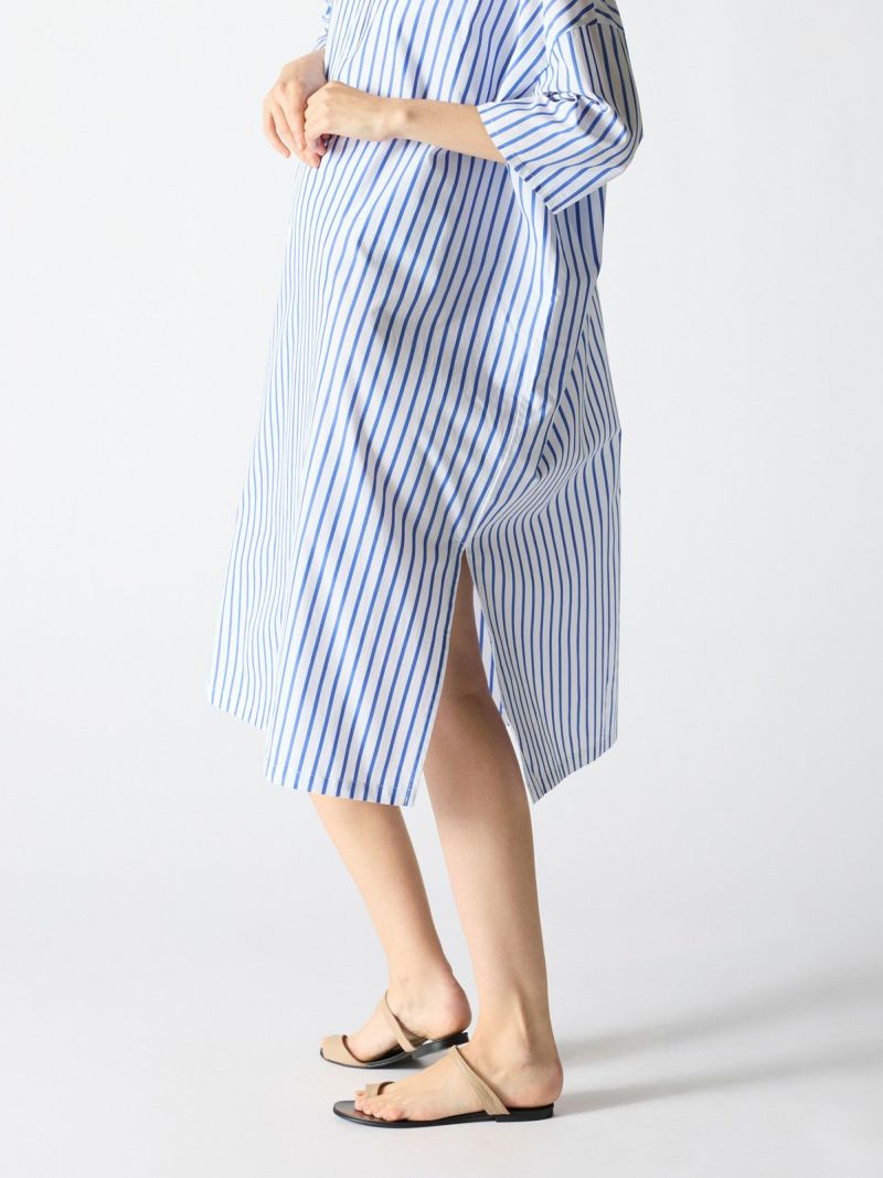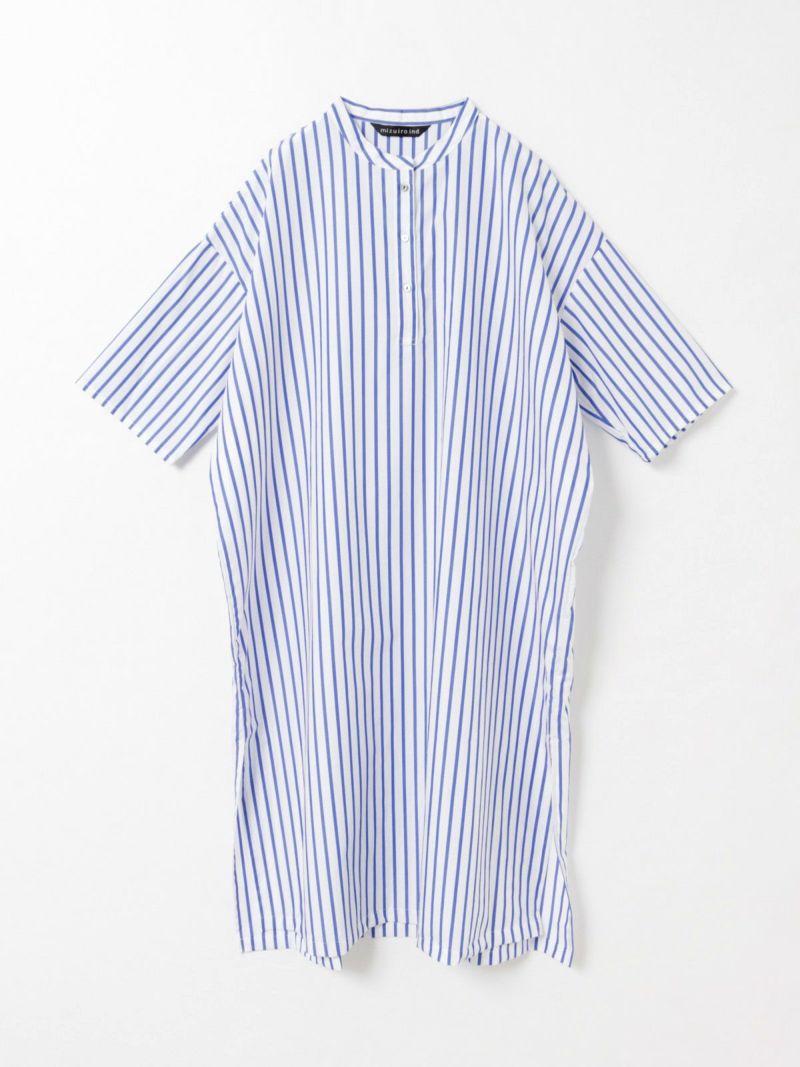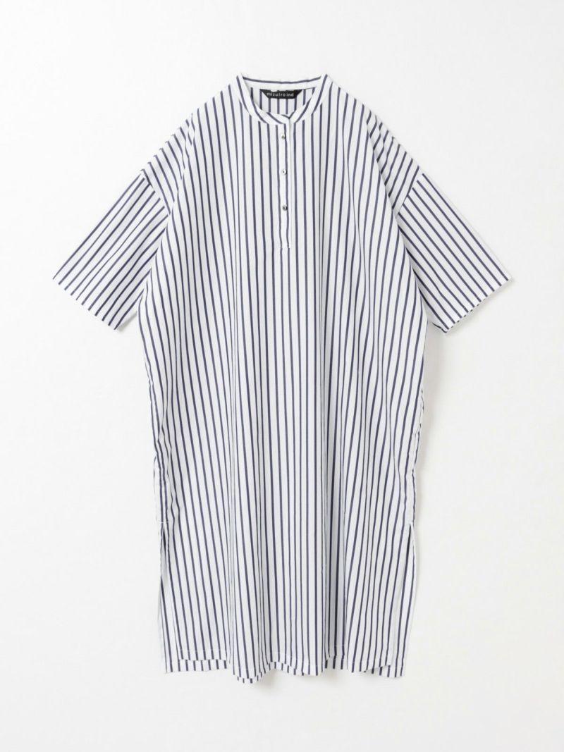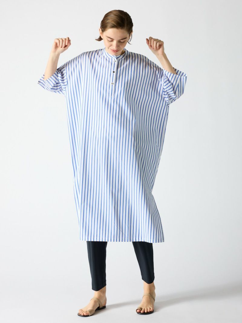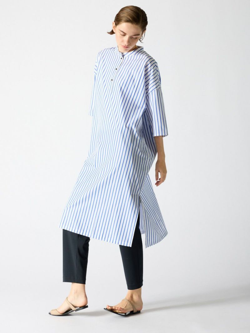 60タイプライターを使用したストライプスタンドカラーシャツワンピースです。爽やかなストライプが印象的。腕を通しやすい袖幅、サイドスリットを施した裾は前後差を付けた動きのあるデザインで清涼感を体感していただける1枚。ネックストライプパターンの首元は頭を通しやすいフロント3つボタンを仕様。広がりはないシルエットですが透け感があるのでパンツと合わせたコーディネートがお勧めです。