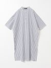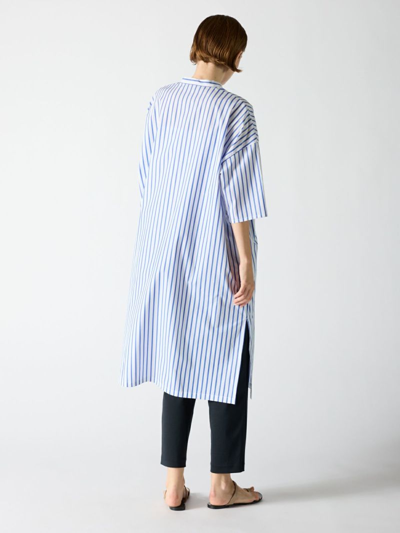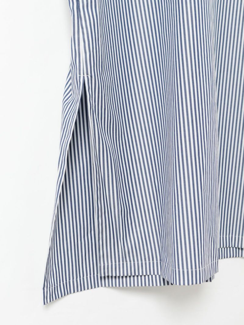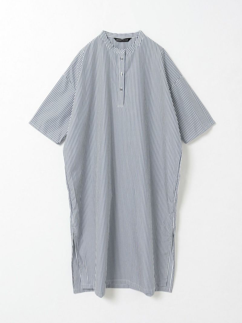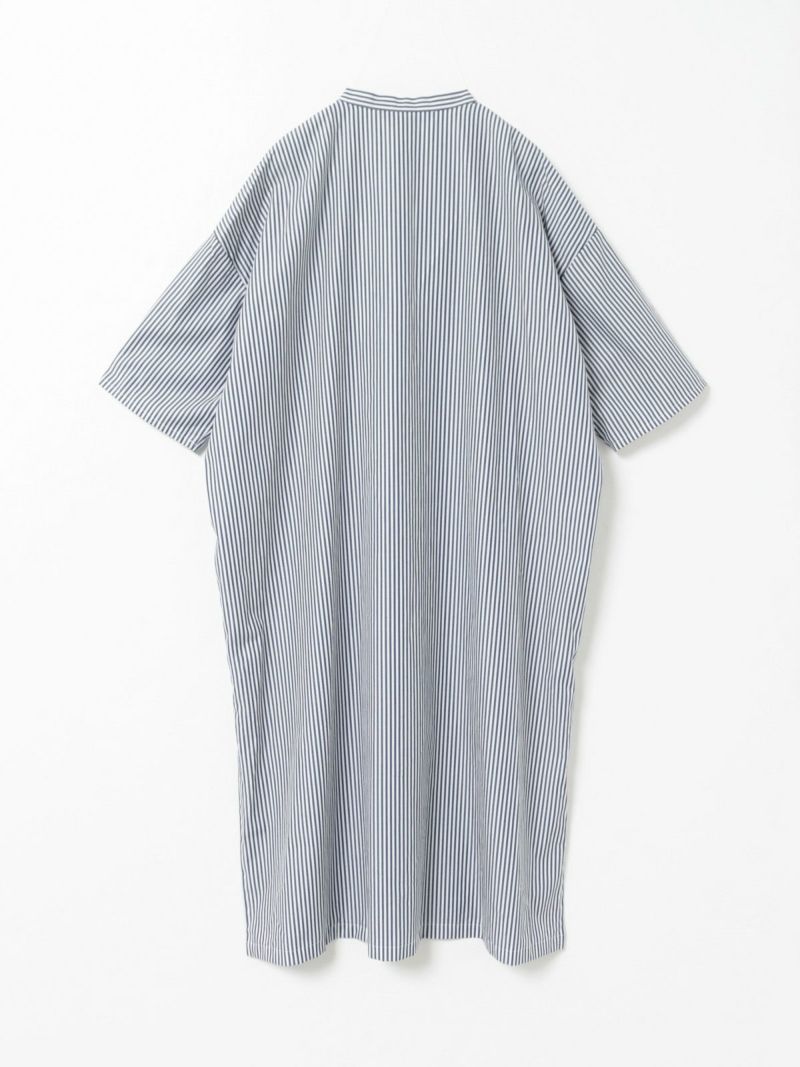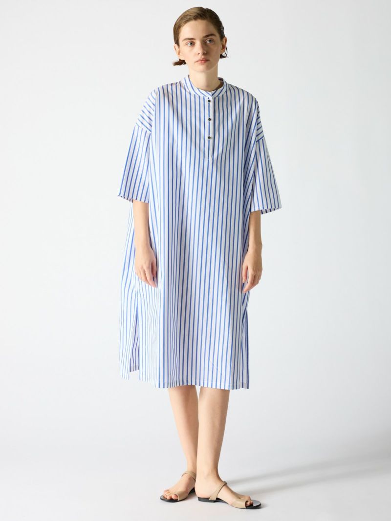 60タイプライターを使用したストライプスタンドカラーシャツワンピースです。爽やかなストライプが印象的。腕を通しやすい袖幅、サイドスリットを施した裾は前後差を付けた動きのあるデザインで清涼感を体感していただける1枚。ネックストライプパターンの首元は頭を通しやすいフロント3つボタンを仕様。広がりはないシルエットですが透け感があるのでパンツと合わせたコーディネートがお勧めです。