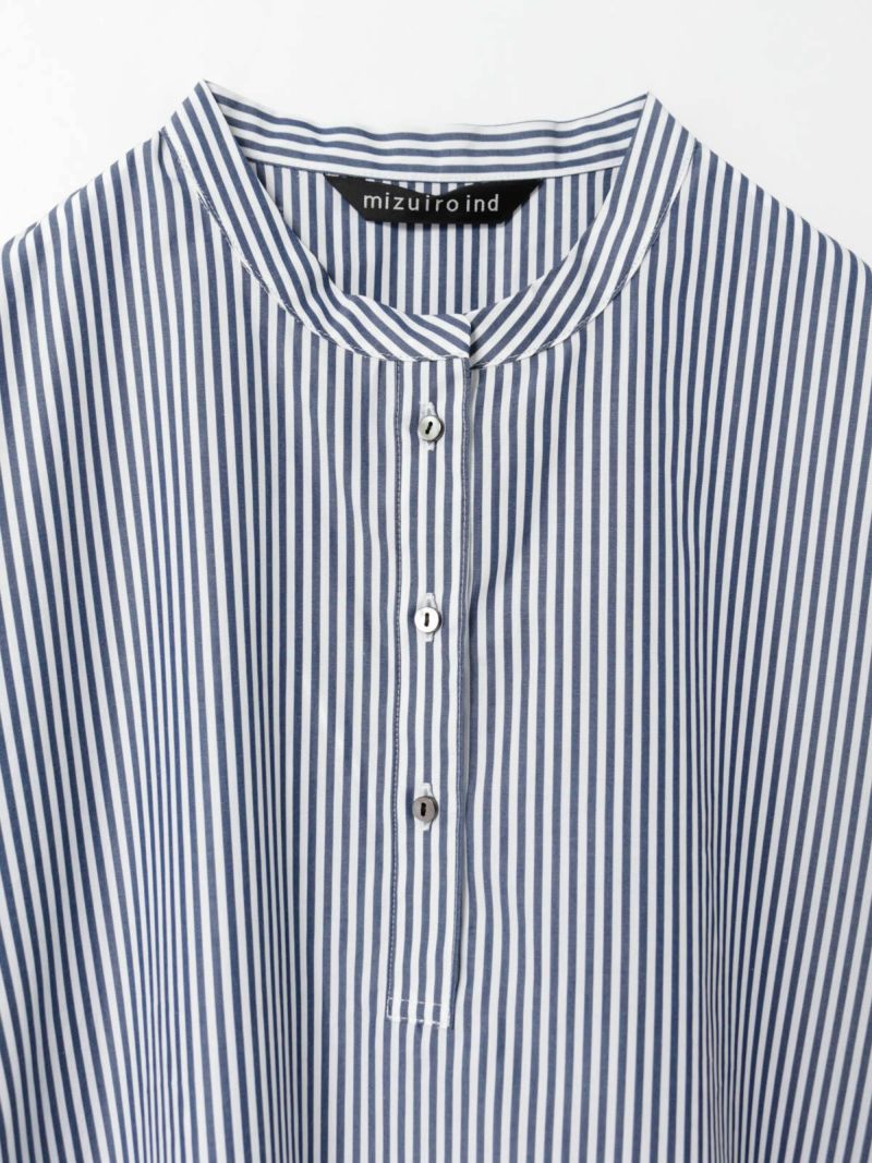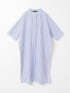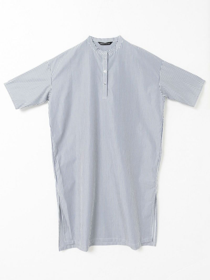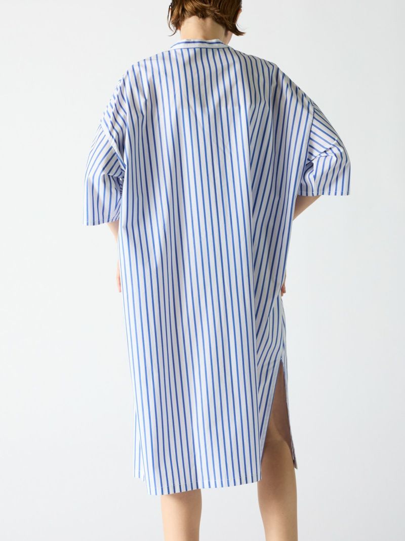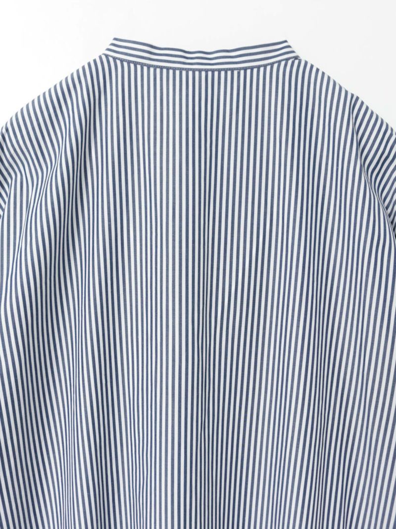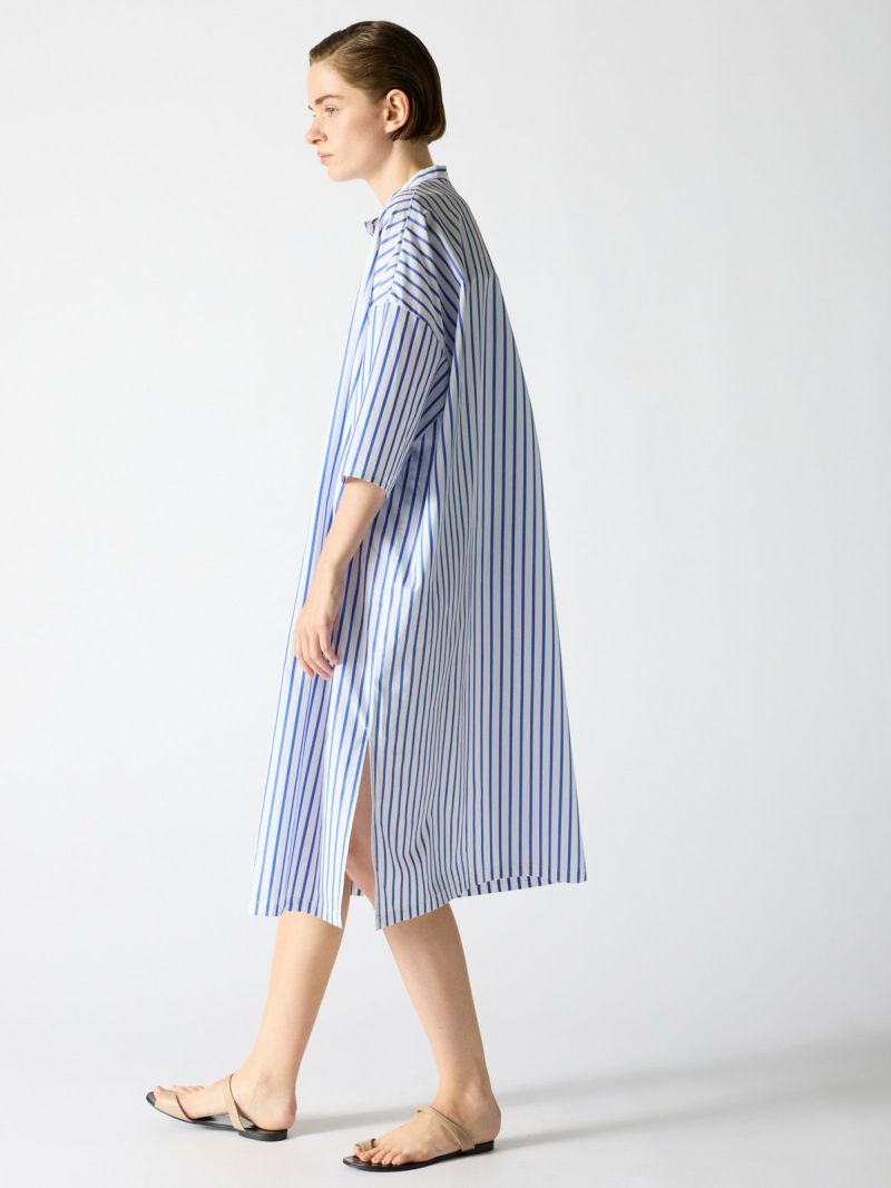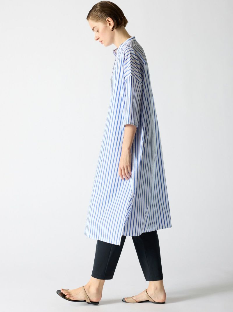 60タイプライターを使用したストライプスタンドカラーシャツワンピースです。爽やかなストライプが印象的。腕を通しやすい袖幅、サイドスリットを施した裾は前後差を付けた動きのあるデザインで清涼感を体感していただける1枚。ネックストライプパターンの首元は頭を通しやすいフロント3つボタンを仕様。広がりはないシルエットですが透け感があるのでパンツと合わせたコーディネートがお勧めです。