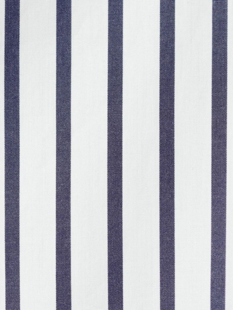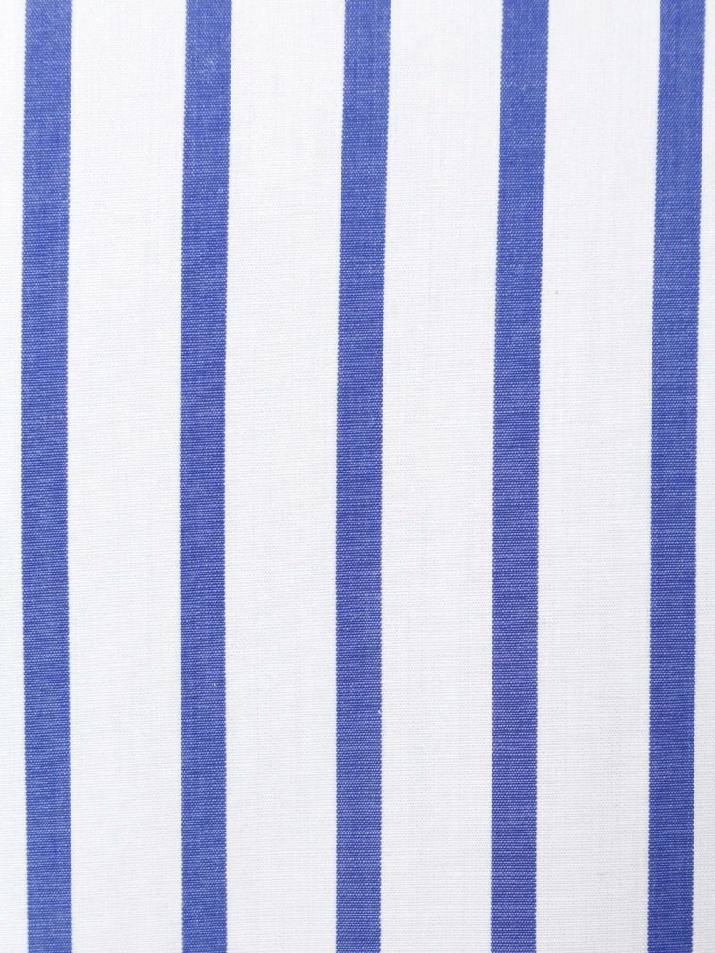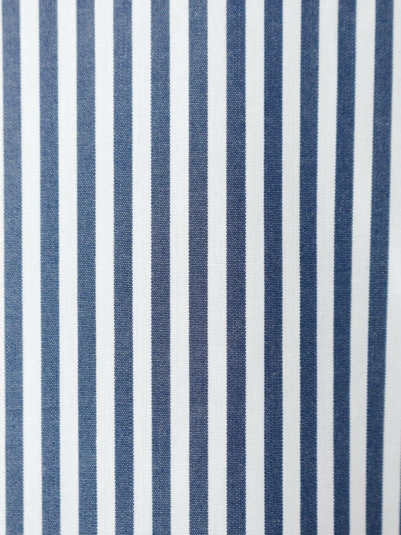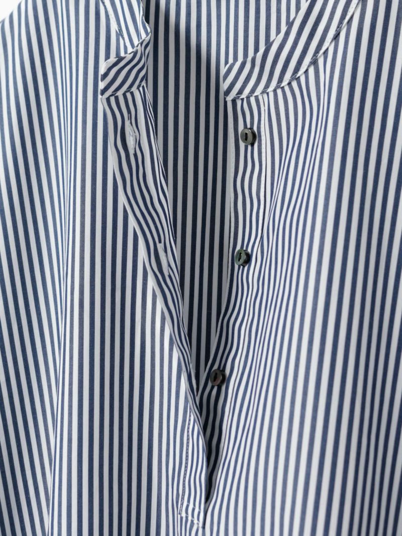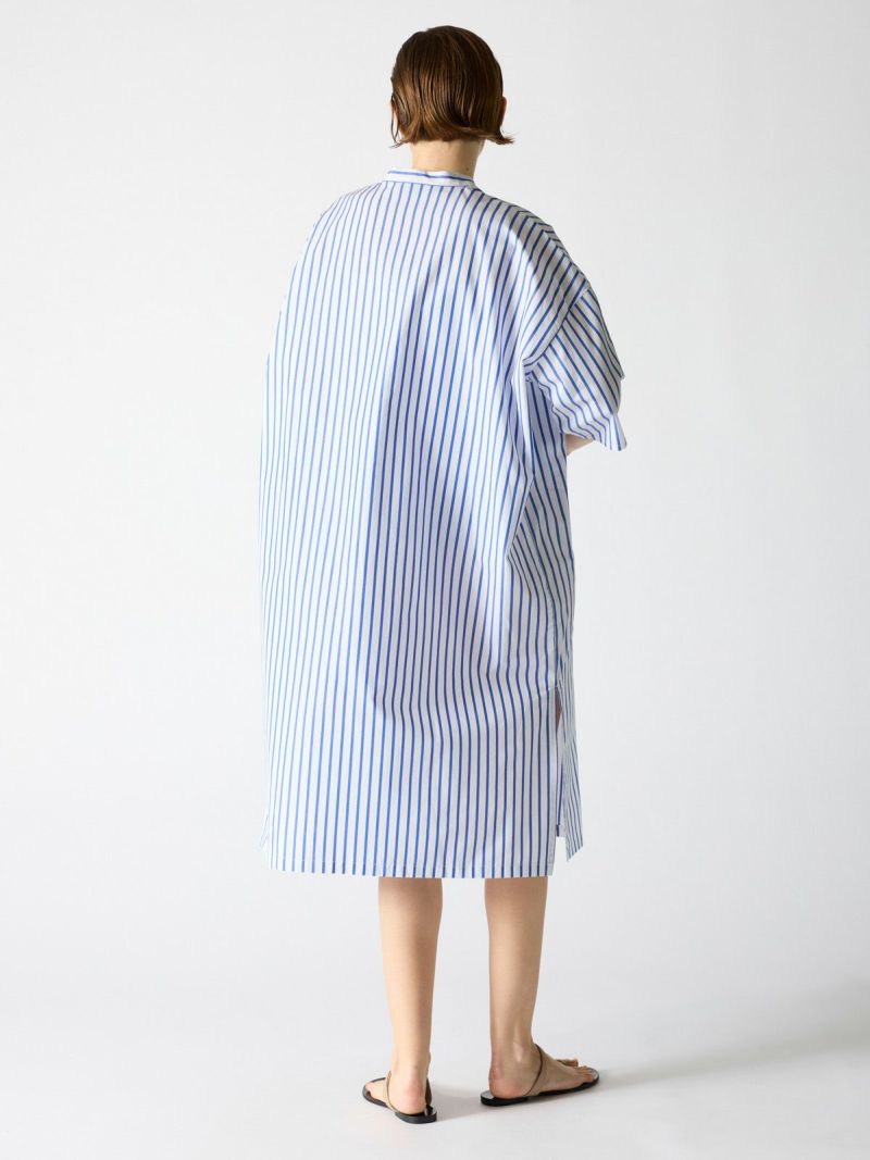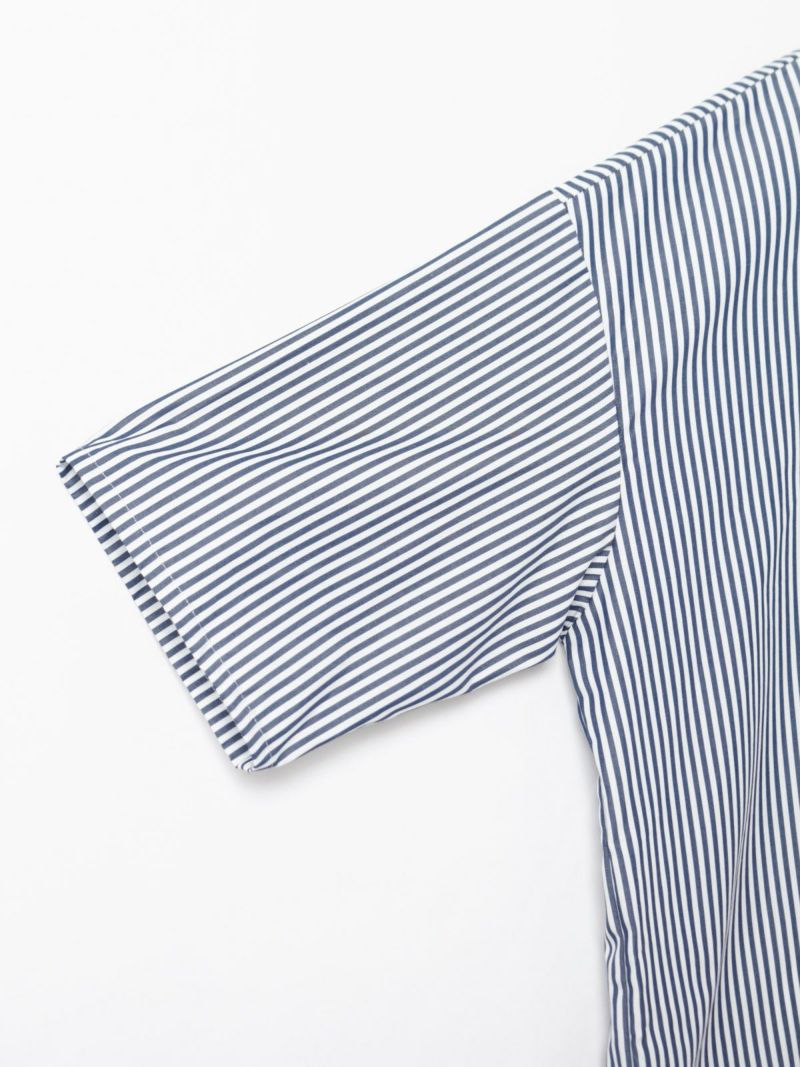 60タイプライターを使用したストライプスタンドカラーシャツワンピースです。爽やかなストライプが印象的。腕を通しやすい袖幅、サイドスリットを施した裾は前後差を付けた動きのあるデザインで清涼感を体感していただける1枚。ネックストライプパターンの首元は頭を通しやすいフロント3つボタンを仕様。広がりはないシルエットですが透け感があるのでパンツと合わせたコーディネートがお勧めです。
