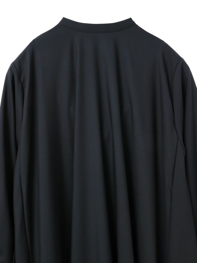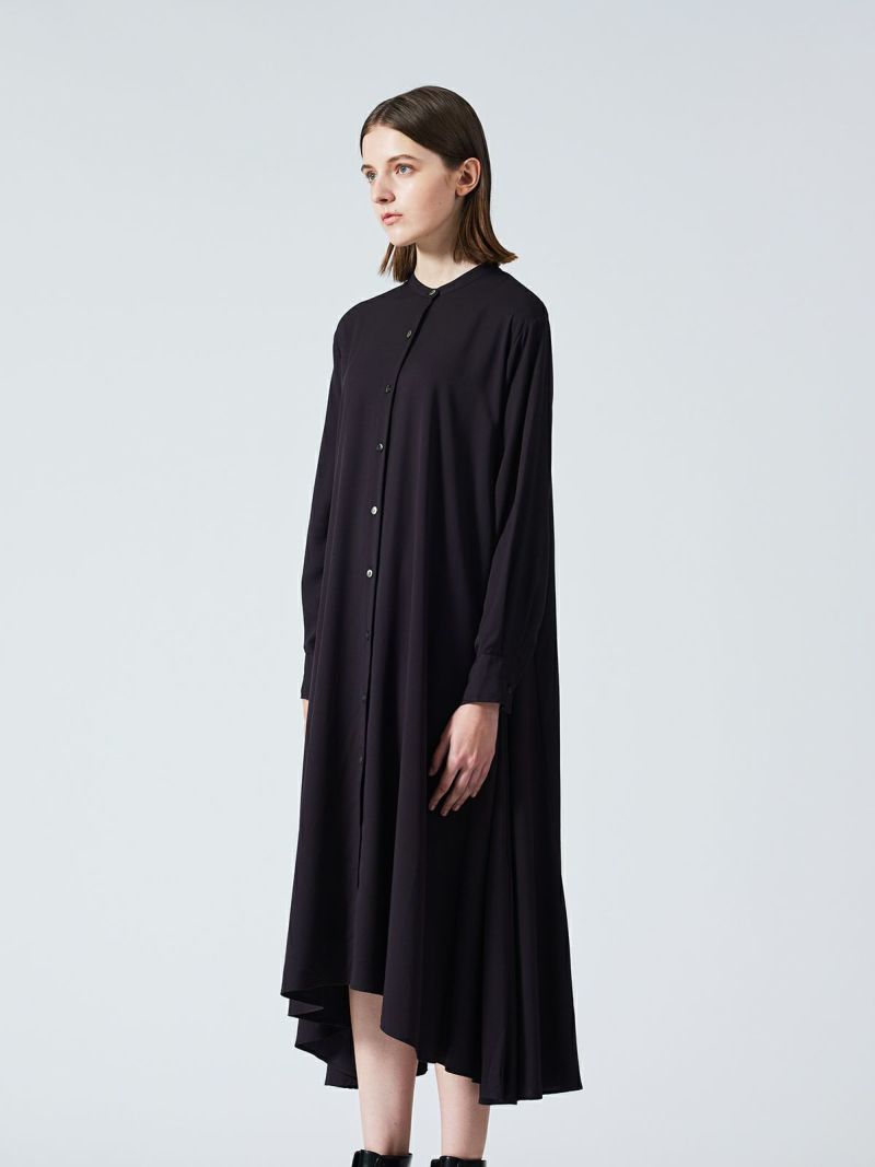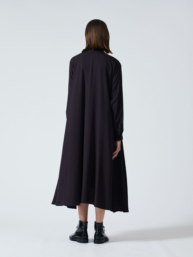 mizuiro ind定番のデザインで落ち感がきれいなT/Rスタンドカラーフレアシャツワンピースです。スッキリとしたスタンドカラーと綺麗に広がりのあるフレアラインが魅力的。若干の前後差を付けた裾のラインでパンツを穿いてコーディネートしても良く、フロントボタンを外して羽織でコーディネートしても素敵です。オケージョン対応も可能。長く人気のある1枚です。