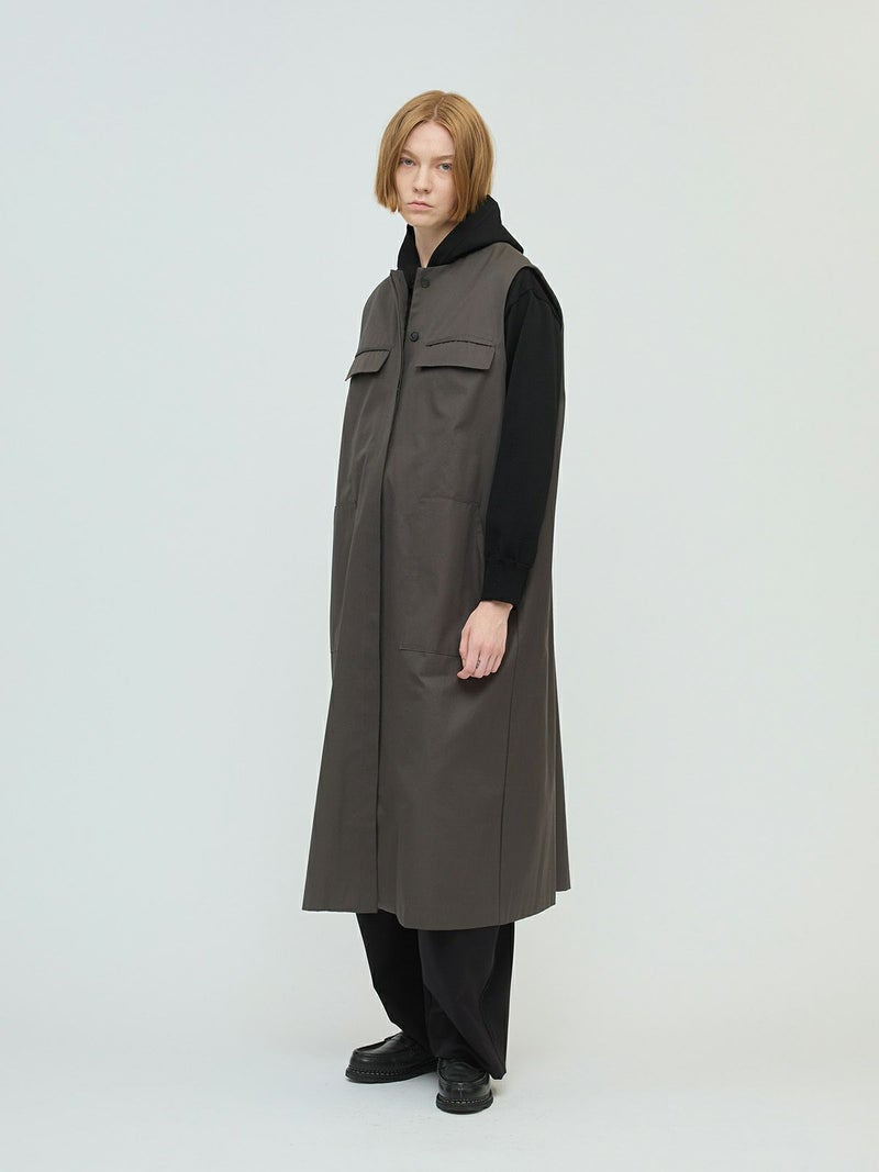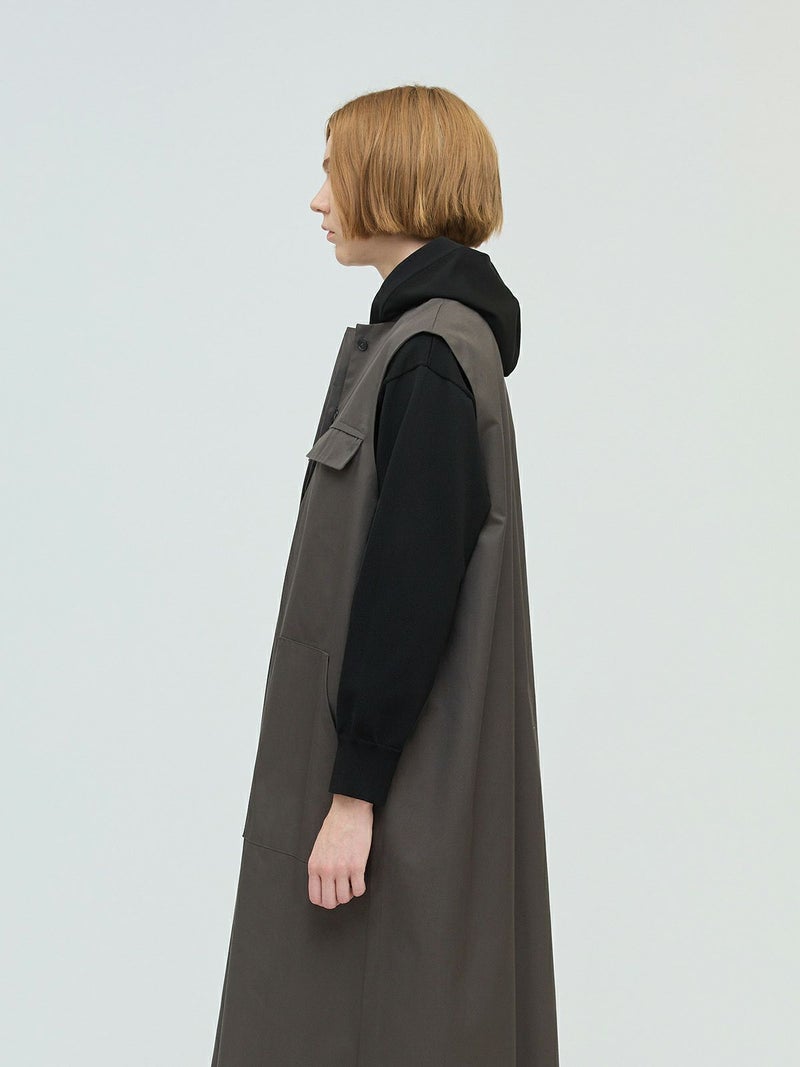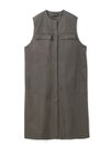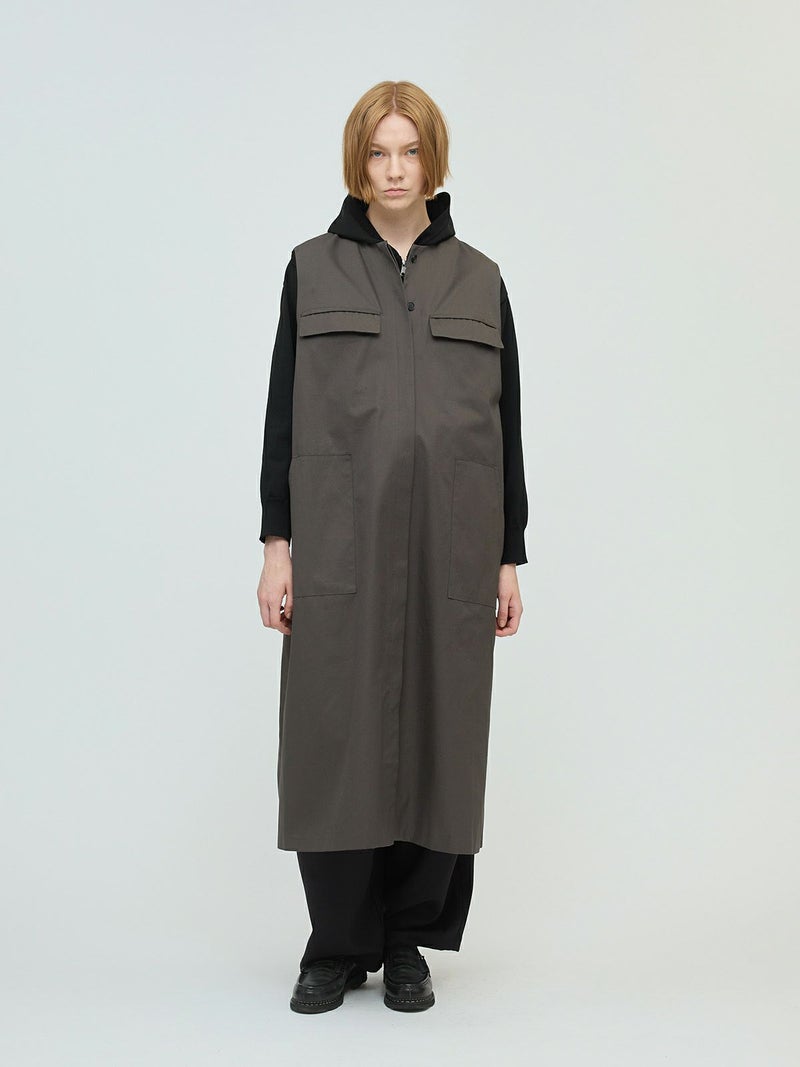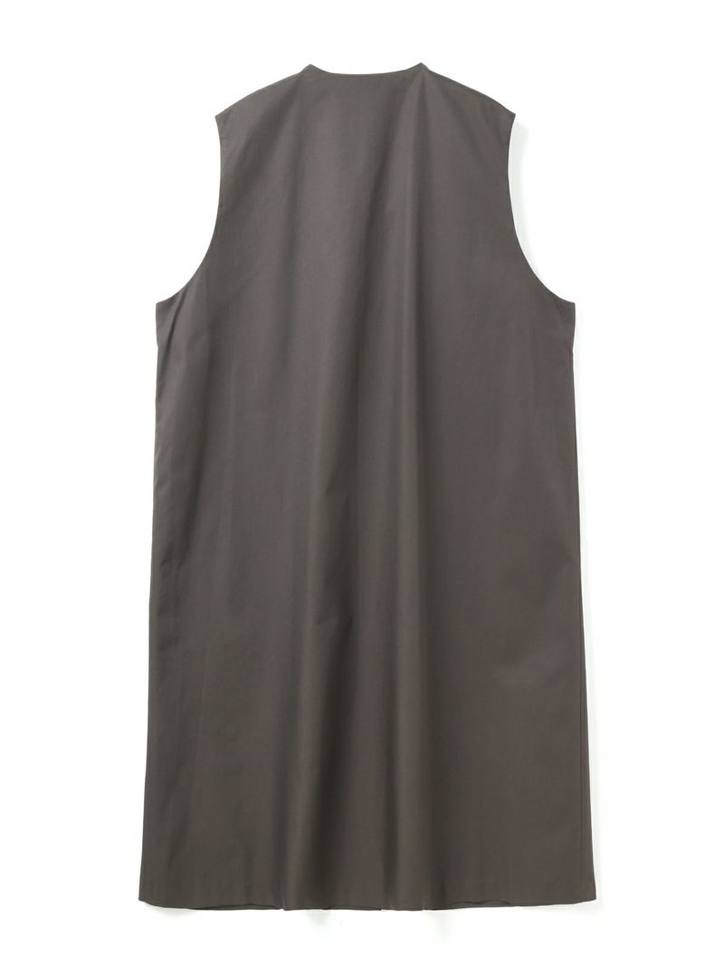 メンズライクなワーク調のデザインが特徴のポケット付クルーネックロングジレ。ジャケットの袖を落としたようなデザインを表現しました。長めの丈にしており、ワンピースでもジレとしても着こなしができる1枚です。フロントは比翼仕立てにしているのでよりすっきりとしています。しっかりとしたハリのある生地感で胸に蓋付ポケットが二つ、手がすっぽりと入る大き目のポケットが付いています。長めの丈ですが、小柄な方にも着こなせるロングジレです。